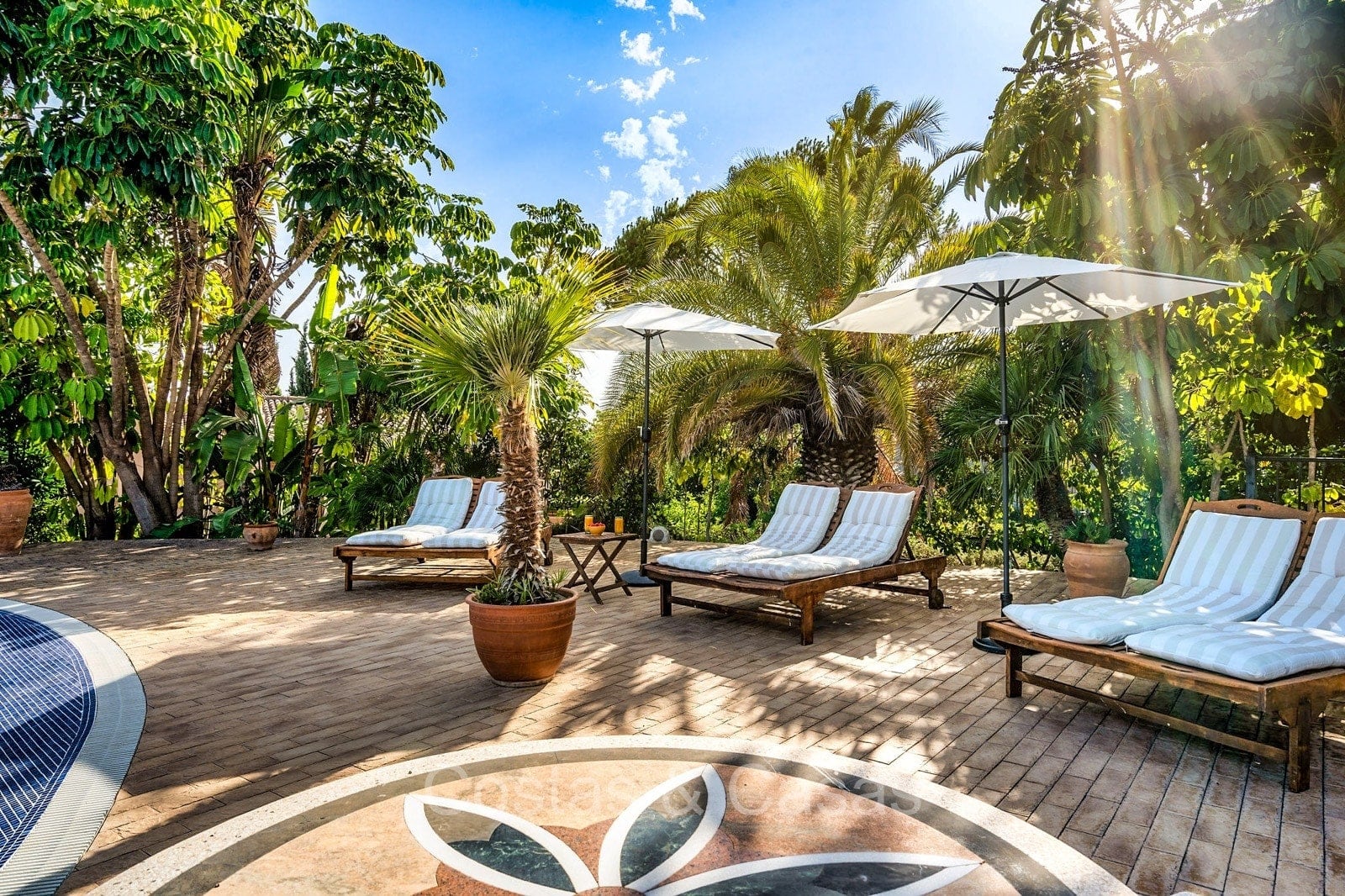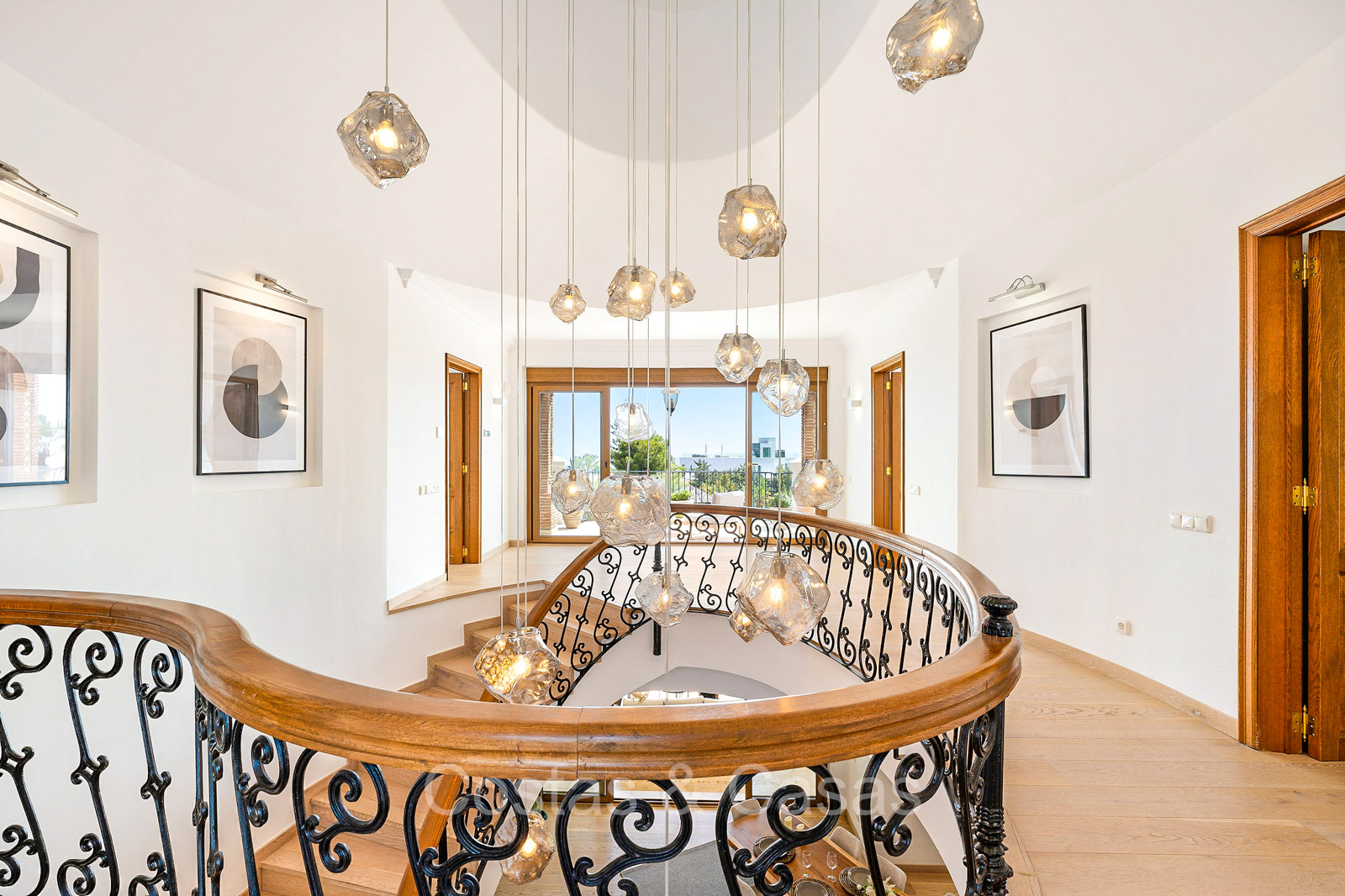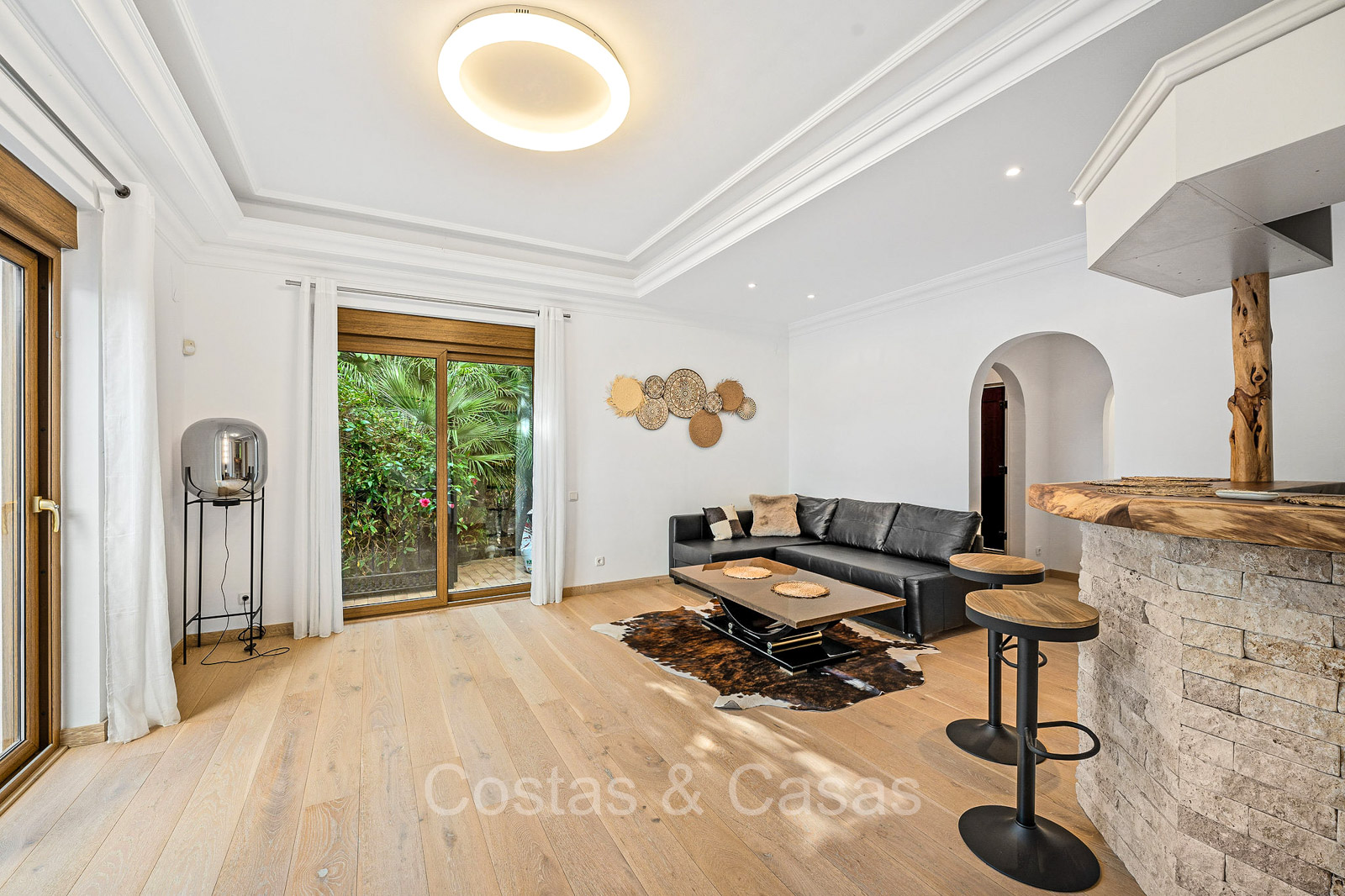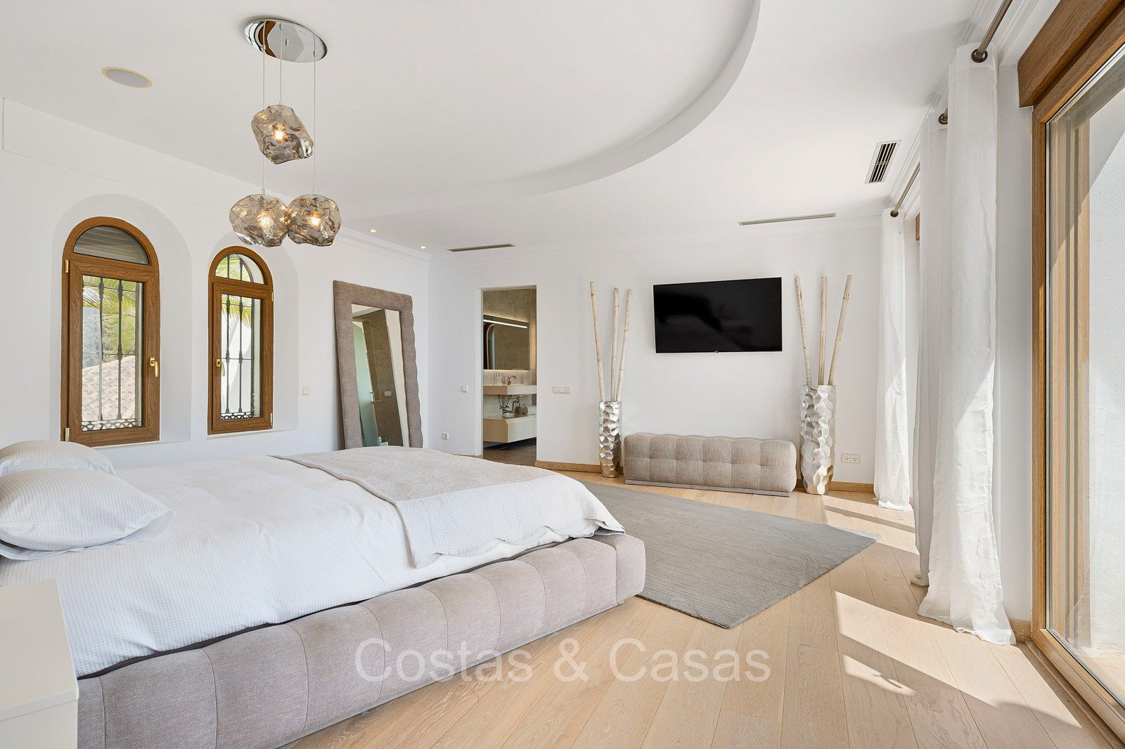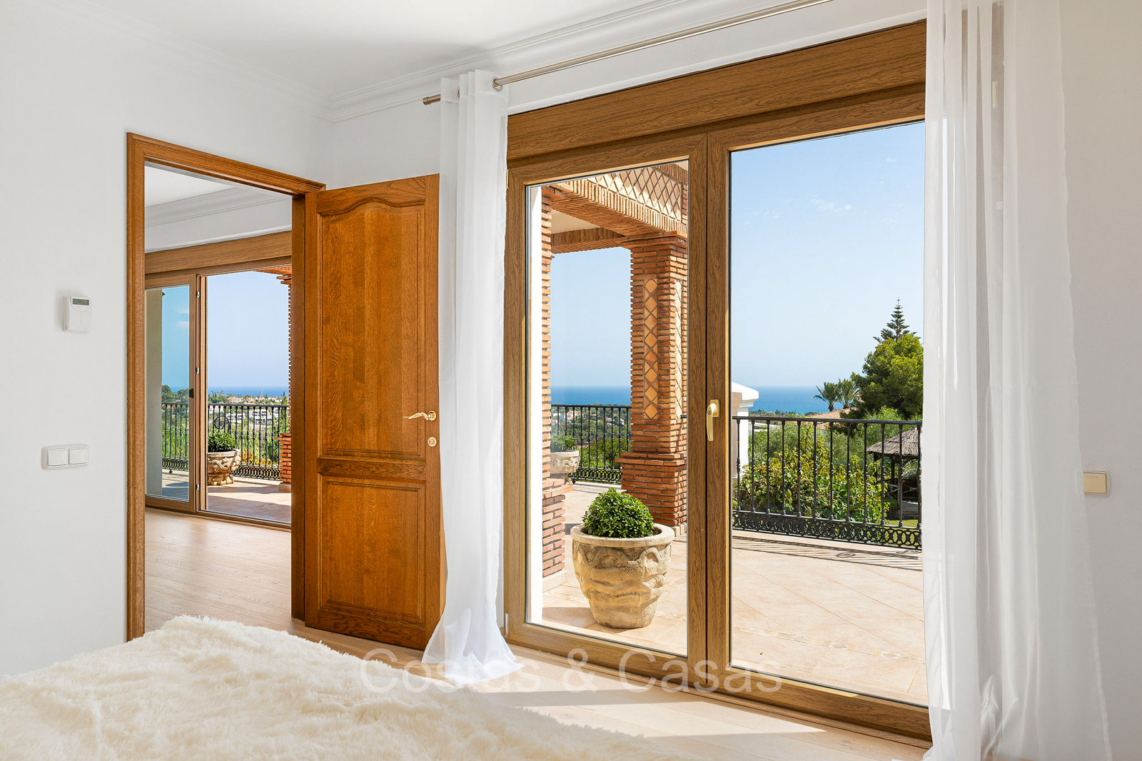 Villa individuelle de style architectural andalou traditionnel. Soigneusement rénovée en 2020. De hautes fenêtres coulissantes s'ouvrent sur les espaces extérieurs et génèrent également beaucoup de lumière naturelle. En entrant, vous êtes accueilli par un grand et charmant espace avec un escalier orné et un plafond à double hauteur qui monte élégamment jusqu'à l'étage supérieur. Salon ouvert et chaleureux avec cheminée. Coin repas intégré. Cuisine sur mesure pratique avec un îlot de cuisson central où vous pourrez vous asseoir. Buanderie avec un réfrigérateur. 6 chambres, 6 salles de bains et 2 toilettes séparées. La suite principale est située à l'étage supérieur et bénéficie d'une grande salle de bains, d'un dressing et d'un accès à la vaste terrasse. Une petite pièce polyvalente à l'étage supérieur peut être librement aménagée en bureau privé ou en bureau. Planchers en bois. Logement intérieur avec accès privé. Buanderie. Garage intérieur pour 2 voitures. Parking supplémentaire pour 3 à 4 voitures.