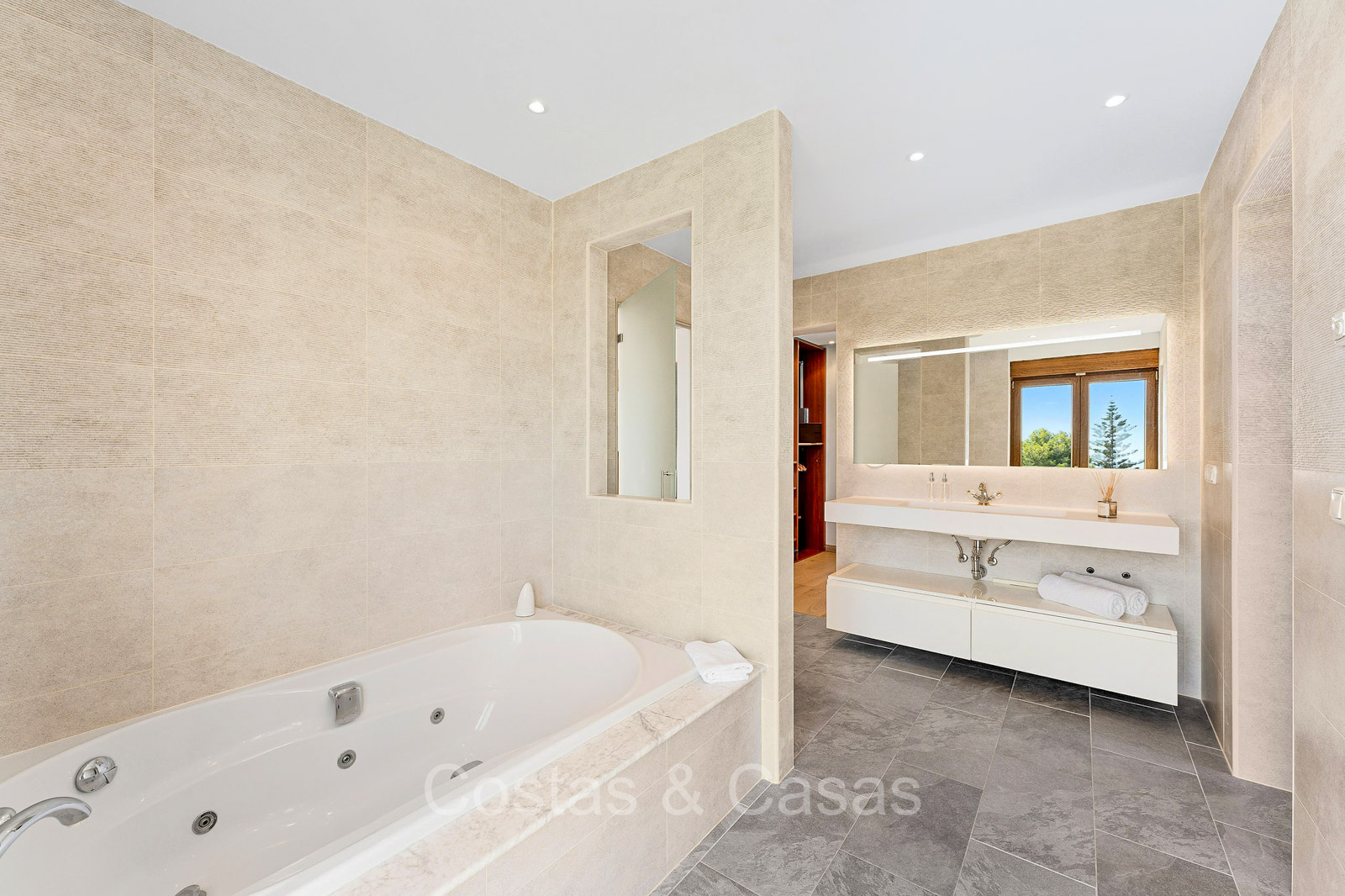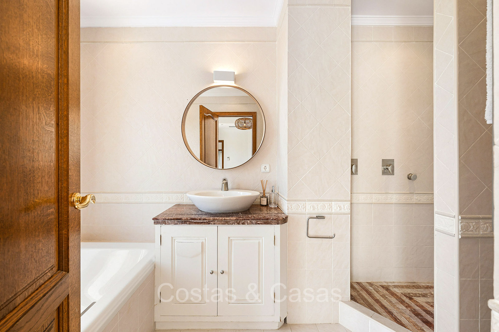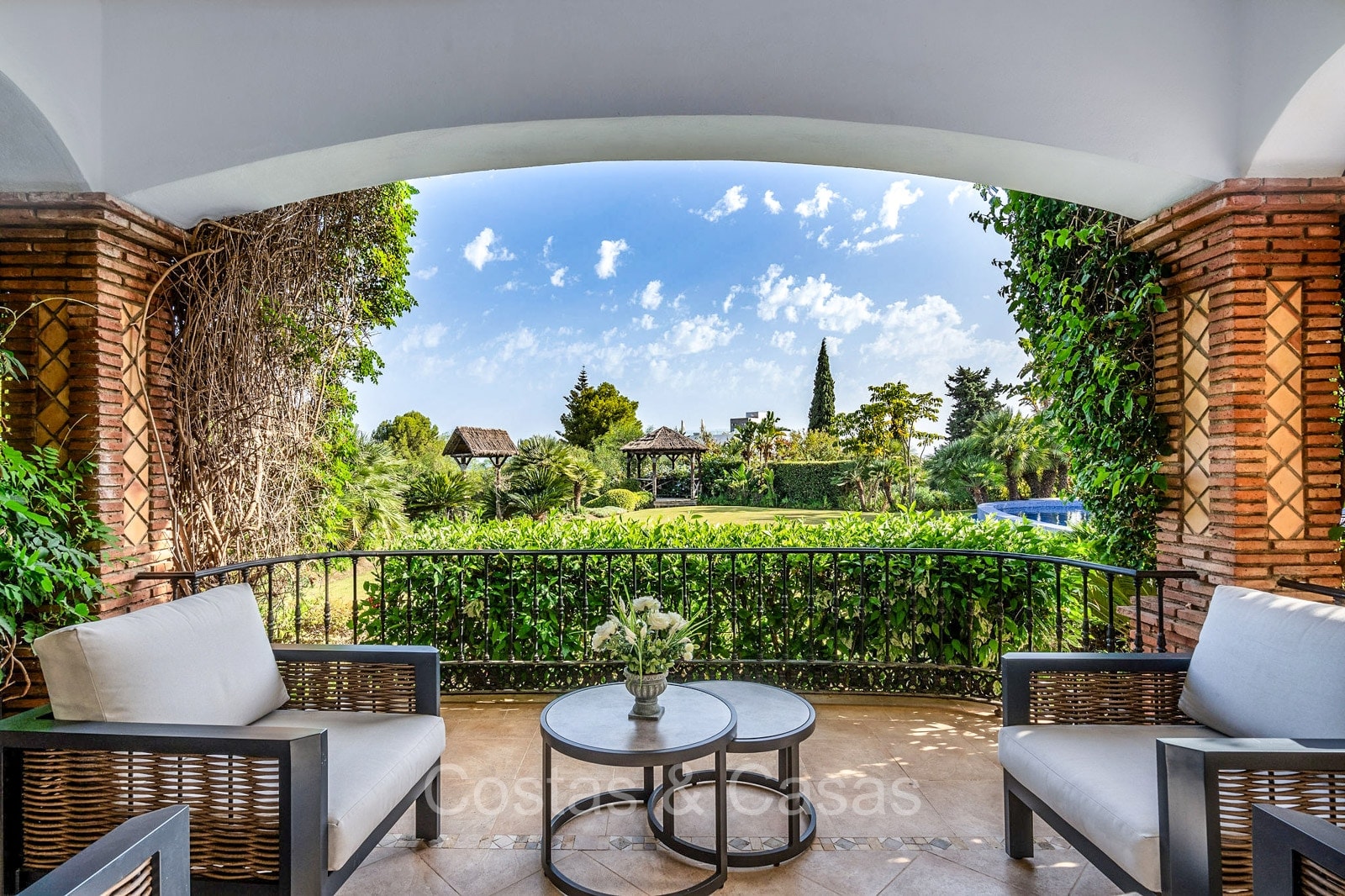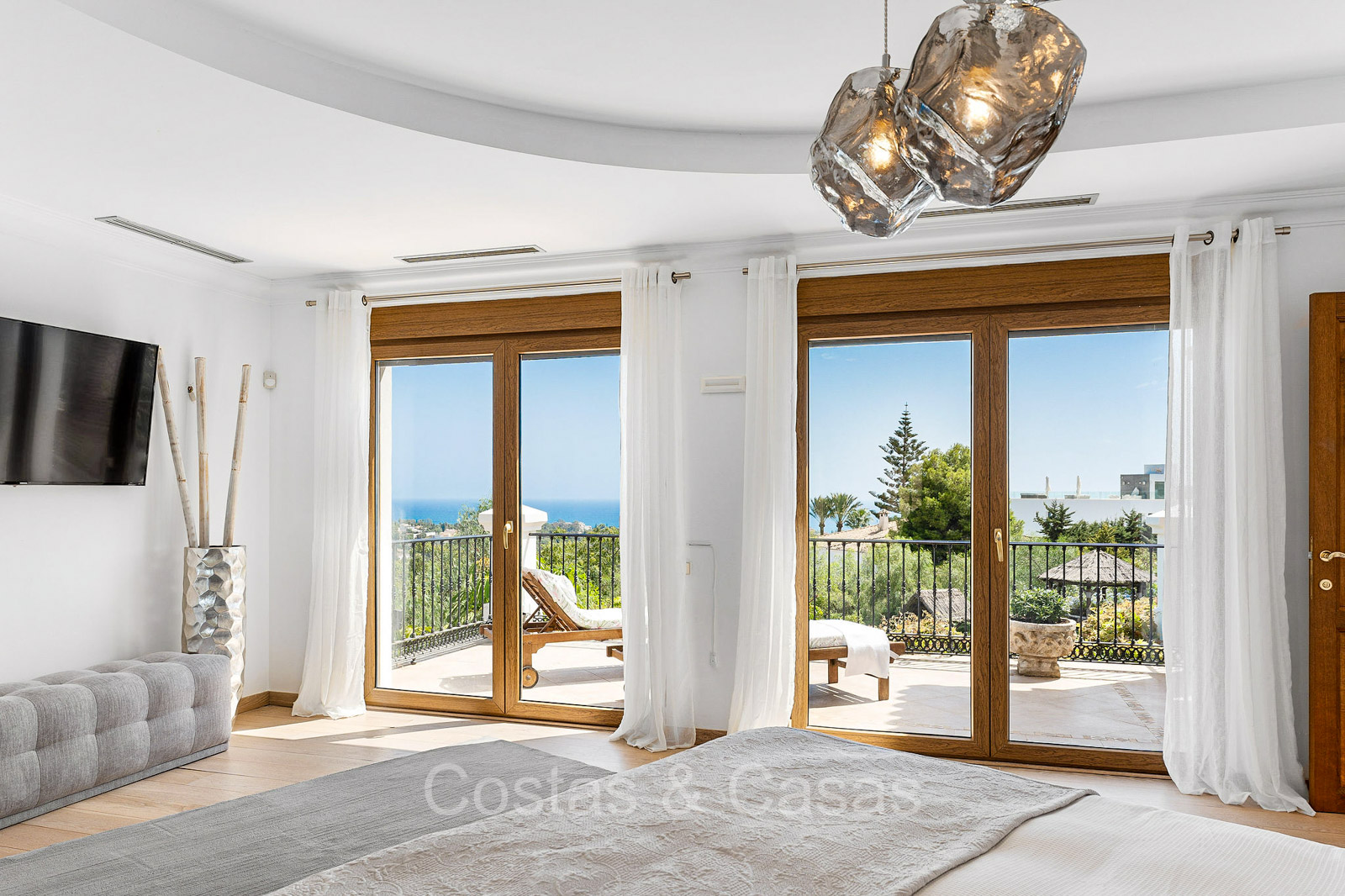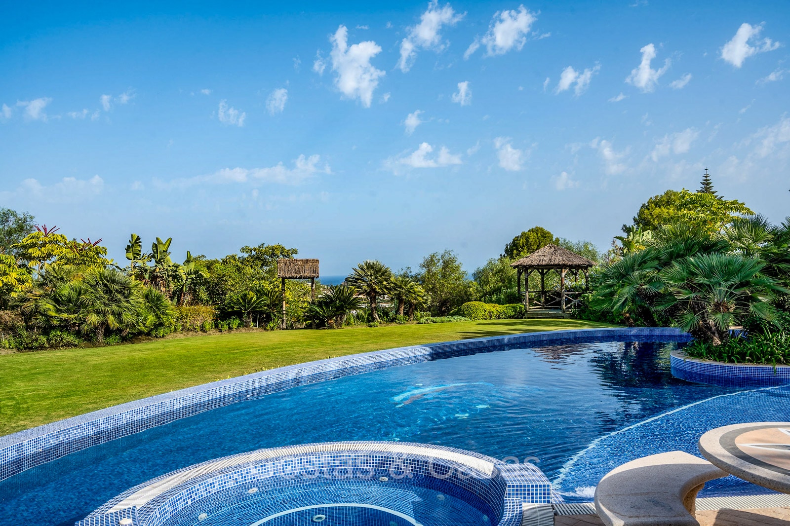 Villa individuelle de style architectural andalou traditionnel. Soigneusement rénovée en 2020. De hautes fenêtres coulissantes s'ouvrent sur les espaces extérieurs et génèrent également beaucoup de lumière naturelle. En entrant, vous êtes accueilli par un grand et charmant espace avec un escalier orné et un plafond à double hauteur qui monte élégamment jusqu'à l'étage supérieur. Salon ouvert et chaleureux avec cheminée. Coin repas intégré. Cuisine sur mesure pratique avec un îlot de cuisson central où vous pourrez vous asseoir. Buanderie avec un réfrigérateur. 6 chambres, 6 salles de bains et 2 toilettes séparées. La suite principale est située à l'étage supérieur et bénéficie d'une grande salle de bains, d'un dressing et d'un accès à la vaste terrasse. Une petite pièce polyvalente à l'étage supérieur peut être librement aménagée en bureau privé ou en bureau. Planchers en bois. Logement intérieur avec accès privé. Buanderie. Garage intérieur pour 2 voitures. Parking supplémentaire pour 3 à 4 voitures.