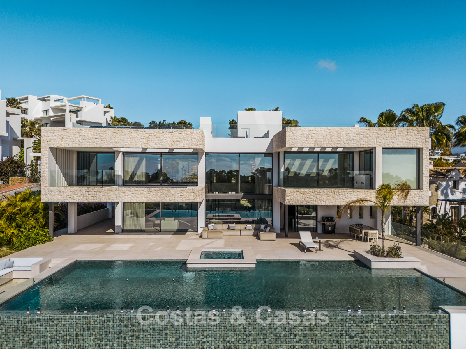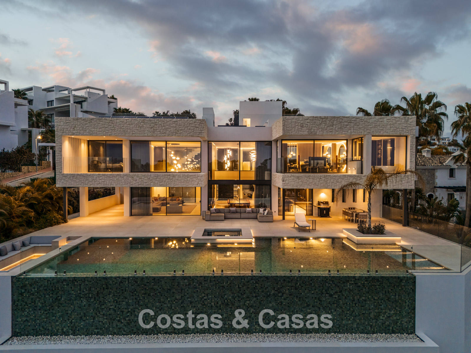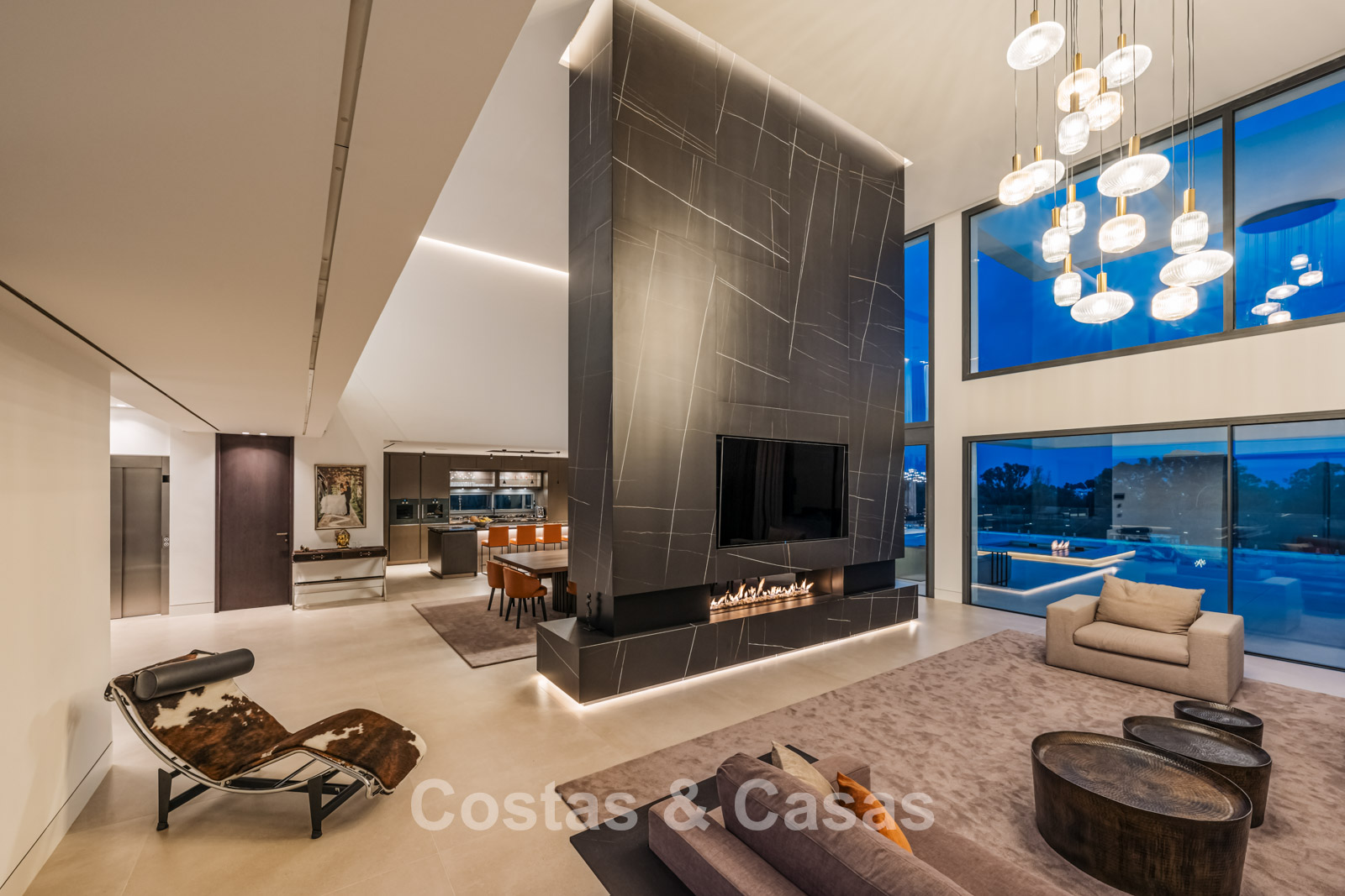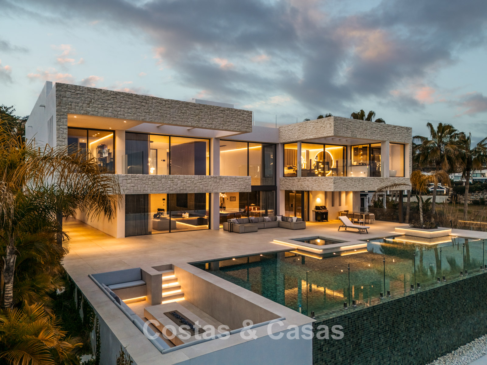 Autres caractéristiques: Ascenseur à tous les étages. Climatisation. Chauffage par le sol. Cheminée. Panneaux solaires. Système domotique avancé. Système surround stéréo Dolby. Armoires intégrées. Balustrades en verre. Éclairage LED intérieur et extérieur.