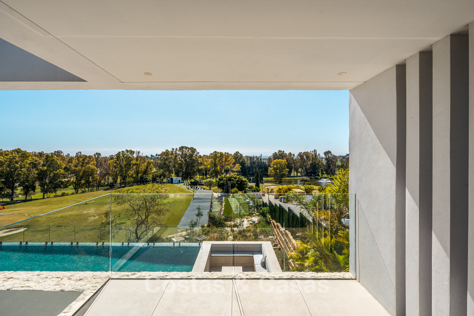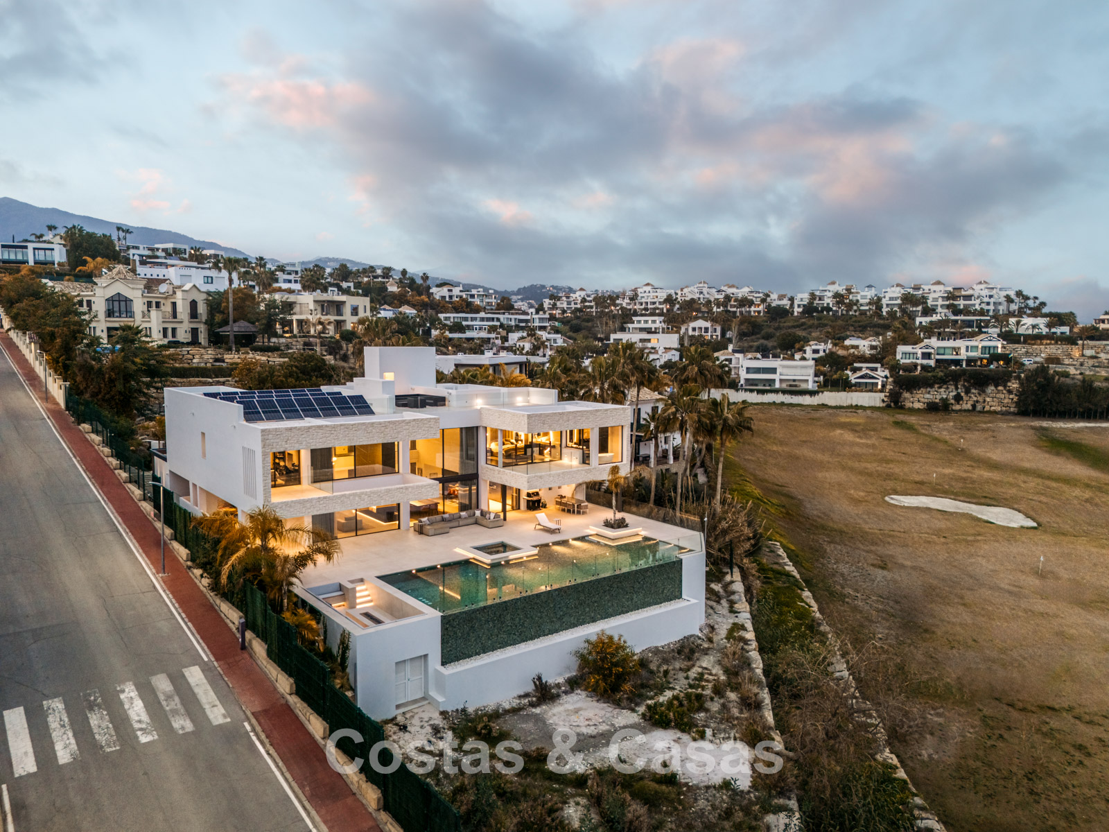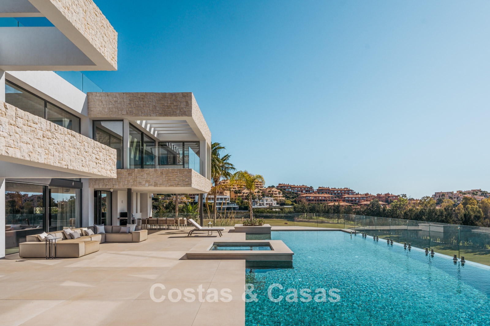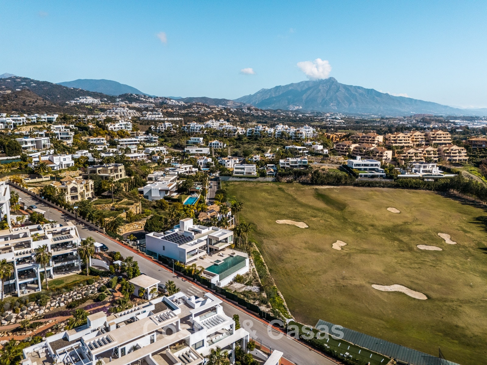 Située sur un terrain surélevé, directement sur le terrain de golf. Un extérieur paysager de haute qualité avec un jardin nécessitant peu d'entretien et une grande piscine privée spectaculaire avec revêtement en mosaïque. Jacuzzi intégré. Terrasses spacieuses avec zones ensoleillées et ombragées, équipées d'un coin barbecue et d'un lounge. Un lounge en contrebas. Un vaste solarium offre des options de détente. Orientée au sud. Vues panoramiques sur le golf avec lac, sur les majestueuses montagnes et en partie sur la mer Méditerranée.