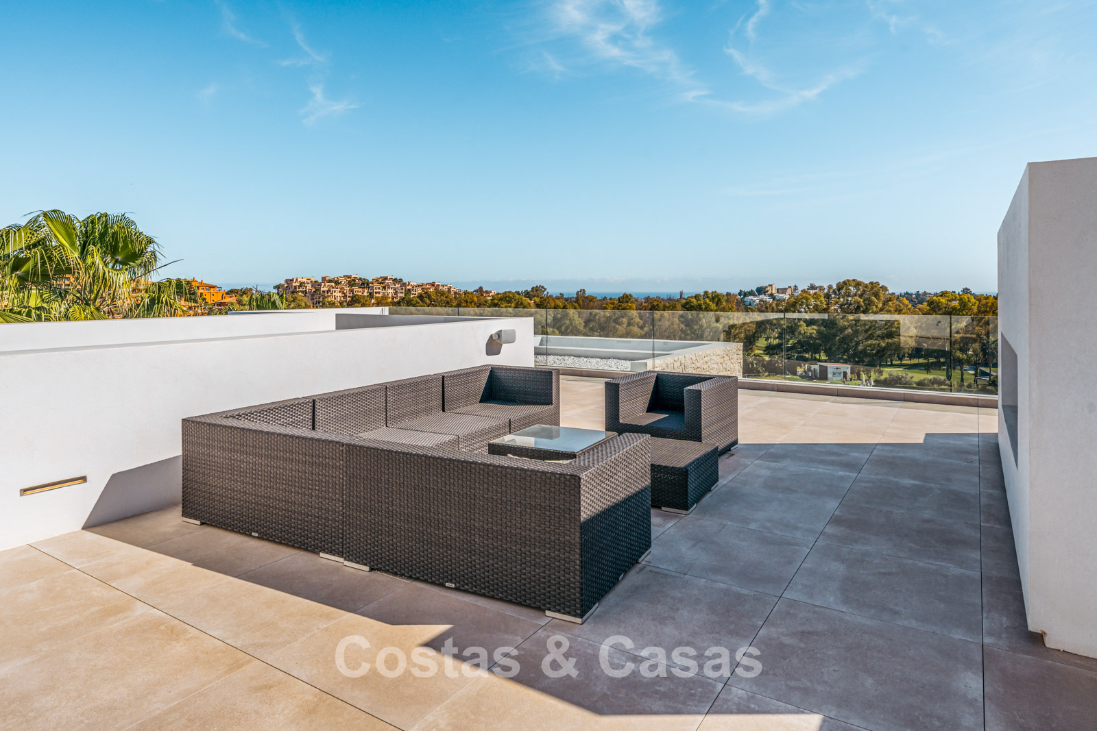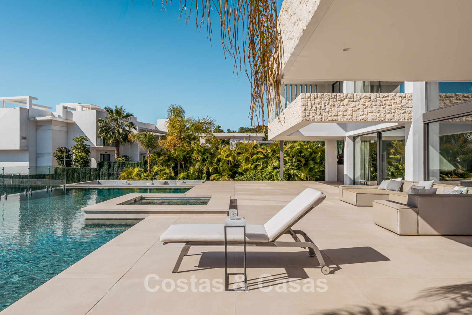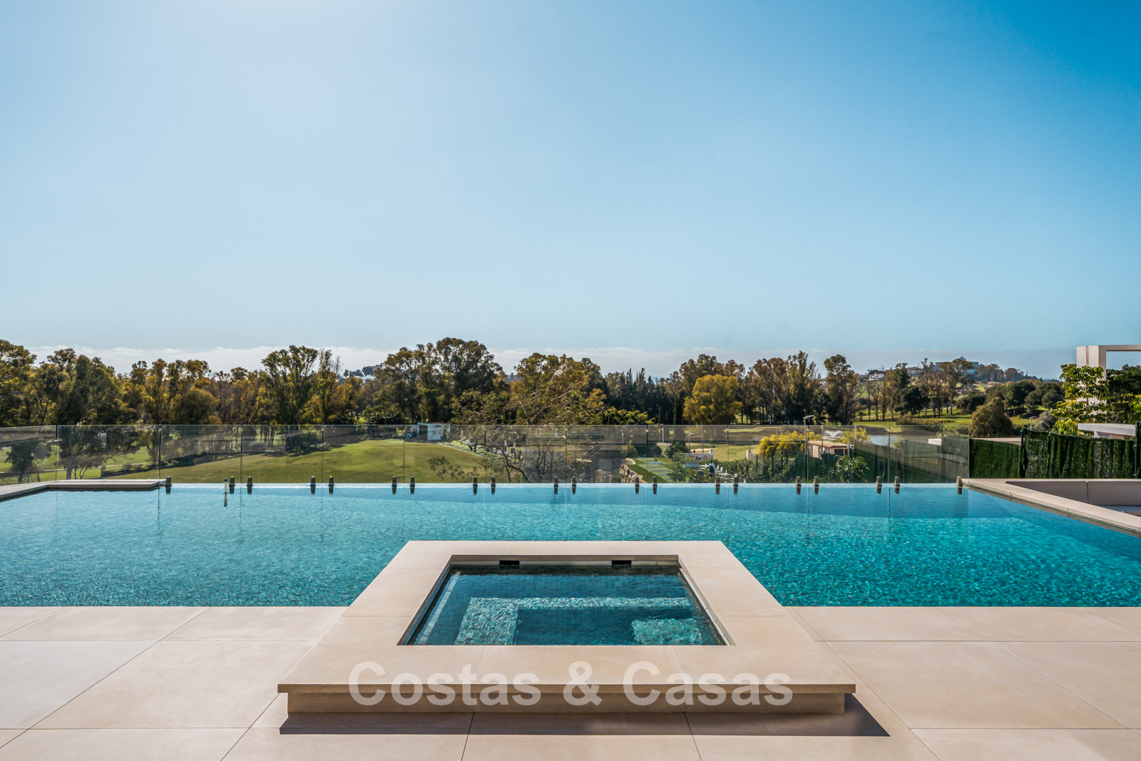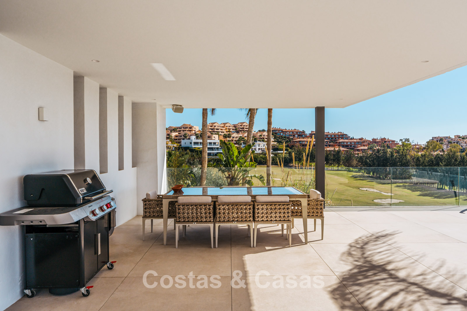 Située sur un terrain surélevé, directement sur le terrain de golf. Un extérieur paysager de haute qualité avec un jardin nécessitant peu d'entretien et une grande piscine privée spectaculaire avec revêtement en mosaïque. Jacuzzi intégré. Terrasses spacieuses avec zones ensoleillées et ombragées, équipées d'un coin barbecue et d'un lounge. Un lounge en contrebas. Un vaste solarium offre des options de détente. Orientée au sud. Vues panoramiques sur le golf avec lac, sur les majestueuses montagnes et en partie sur la mer Méditerranée.