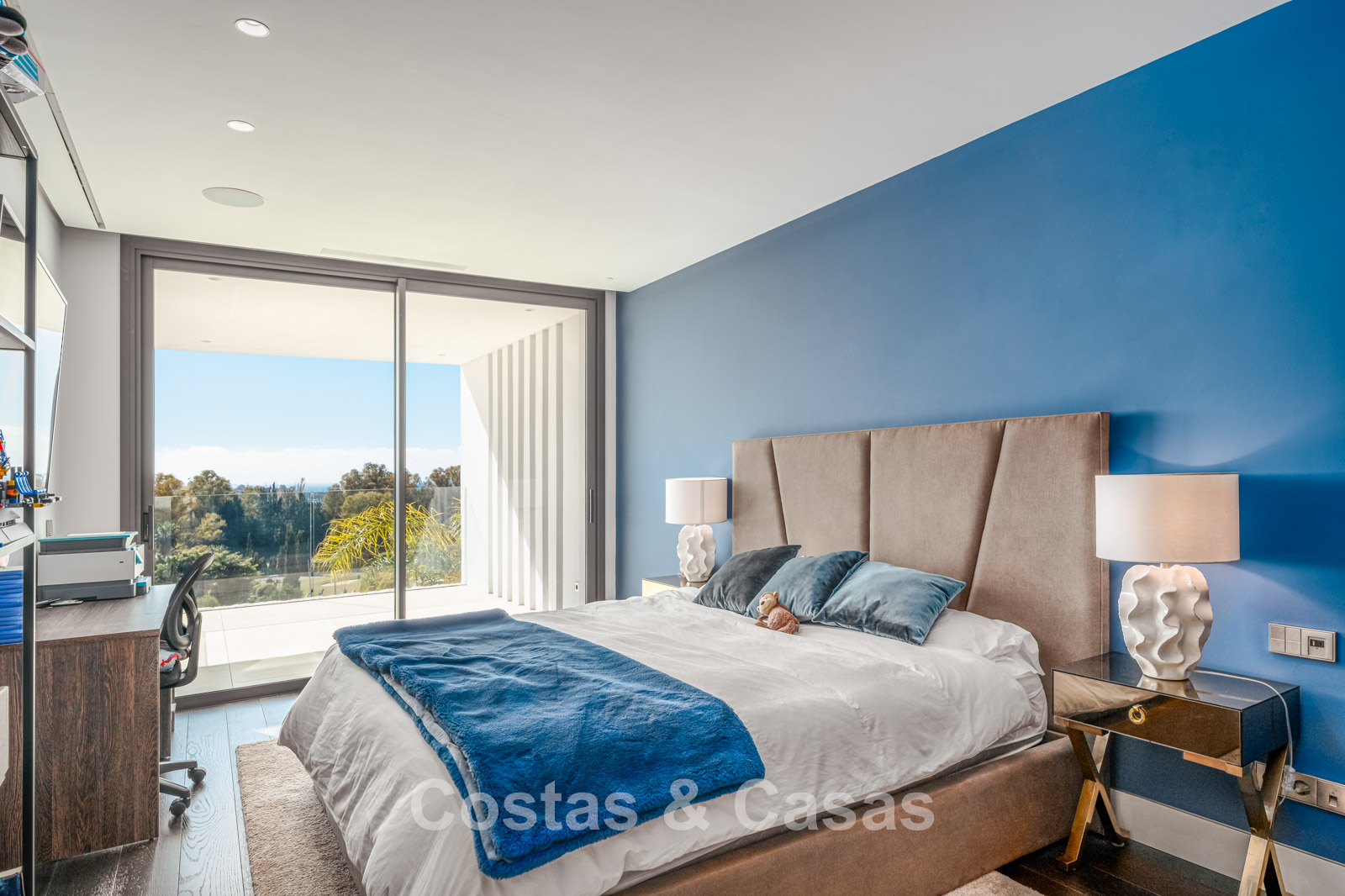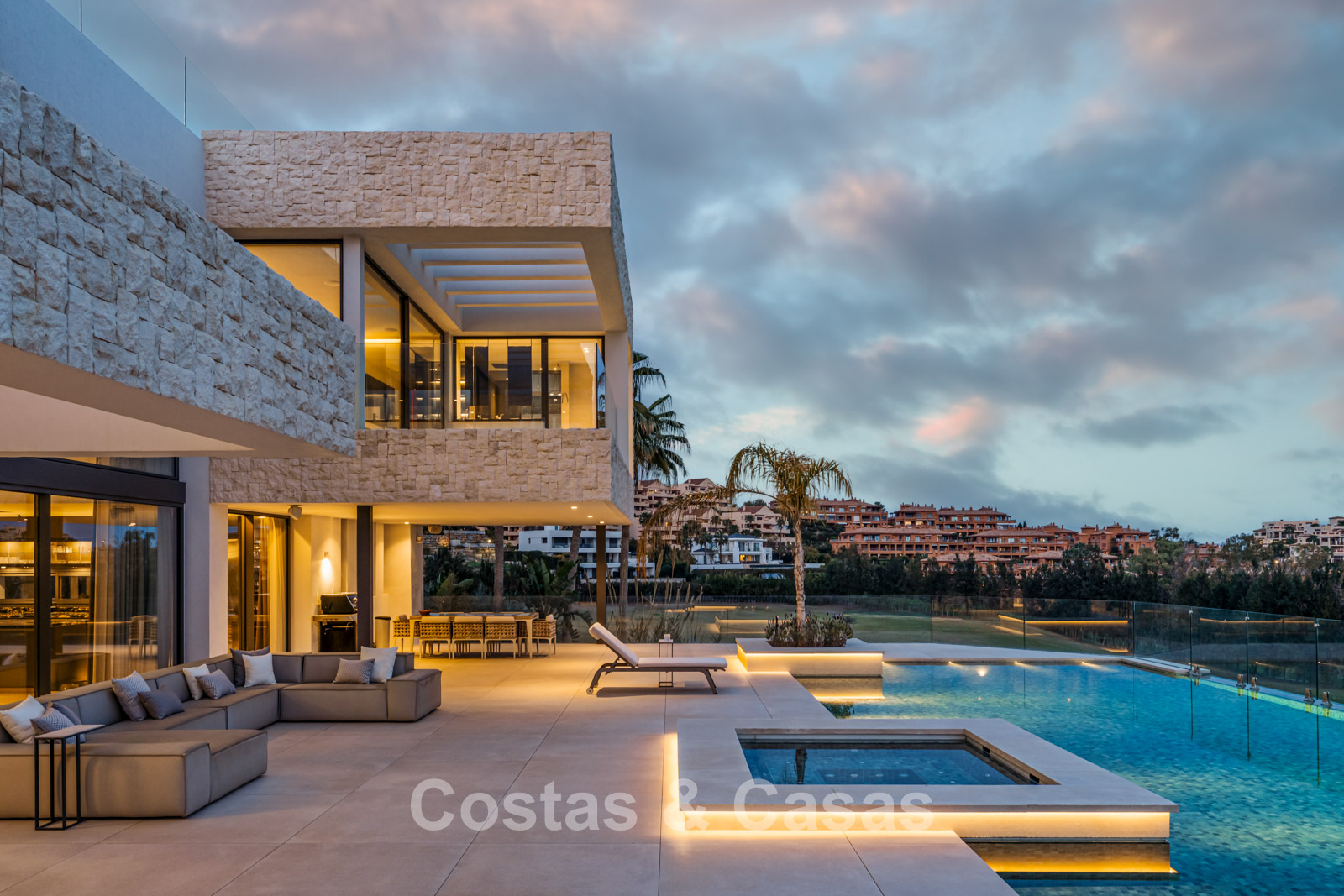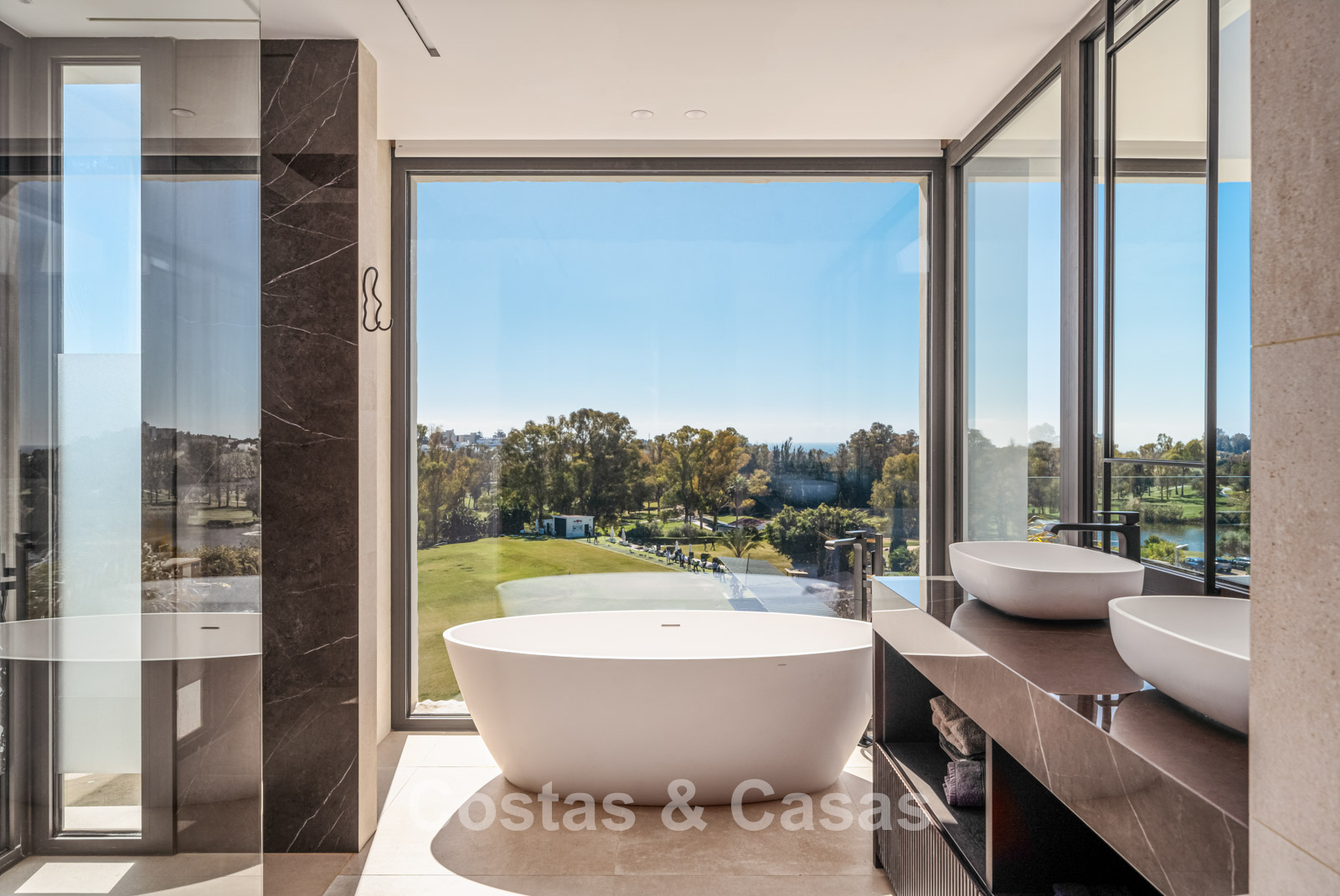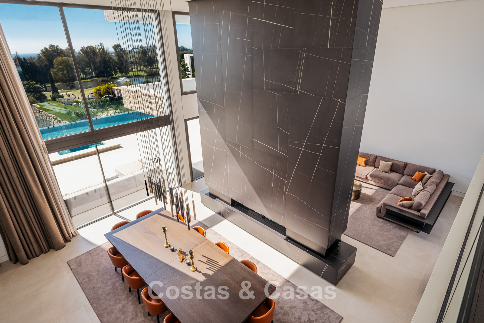 Située sur un terrain surélevé, directement sur le terrain de golf. Un extérieur paysager de haute qualité avec un jardin nécessitant peu d'entretien et une grande piscine privée spectaculaire avec revêtement en mosaïque. Jacuzzi intégré. Terrasses spacieuses avec zones ensoleillées et ombragées, équipées d'un coin barbecue et d'un lounge. Un lounge en contrebas. Un vaste solarium offre des options de détente. Orientée au sud. Vues panoramiques sur le golf avec lac, sur les majestueuses montagnes et en partie sur la mer Méditerranée.