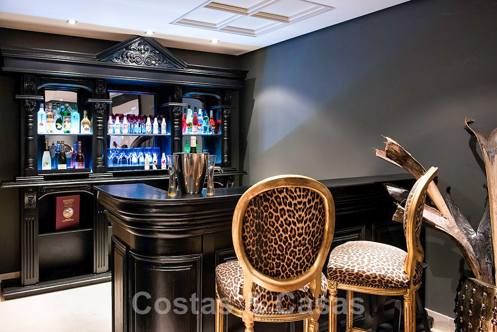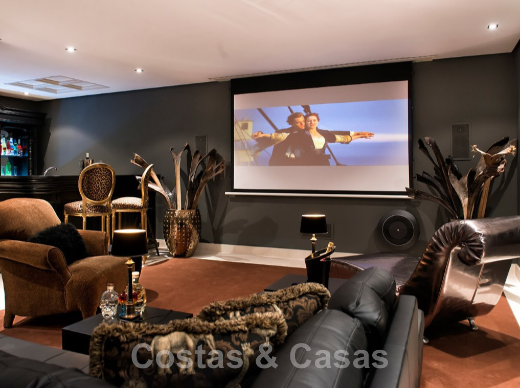 Un espace de détente avec home cinéma et un bar chic.