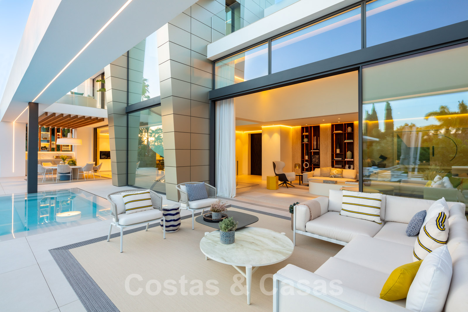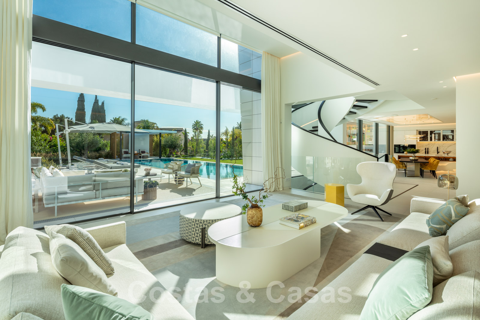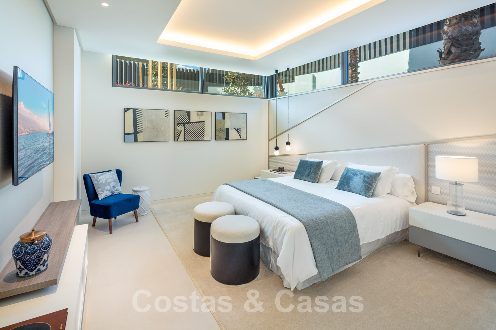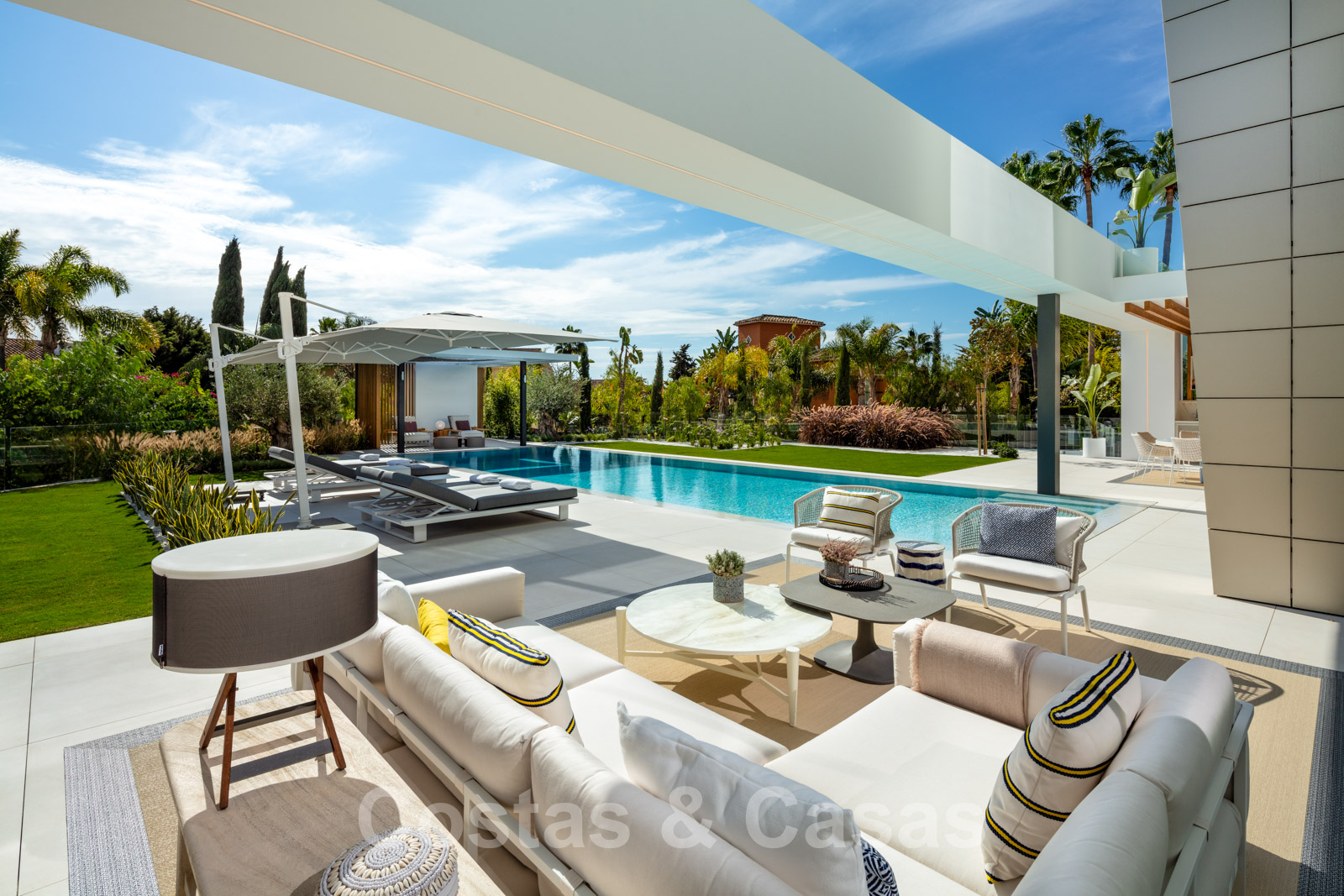 Prête à emménager, nouvelle villa de conception moderne à vendre dans une urbanisation en bord de mer très recherchée, juste à l'est du centre de Marbella