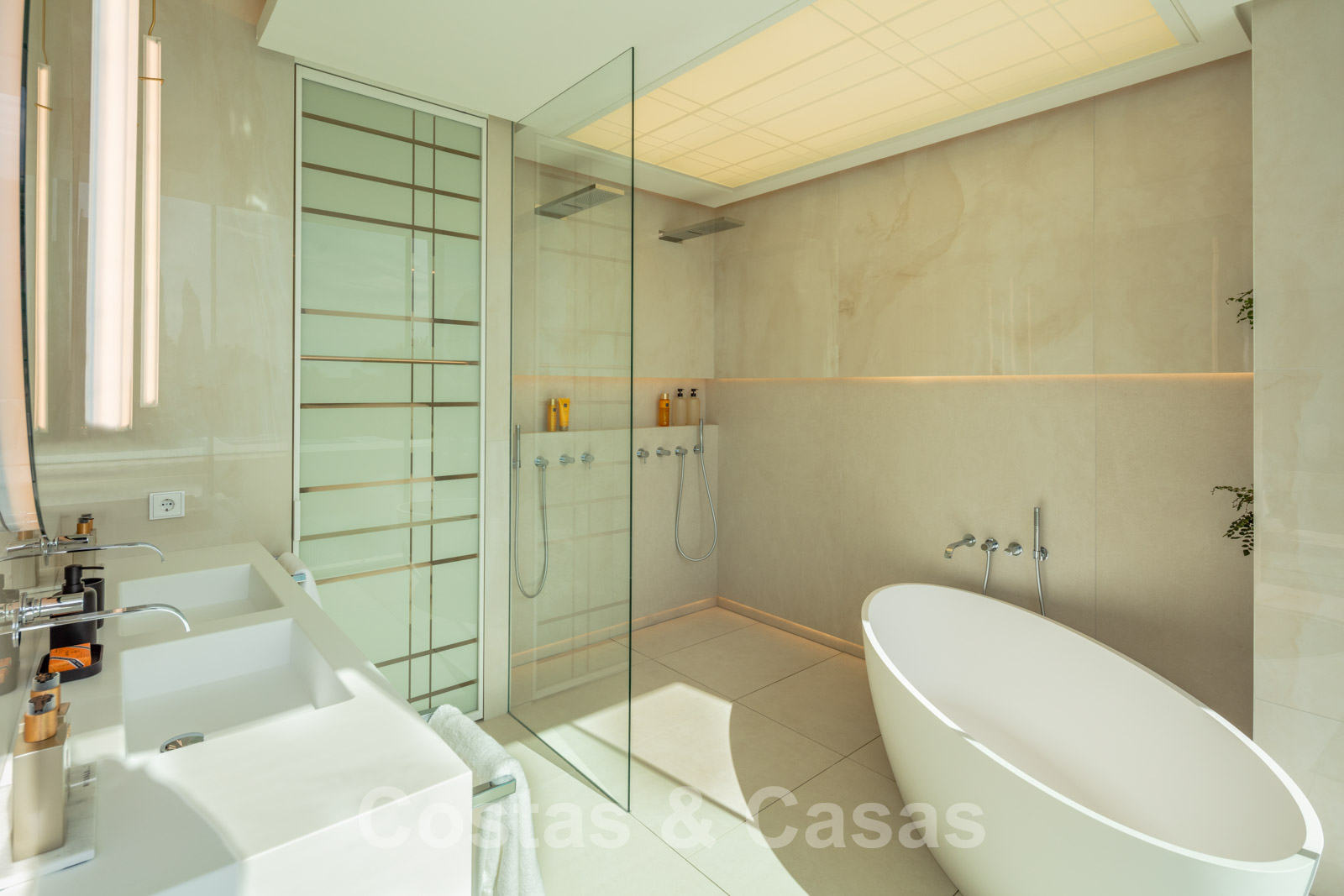 La suite principale dispose d'une salle de bains privative avec double vasque, baignoire autoportante et douche à l'italienne. Il y a également une grande terrasse privée.