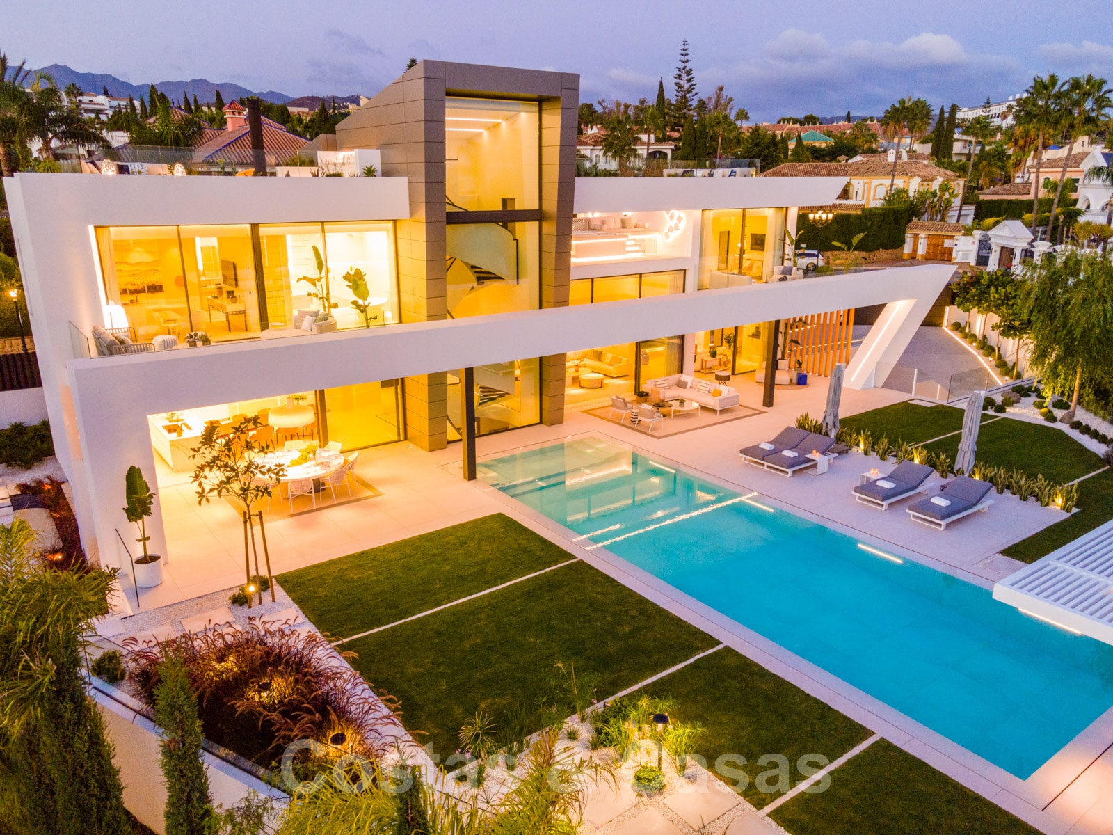 Prête à emménager, nouvelle villa de luxe moderne à vendre dans une urbanisation très demandé en bord de mer, juste à l'est du centre de Marbella