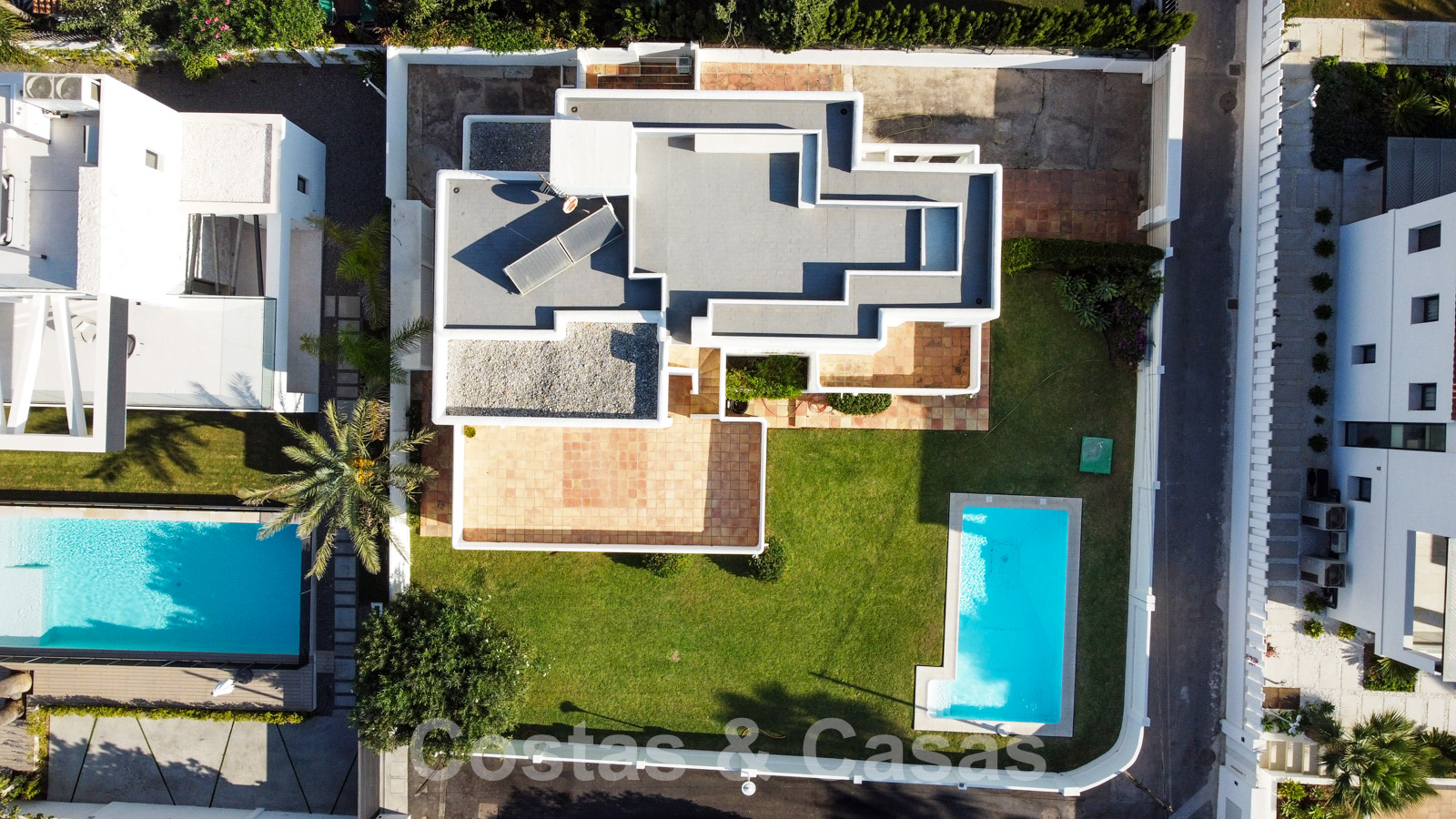 Terrain plat et entièrement clôturé. Jardin paysager soigné avec piscine et beaucoup de pelouse. Terrasses ouvertes et couvertes. Vaste solarium où l'on jouit d'une vue imprenable sur la mer. Orientation sud.