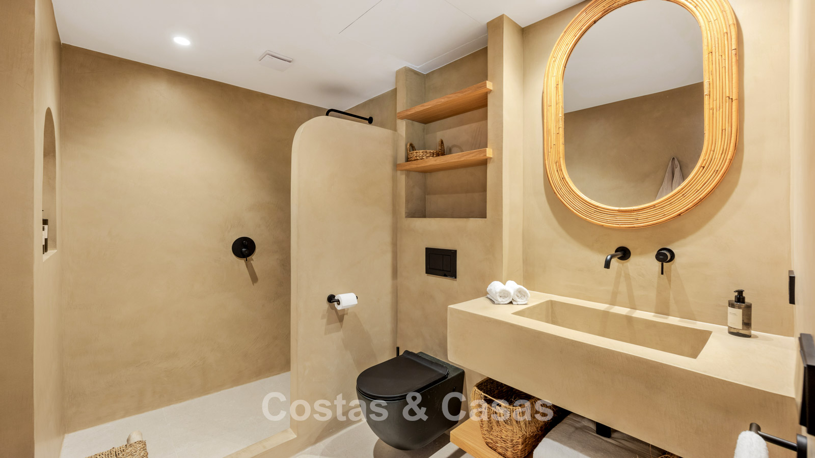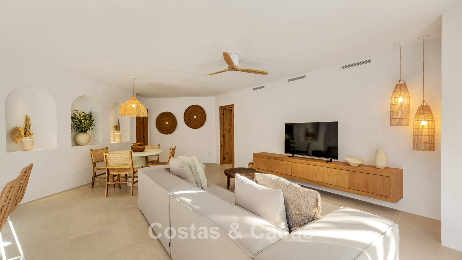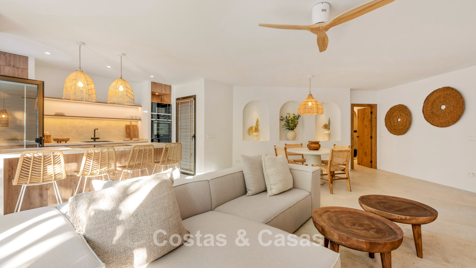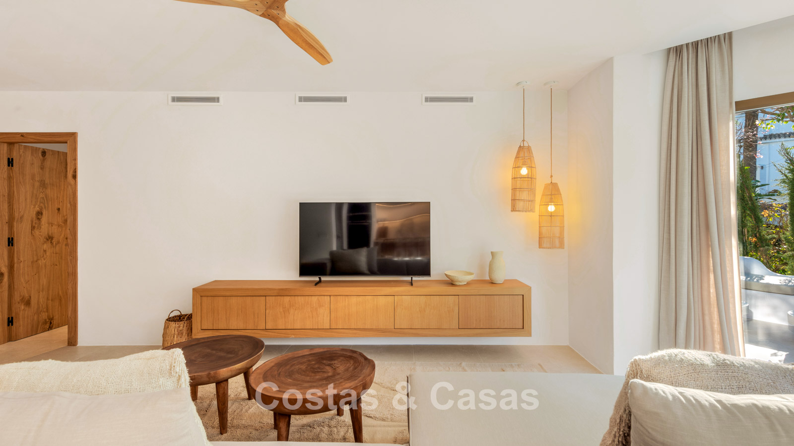 Appartement en rez-de-chaussée en parfait état. Récemment rénové avec des matériaux haut de gamme. Orientation ouest. La décoration intérieure allie l'élégance méditerranéenne contemporaine à des matériaux naturels chaleureux et des formes organiques, créant une ambiance luxueuse et raffinée. La terrasse ensoleillée offre un espace extérieur méditerranéen idyllique, avec des formes organiques, une végétation luxuriante et plusieurs espaces de détente. De grandes fenêtres laissent entrer une abondante lumière naturelle et créent une harmonie entre l'intérieur et la terrasse. Le séjour ouvert est décoré dans un style bohème chic sophistiqué, avec des couleurs claires et des finitions naturelles de haute qualité. La cuisine/salle à manger fonctionnelle est équipée d'appareils Siemens et d'un îlot central idéal pour les petits-déjeuners. 2 chambres, 2 salles de bains, toutes deux revêtues d'un enduit microciment très prisé, créant une ambiance chaleureuse et naturelle. Carrelage couleur crème.