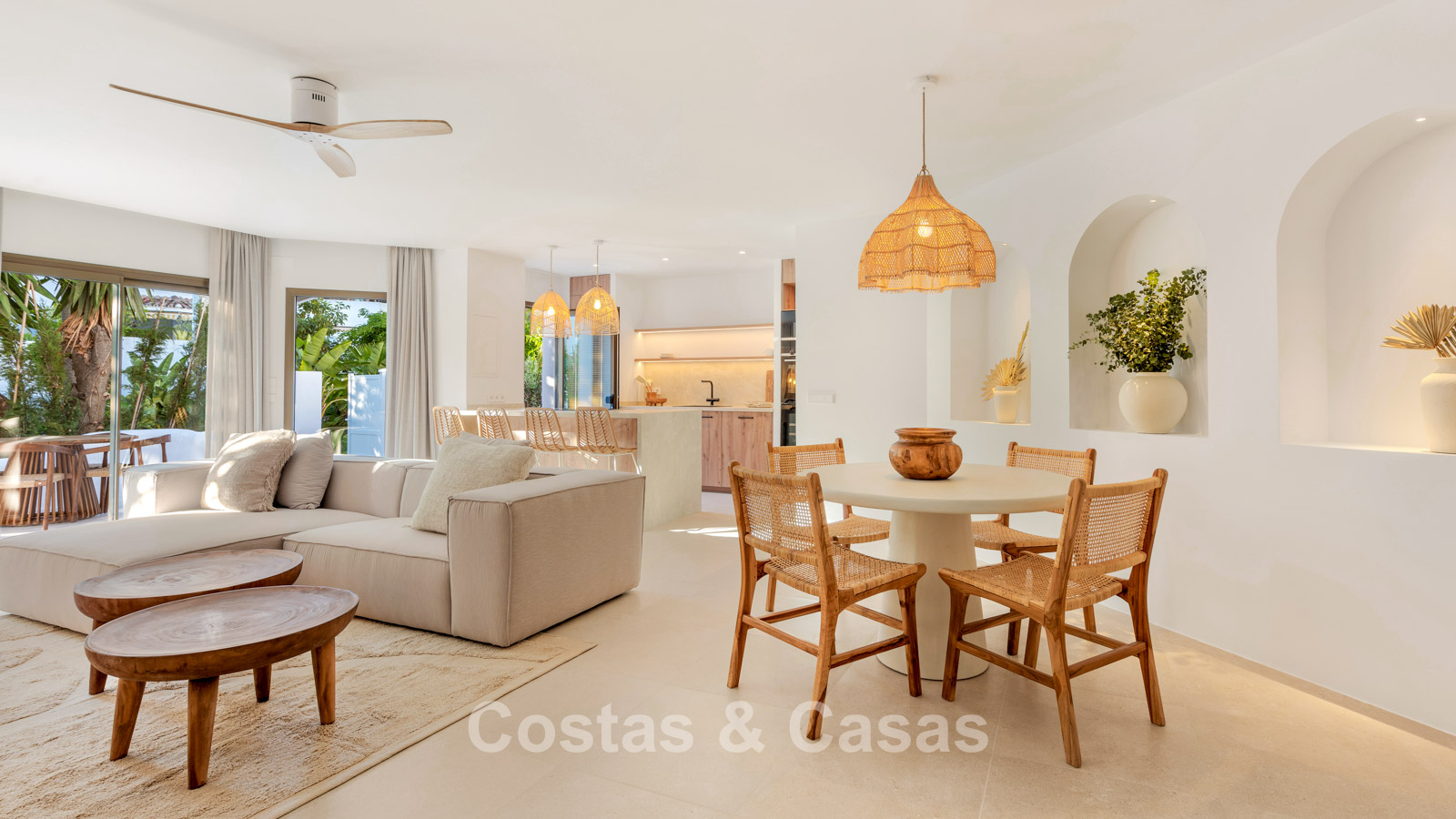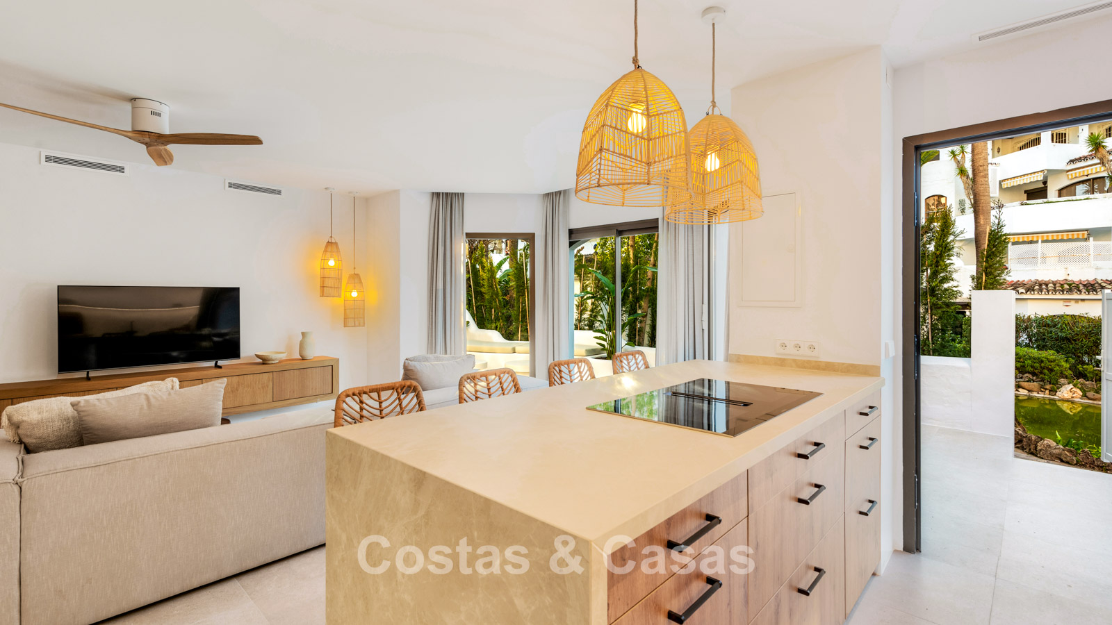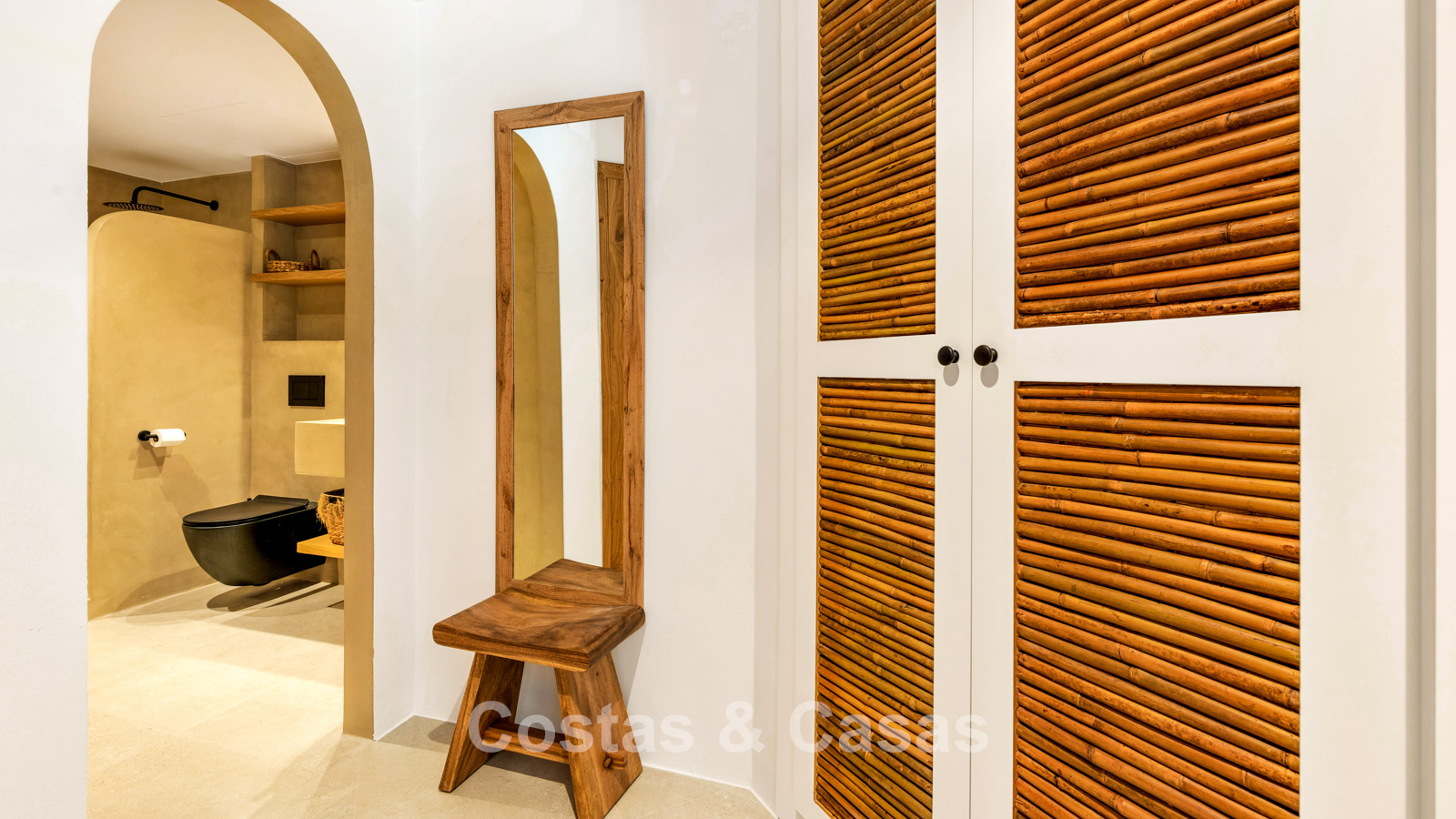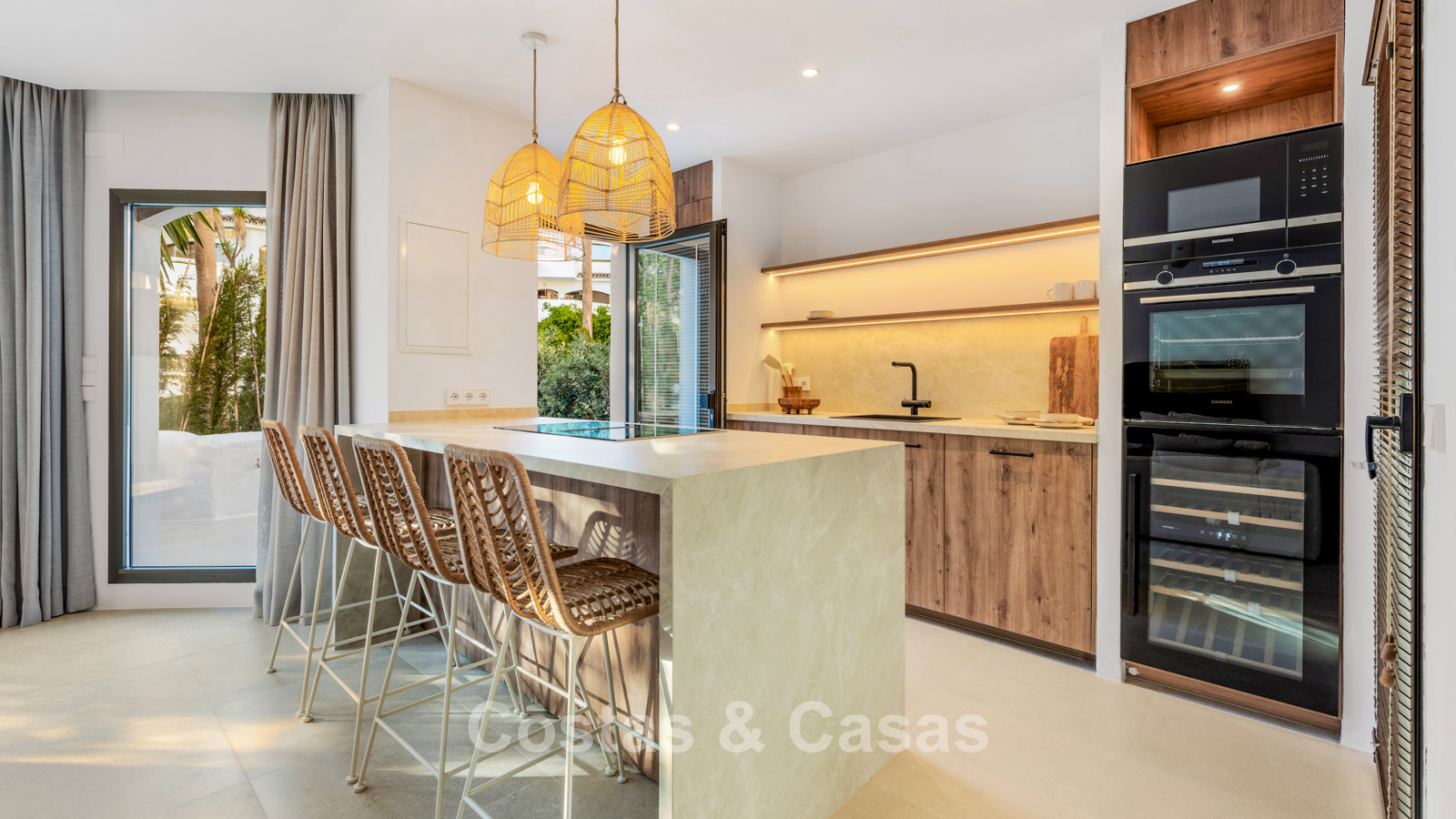 Appartement en rez-de-chaussée en parfait état. Récemment rénové avec des matériaux haut de gamme. Orientation ouest. La décoration intérieure allie l'élégance méditerranéenne contemporaine à des matériaux naturels chaleureux et des formes organiques, créant une ambiance luxueuse et raffinée. La terrasse ensoleillée offre un espace extérieur méditerranéen idyllique, avec des formes organiques, une végétation luxuriante et plusieurs espaces de détente. De grandes fenêtres laissent entrer une abondante lumière naturelle et créent une harmonie entre l'intérieur et la terrasse. Le séjour ouvert est décoré dans un style bohème chic sophistiqué, avec des couleurs claires et des finitions naturelles de haute qualité. La cuisine/salle à manger fonctionnelle est équipée d'appareils Siemens et d'un îlot central idéal pour les petits-déjeuners. 2 chambres, 2 salles de bains, toutes deux revêtues d'un enduit microciment très prisé, créant une ambiance chaleureuse et naturelle. Carrelage couleur crème.