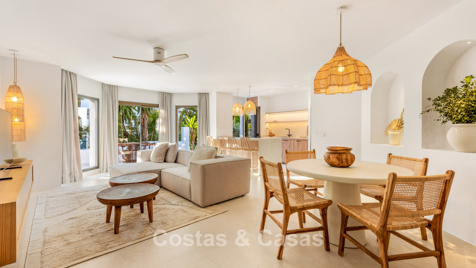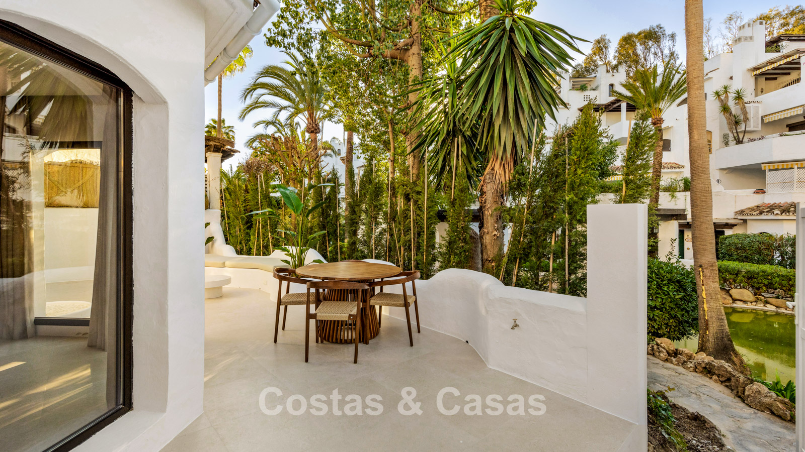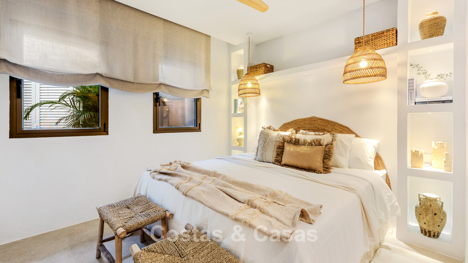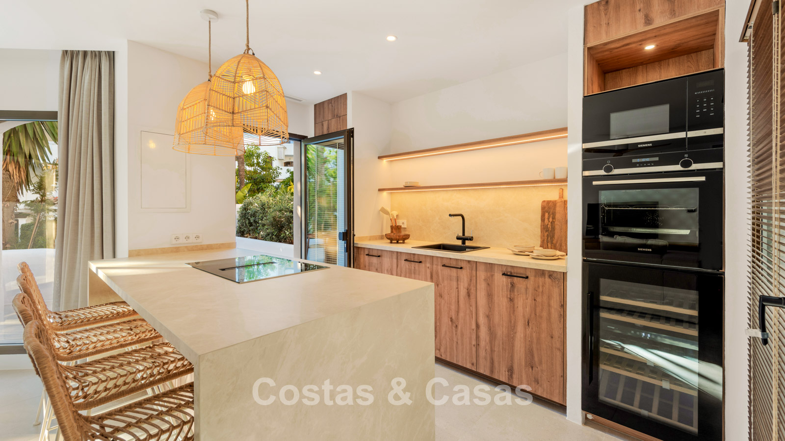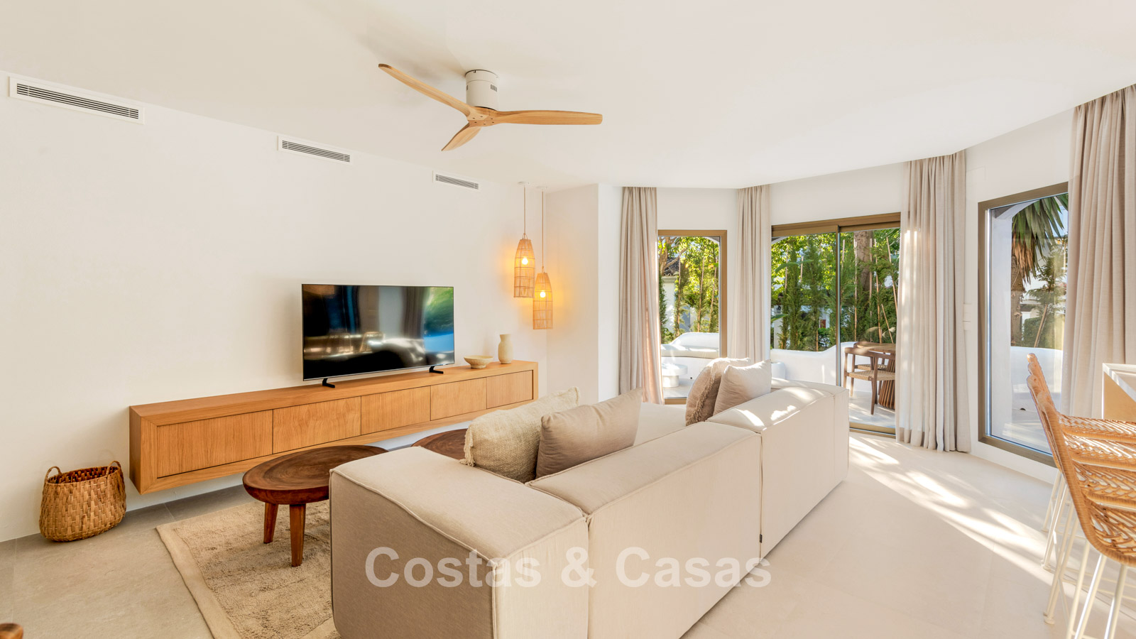 Appartement en rez-de-chaussée en parfait état. Récemment rénové avec des matériaux haut de gamme. Orientation ouest. La décoration intérieure allie l'élégance méditerranéenne contemporaine à des matériaux naturels chaleureux et des formes organiques, créant une ambiance luxueuse et raffinée. La terrasse ensoleillée offre un espace extérieur méditerranéen idyllique, avec des formes organiques, une végétation luxuriante et plusieurs espaces de détente. De grandes fenêtres laissent entrer une abondante lumière naturelle et créent une harmonie entre l'intérieur et la terrasse. Le séjour ouvert est décoré dans un style bohème chic sophistiqué, avec des couleurs claires et des finitions naturelles de haute qualité. La cuisine/salle à manger fonctionnelle est équipée d'appareils Siemens et d'un îlot central idéal pour les petits-déjeuners. 2 chambres, 2 salles de bains, toutes deux revêtues d'un enduit microciment très prisé, créant une ambiance chaleureuse et naturelle. Carrelage couleur crème.