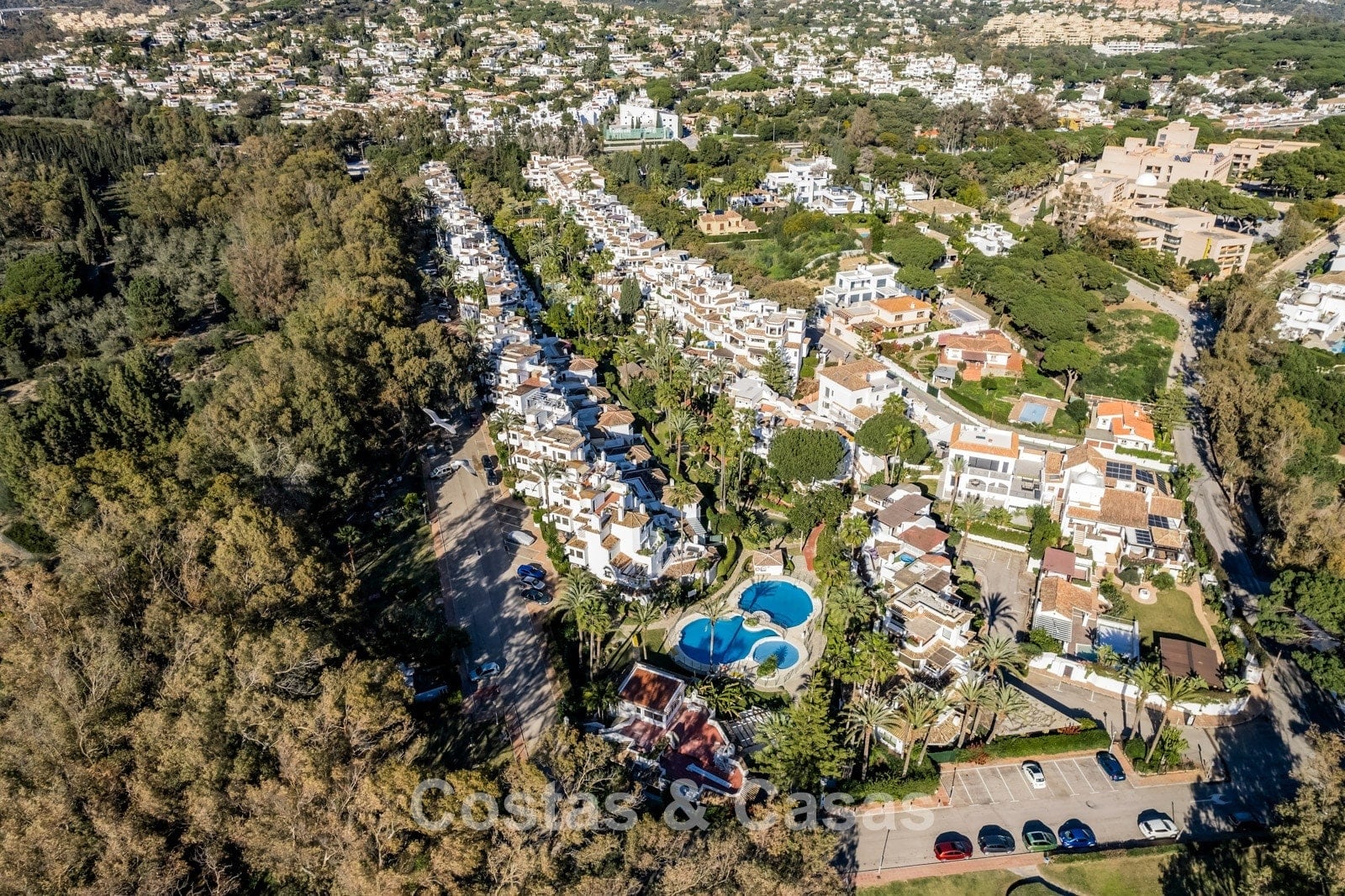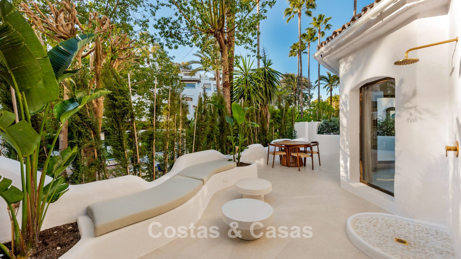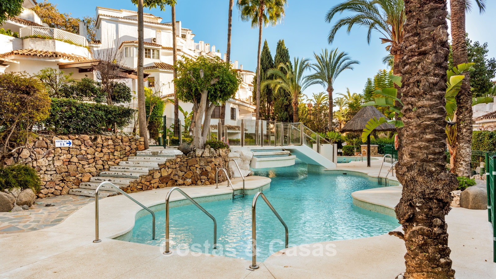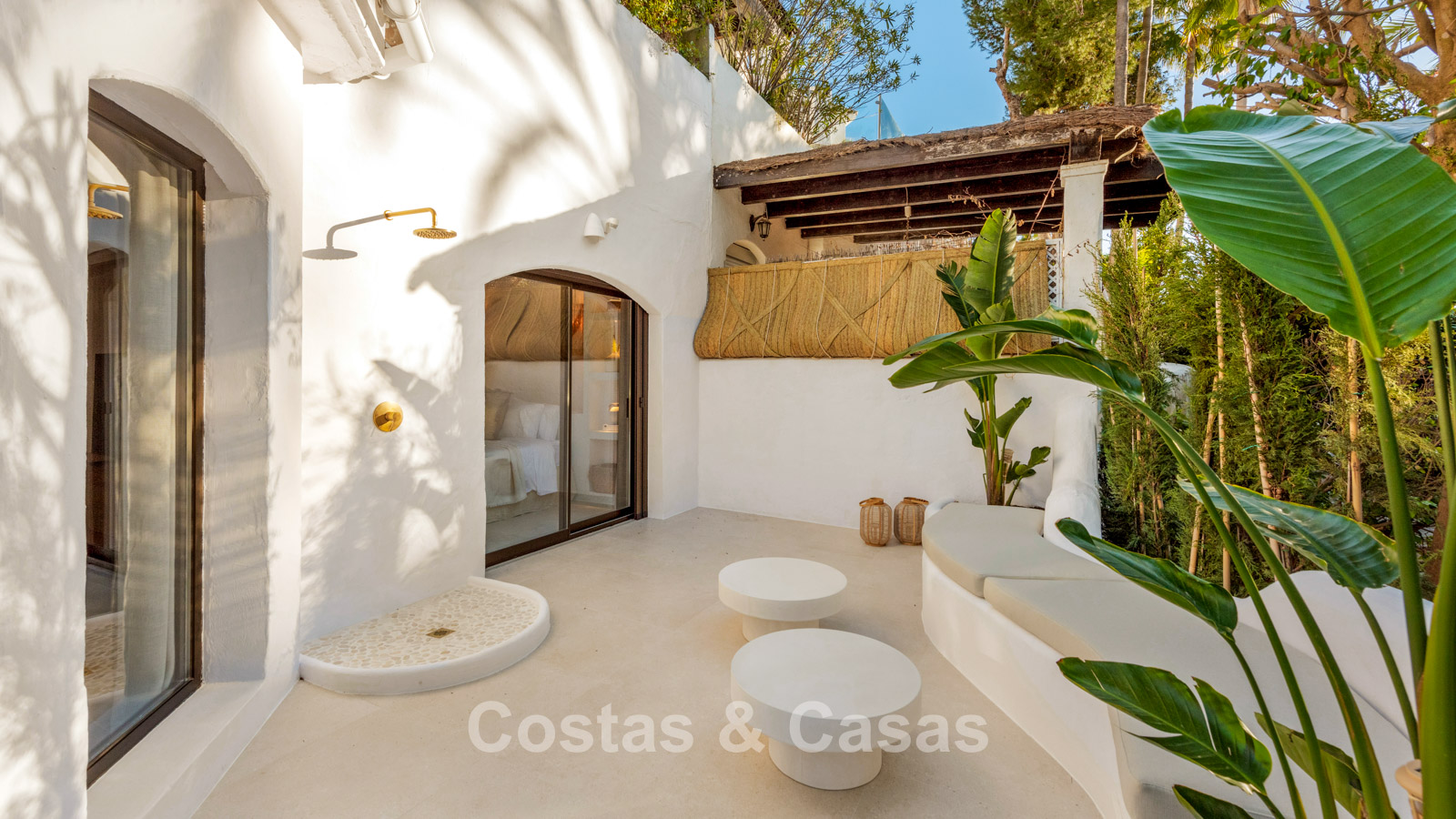 Appartement en rez-de-chaussée en parfait état. Récemment rénové avec des matériaux haut de gamme. Orientation ouest. La décoration intérieure allie l'élégance méditerranéenne contemporaine à des matériaux naturels chaleureux et des formes organiques, créant une ambiance luxueuse et raffinée. La terrasse ensoleillée offre un espace extérieur méditerranéen idyllique, avec des formes organiques, une végétation luxuriante et plusieurs espaces de détente. De grandes fenêtres laissent entrer une abondante lumière naturelle et créent une harmonie entre l'intérieur et la terrasse. Le séjour ouvert est décoré dans un style bohème chic sophistiqué, avec des couleurs claires et des finitions naturelles de haute qualité. La cuisine/salle à manger fonctionnelle est équipée d'appareils Siemens et d'un îlot central idéal pour les petits-déjeuners. 2 chambres, 2 salles de bains, toutes deux revêtues d'un enduit microciment très prisé, créant une ambiance chaleureuse et naturelle. Carrelage couleur crème.