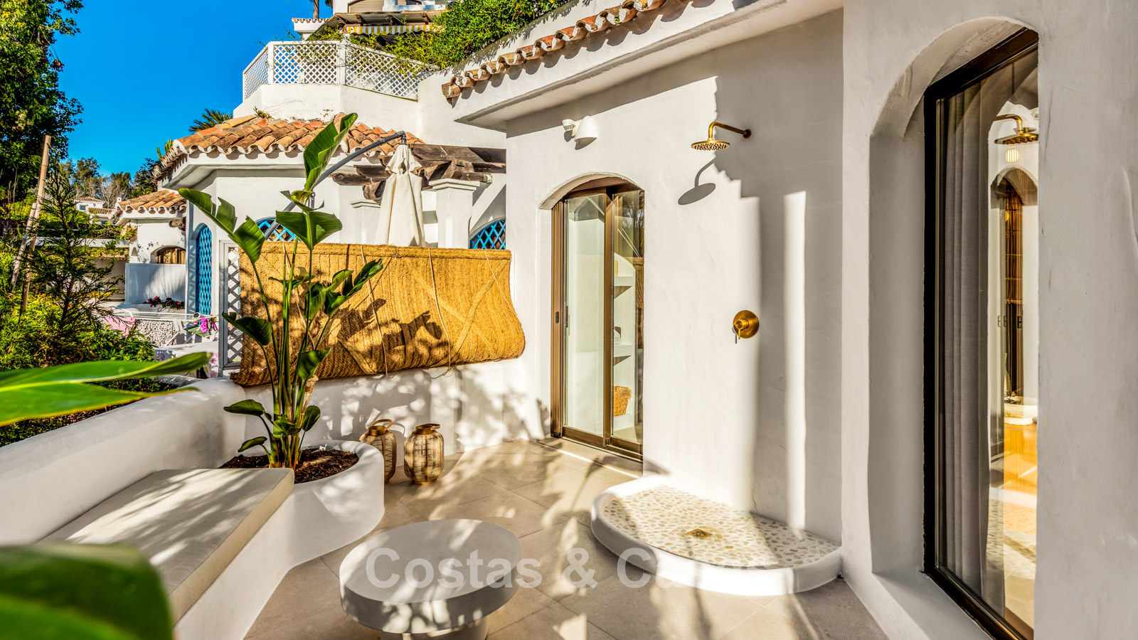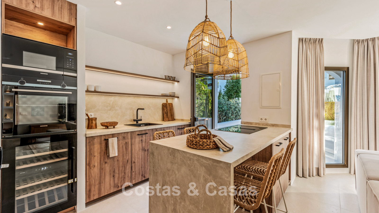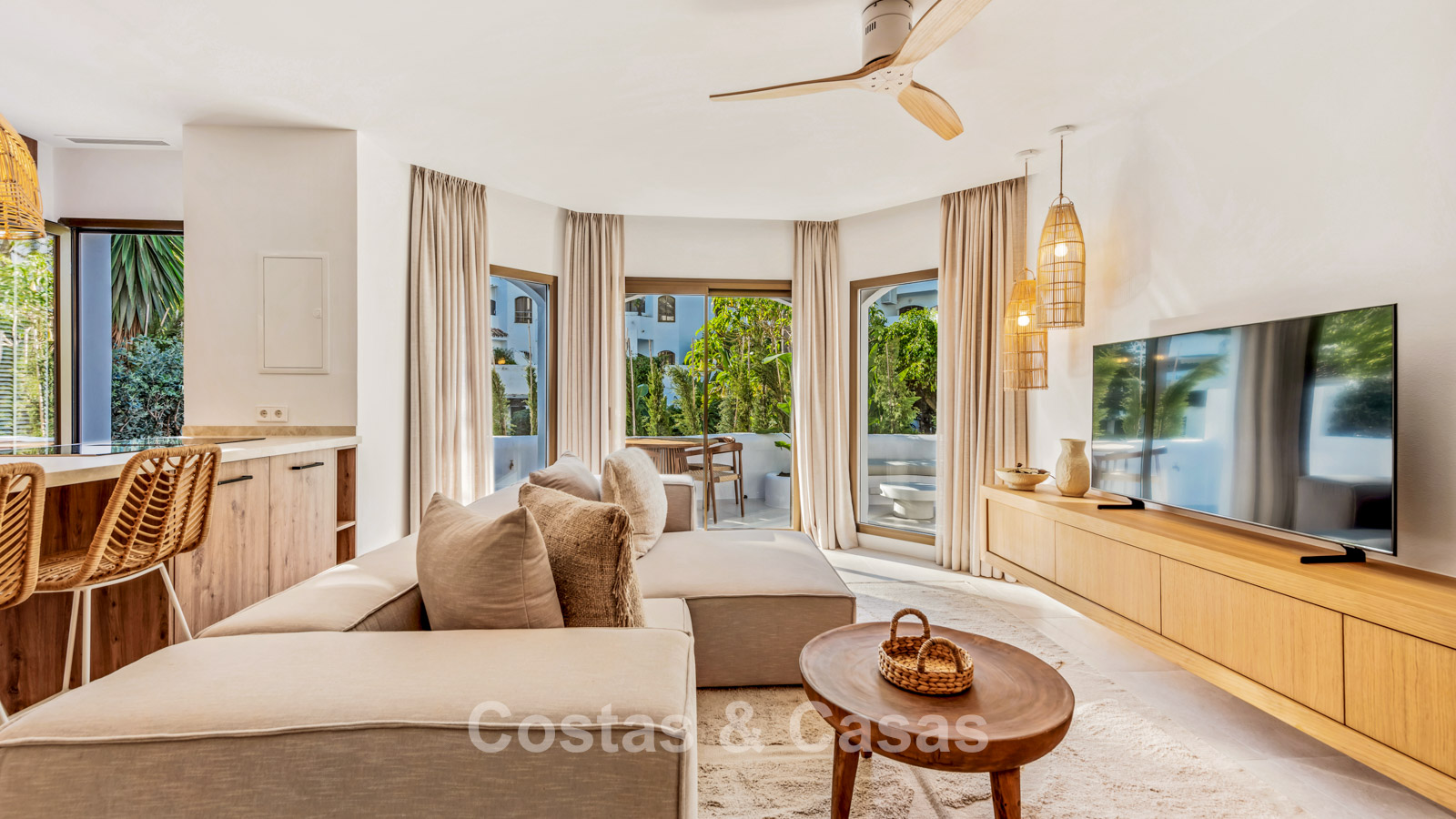 Appartement en rez-de-chaussée en excellent état. Récemment rénové dans un style contemporain avec des matériaux de haute qualité. Orientation ouest. Un intérieur charmant au style bohème méditerranéen, avec des touches de bois naturel et un agencement ouvert qui respire la chaleur et la sérénité. Une terrasse ensoleillée et abritée entoure en grande partie le séjour et, grâce à son design ouvert et sa végétation luxuriante, offre une atmosphère méditerranéenne sereine. De hautes fenêtres laissent entrer une abondante lumière naturelle et créent une transition harmonieuse entre l'intérieur et l'extérieur. Salon agréable avec coin repas et coin salon. Cuisine haut de gamme, équipée d'appareils Siemens et d'un îlot central avec plaque de cuisson et coin repas. 2 chambres, 2 salles de bain. Sol carrelé couleur crème.