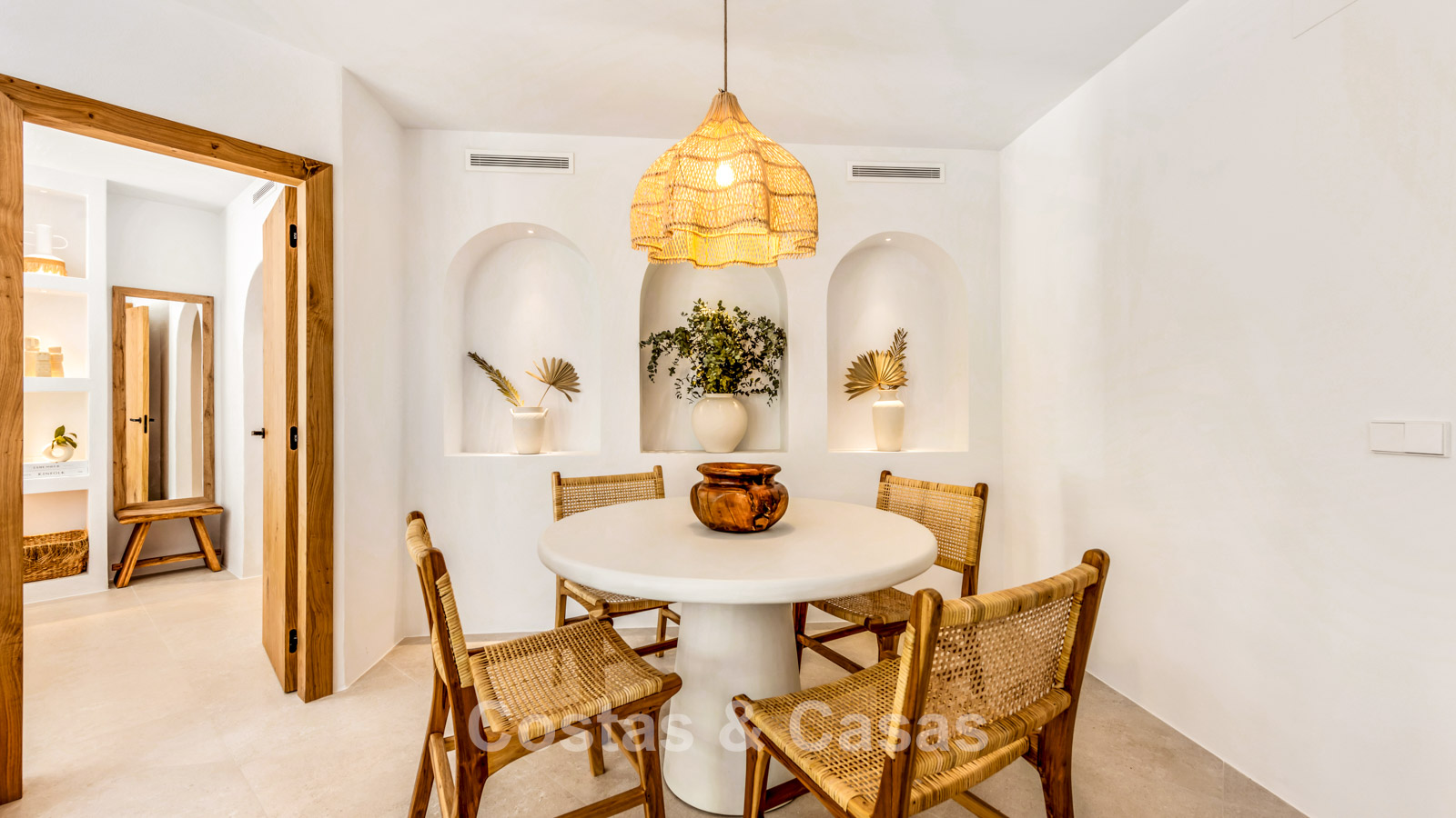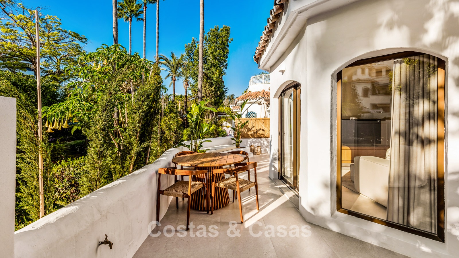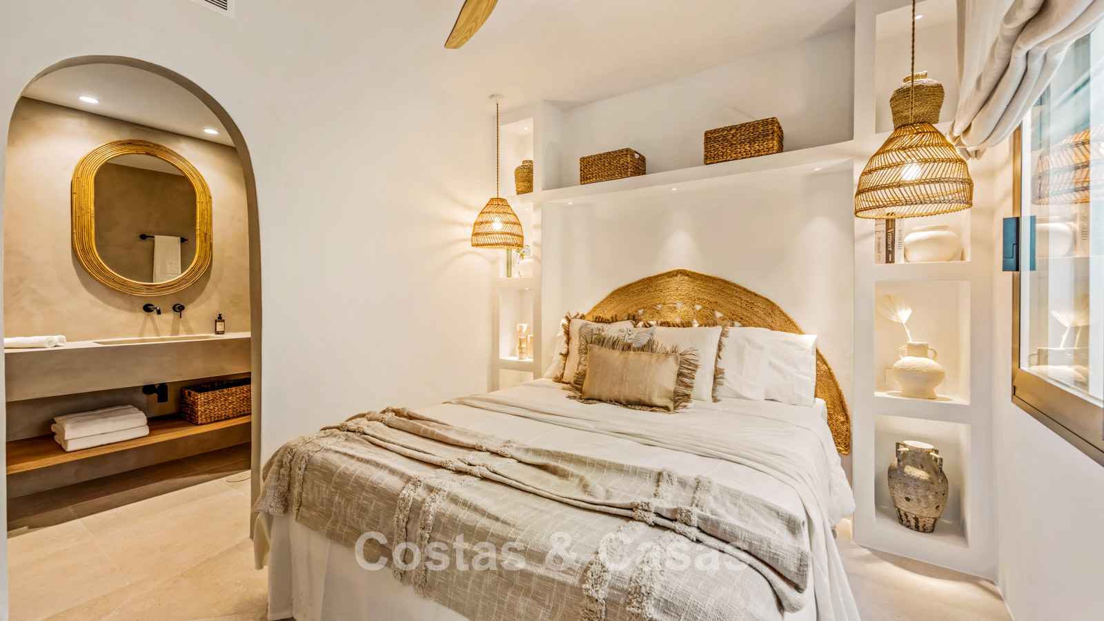 Appartement en rez-de-chaussée en excellent état. Récemment rénové dans un style contemporain avec des matériaux de haute qualité. Orientation ouest. Un intérieur charmant au style bohème méditerranéen, avec des touches de bois naturel et un agencement ouvert qui respire la chaleur et la sérénité. Une terrasse ensoleillée et abritée entoure en grande partie le séjour et, grâce à son design ouvert et sa végétation luxuriante, offre une atmosphère méditerranéenne sereine. De hautes fenêtres laissent entrer une abondante lumière naturelle et créent une transition harmonieuse entre l'intérieur et l'extérieur. Salon agréable avec coin repas et coin salon. Cuisine haut de gamme, équipée d'appareils Siemens et d'un îlot central avec plaque de cuisson et coin repas. 2 chambres, 2 salles de bain. Sol carrelé couleur crème.