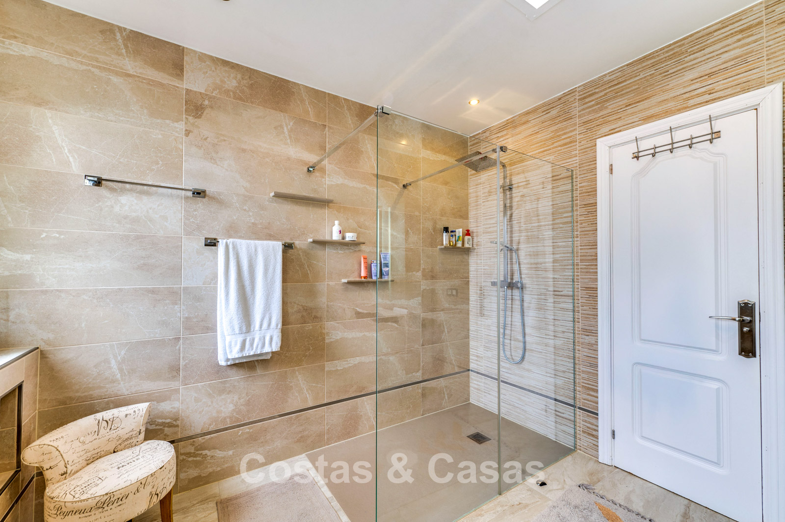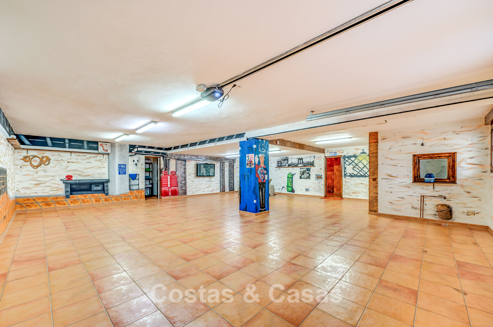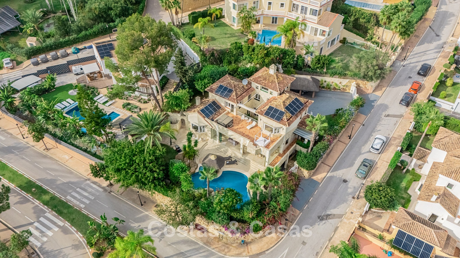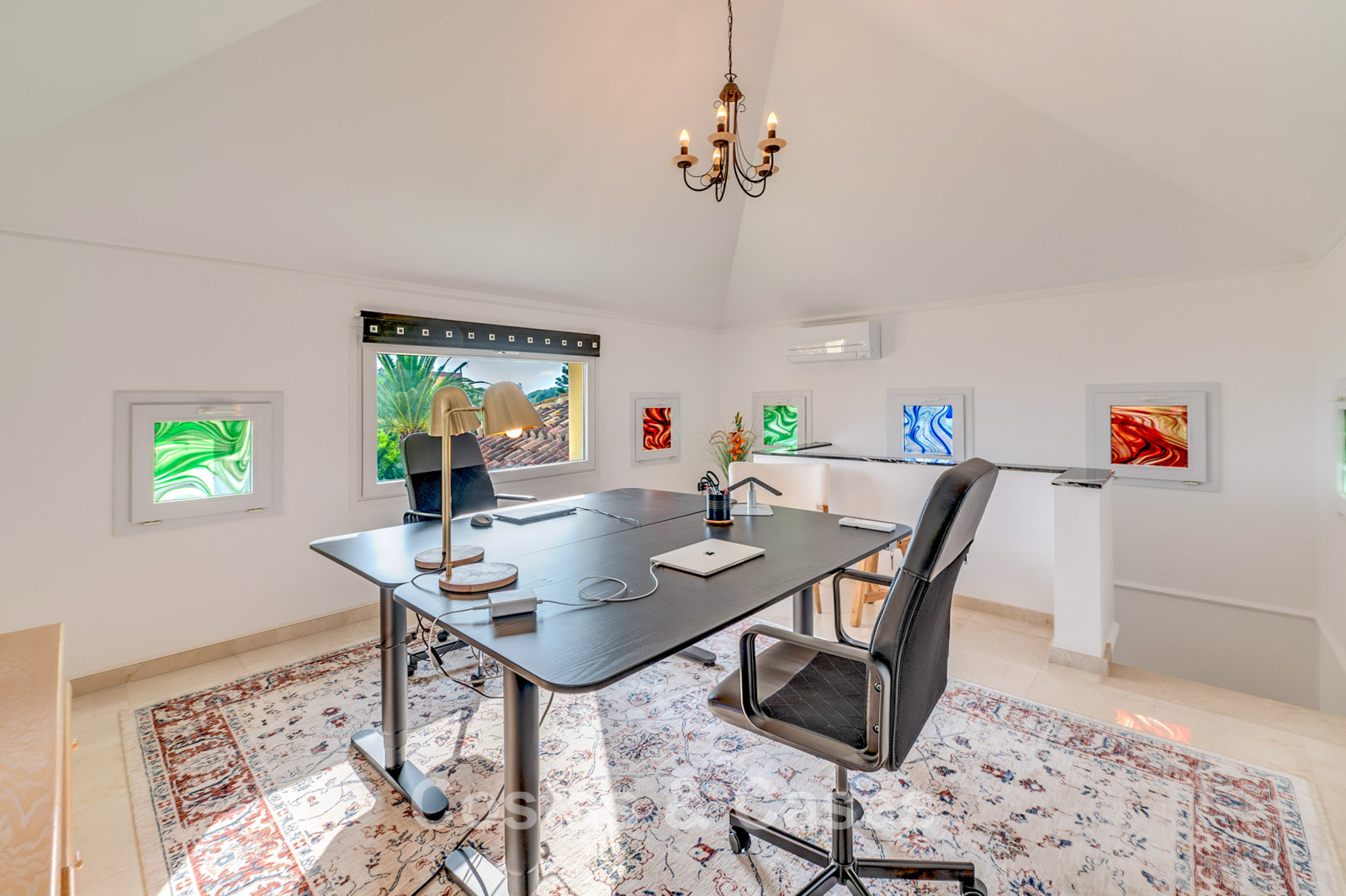 Cette villa individuelle offre une combinaison unique de luxe, de confort et de charme méditerranéen. Utilisation de matériaux naturels et de haute qualité. Le toit de tuiles et les couleurs naturelles confèrent un aspect chaleureux et invitant. Un hall d'entrée majestueux avec un plafond à double hauteur et un élégant escalier qui monte vers le haut. Séjour avec un salon TV et un 2ème coin salon avec cheminée. De grandes portes coulissantes en verre relient les espaces intérieurs et extérieurs de manière transparente, ce qui est idéal pour se divertir ou simplement profiter du plein air. Grande cuisine/salle à manger avec beaucoup d'espace de rangement, un îlot de cuisson et un coin repas. 5 chambres, 6 salles de bains. Espace bureau. Sols en marbre. Débarras. L’étage inférieur dispose d'un grand garage pour 7 voitures, qui offre le potentiel d'être en partie transformé en salle de sport ou de jeux. Abri voiture supplémentaire et parking pour 2 voitures.