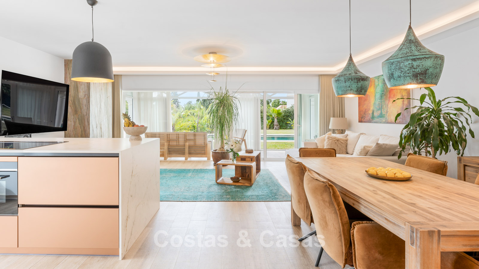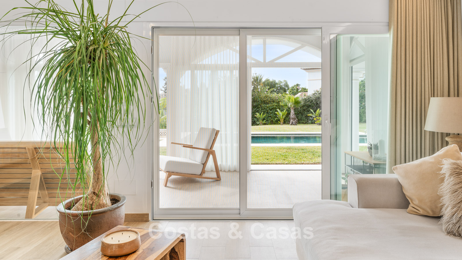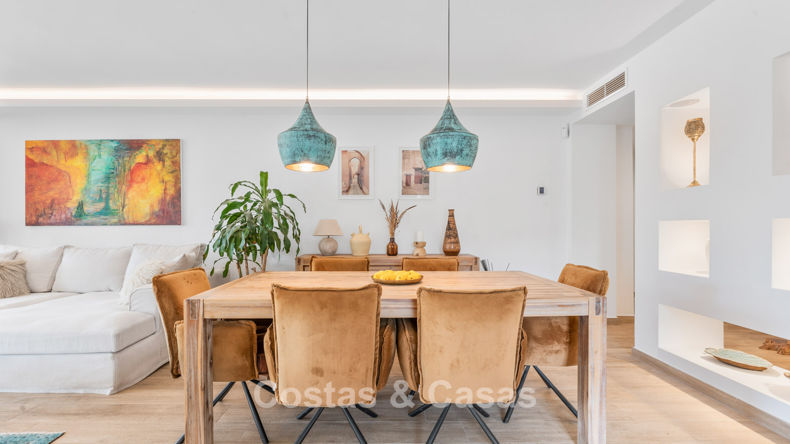 Villa individuelle à l'architecture méditerranéenne. Intérieur lumineux grâce à de hautes fenêtres coulissantes qui relient les espaces intérieurs et extérieurs. Soigneusement rénovée en 2022. Un intérieur minimaliste est accentué par des touches de couleurs subtiles et chaudes. Espace de vie ouvert. Cuisine pratique et entièrement équipée avec des appareils électroménagers haut de gamme et un bar pour le petit-déjeuner. Coin repas intégré. 3 chambres, 2 salles de bains et une toilette séparée. Sols Porcelanosa de haute qualité. Garage intérieur pour 1 voiture. Abri pour 1 voiture.