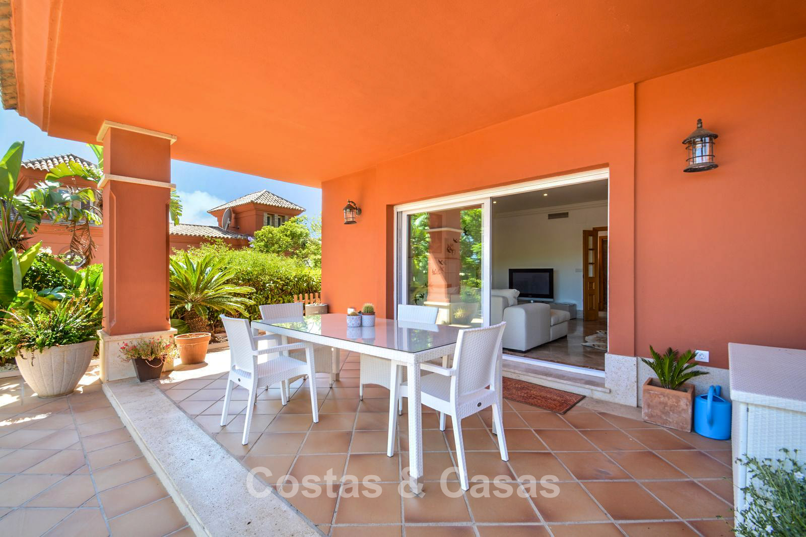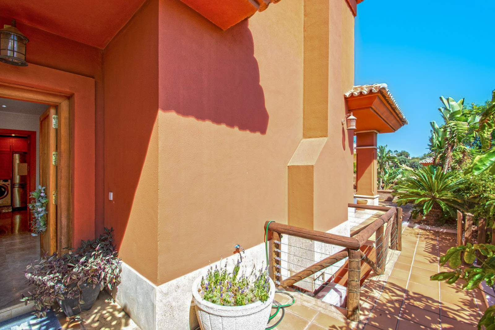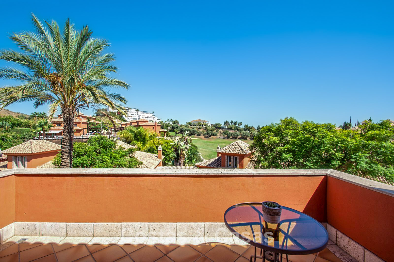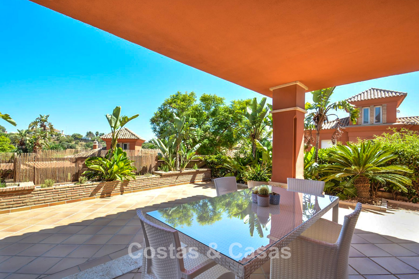 Villa jumelée à l'aspect méditerranéen élégant. Utiliser des matériaux de qualité. L'extérieur est composé de couleurs chaudes en terre cuite, qui offrent une vie extérieure attrayante. Exposition sud. Vue partielle sur le golf et la mer Méditerranée. De hautes fenêtres coulissantes s'ouvrent sur l'espace extérieur et laissent entrer beaucoup de lumière naturelle. Grand salon suivi d'une salle à manger. Cuisine séparée, entièrement équipée avec des appareils électroménagers de qualité et un bar pour le petit-déjeuner. 6 chambres, 5 salles de bains. La chambre principale bénéficie d'une terrasse privée et d'une vue partielle sur la mer et le golf. Sols en marbre. Un grand sous-sol aménagé avec diverses pièces, grand dressing, débarras et salle de bain avec jacuzzi. Débarras.