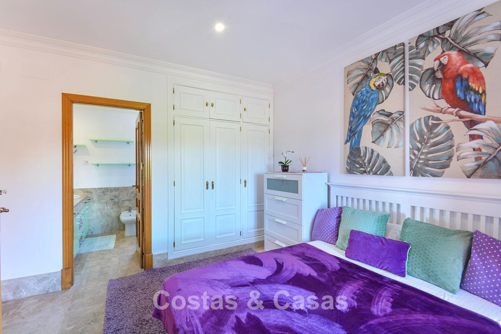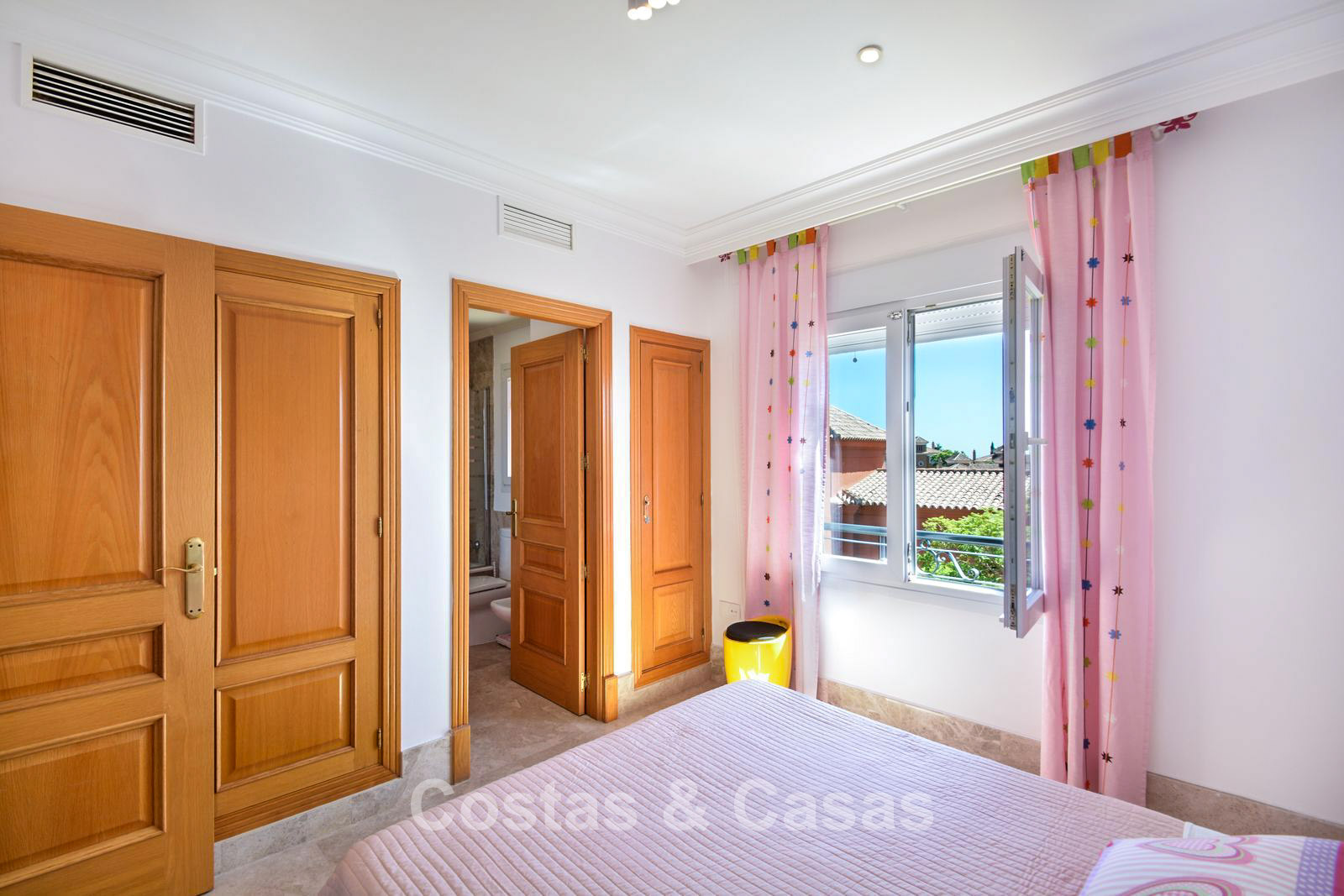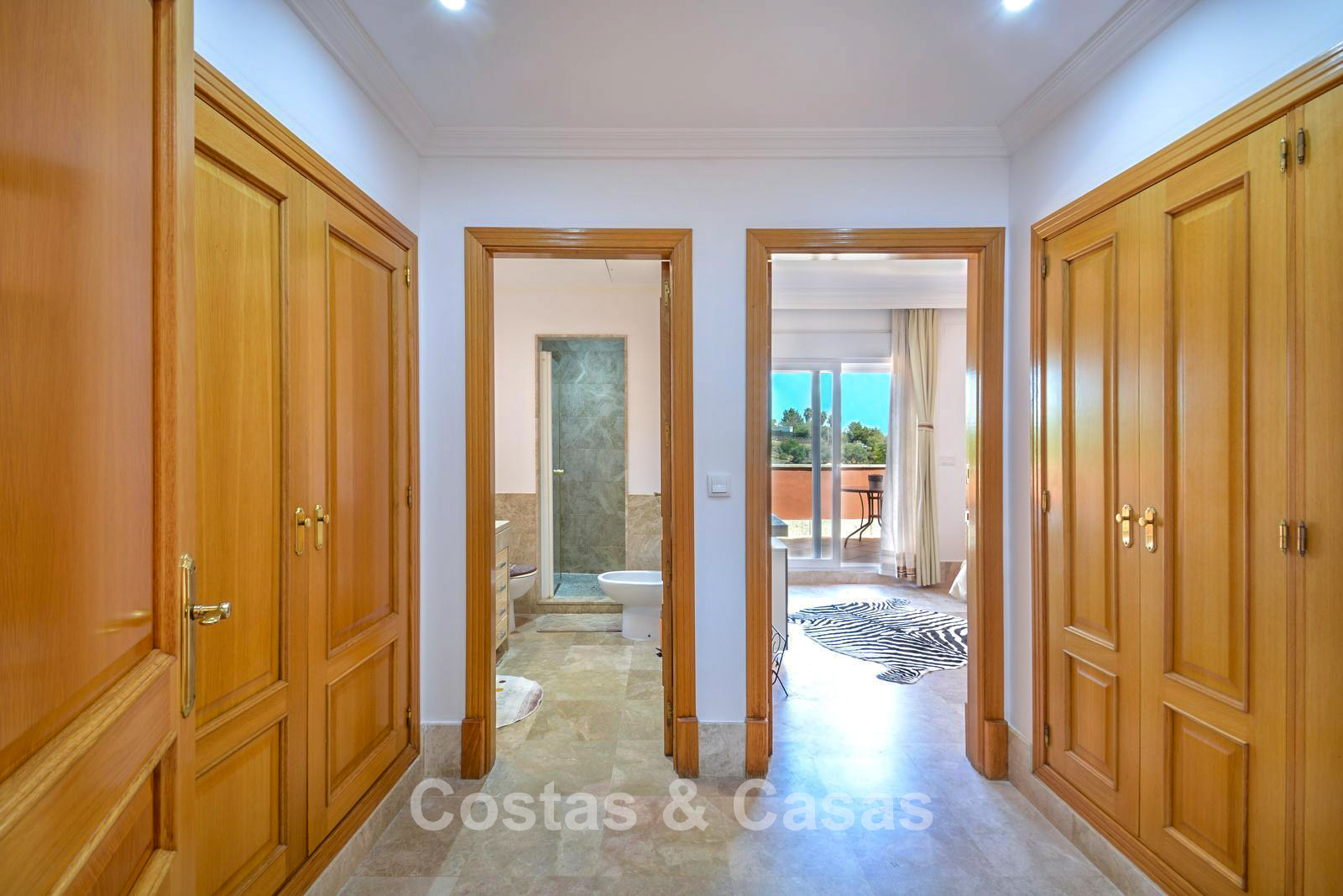 Villa jumelée à l'aspect méditerranéen élégant. Utiliser des matériaux de qualité. L'extérieur est composé de couleurs chaudes en terre cuite, qui offrent une vie extérieure attrayante. Exposition sud. Vue partielle sur le golf et la mer Méditerranée. De hautes fenêtres coulissantes s'ouvrent sur l'espace extérieur et laissent entrer beaucoup de lumière naturelle. Grand salon suivi d'une salle à manger. Cuisine séparée, entièrement équipée avec des appareils électroménagers de qualité et un bar pour le petit-déjeuner. 6 chambres, 5 salles de bains. La chambre principale bénéficie d'une terrasse privée et d'une vue partielle sur la mer et le golf. Sols en marbre. Un grand sous-sol aménagé avec diverses pièces, grand dressing, débarras et salle de bain avec jacuzzi. Débarras.