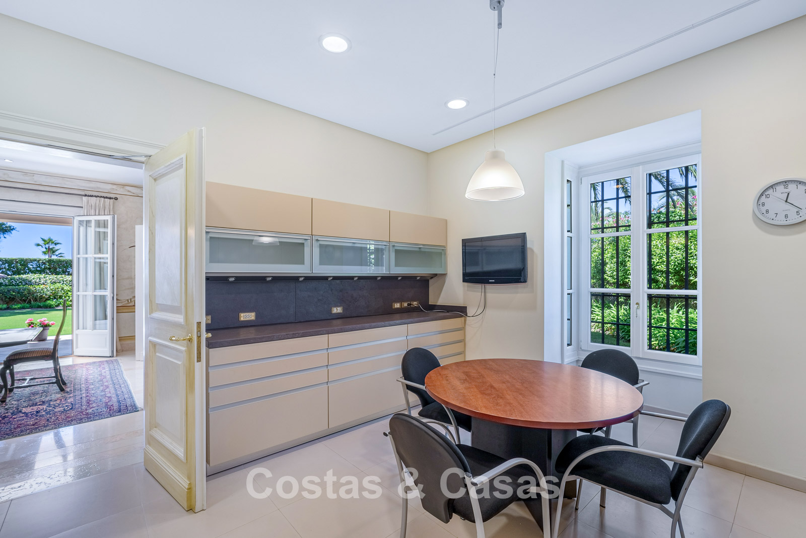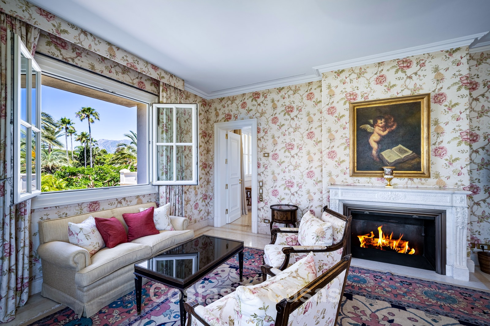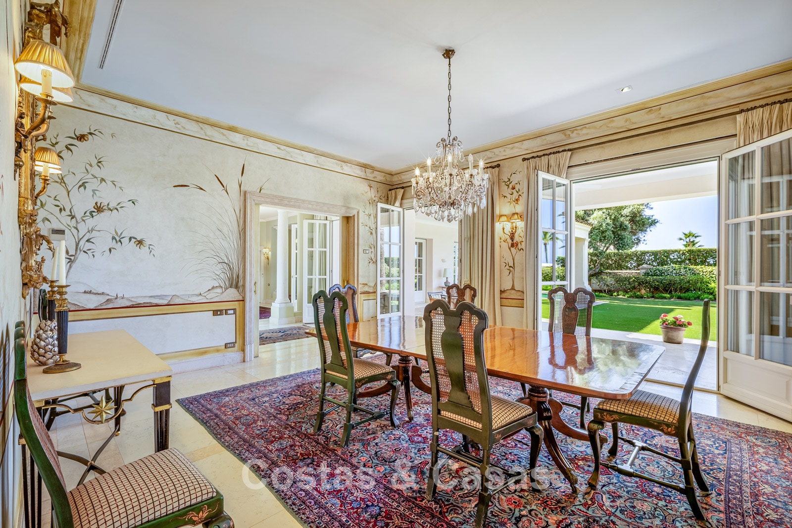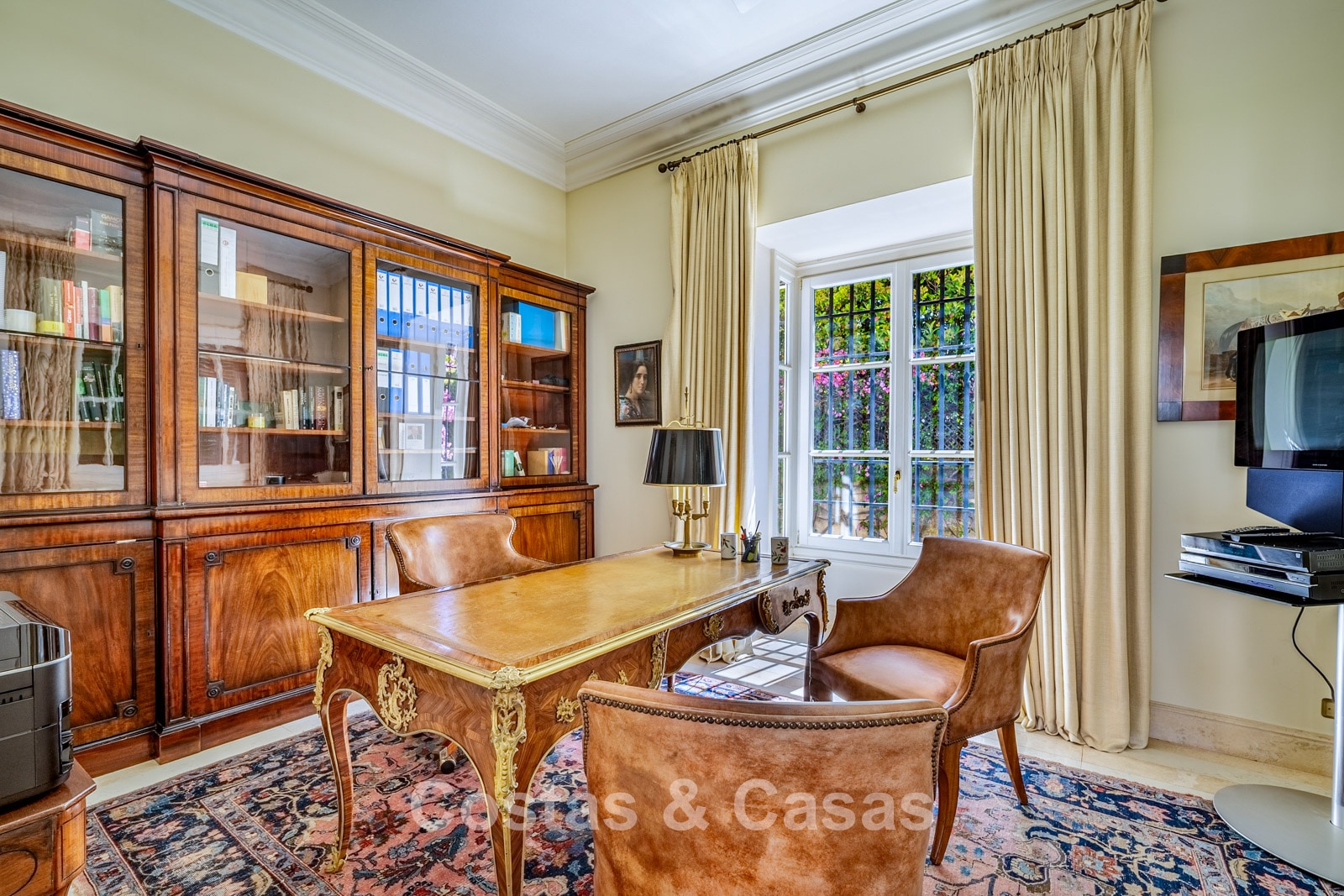 Spacieuse villa individuelle au caractère classique allié à un design méditerranéen intemporel. Matériaux de haute qualité et souci du détail. Vous entrez dans un hall d’entrée majestueux avec une double hauteur sous plafond et un élégant escalier entièrement en marbre. Intérieur lumineux aux touches élégantes, notamment des colonnes raffinées et des finitions en marbre. Les espaces intérieurs sont décorés d'un mobilier classique aux motifs riches et détaillés, dans une palette de couleurs chaleureuses. Vaste séjour avec coin salon près de la cheminée. Un bureau est adjacent. Salle à manger formelle avec accès direct au jardin. De hautes fenêtres créent une transition subtile entre l'intérieur et l'extérieur. Grande cuisine entièrement équipée avec îlot central et nombreux rangements. 7 chambres au mobilier authentique, 6 salles de bains et 2 toilettes séparées pour invités. Un espace séparé pour les invités ou le personnel, équipé d'une kitchenette et d'un espace de vie confortable, est à votre disposition. Salle de sport privée. Garage intérieur pouvant accueillir plus de 5 voitures.