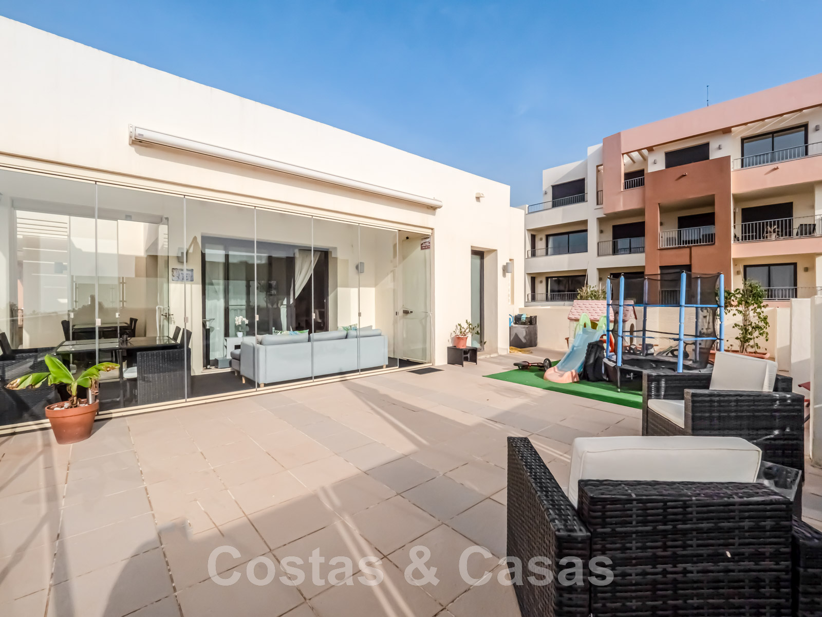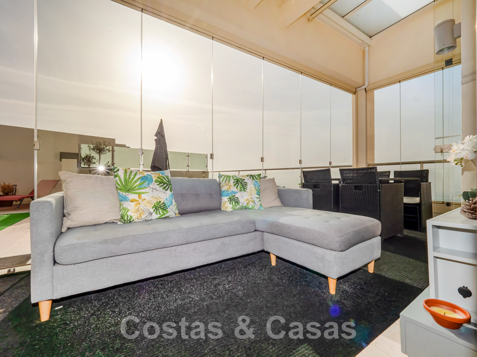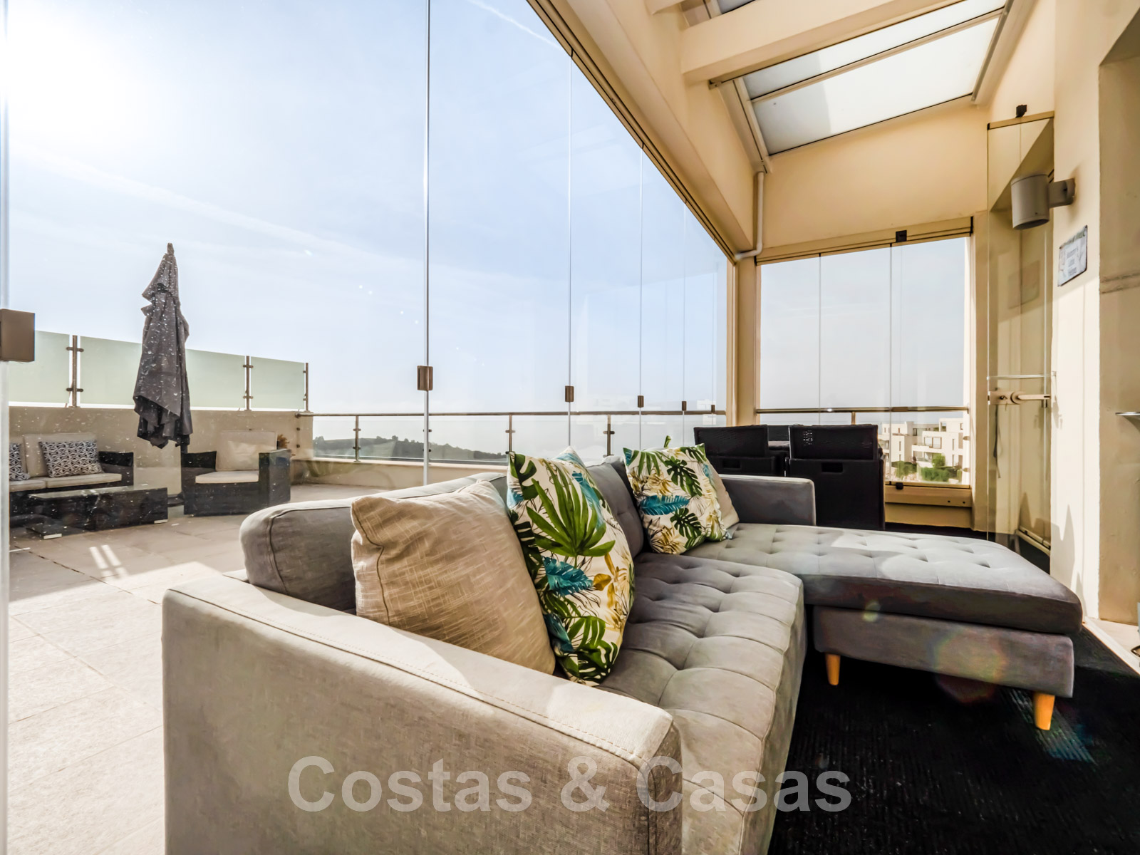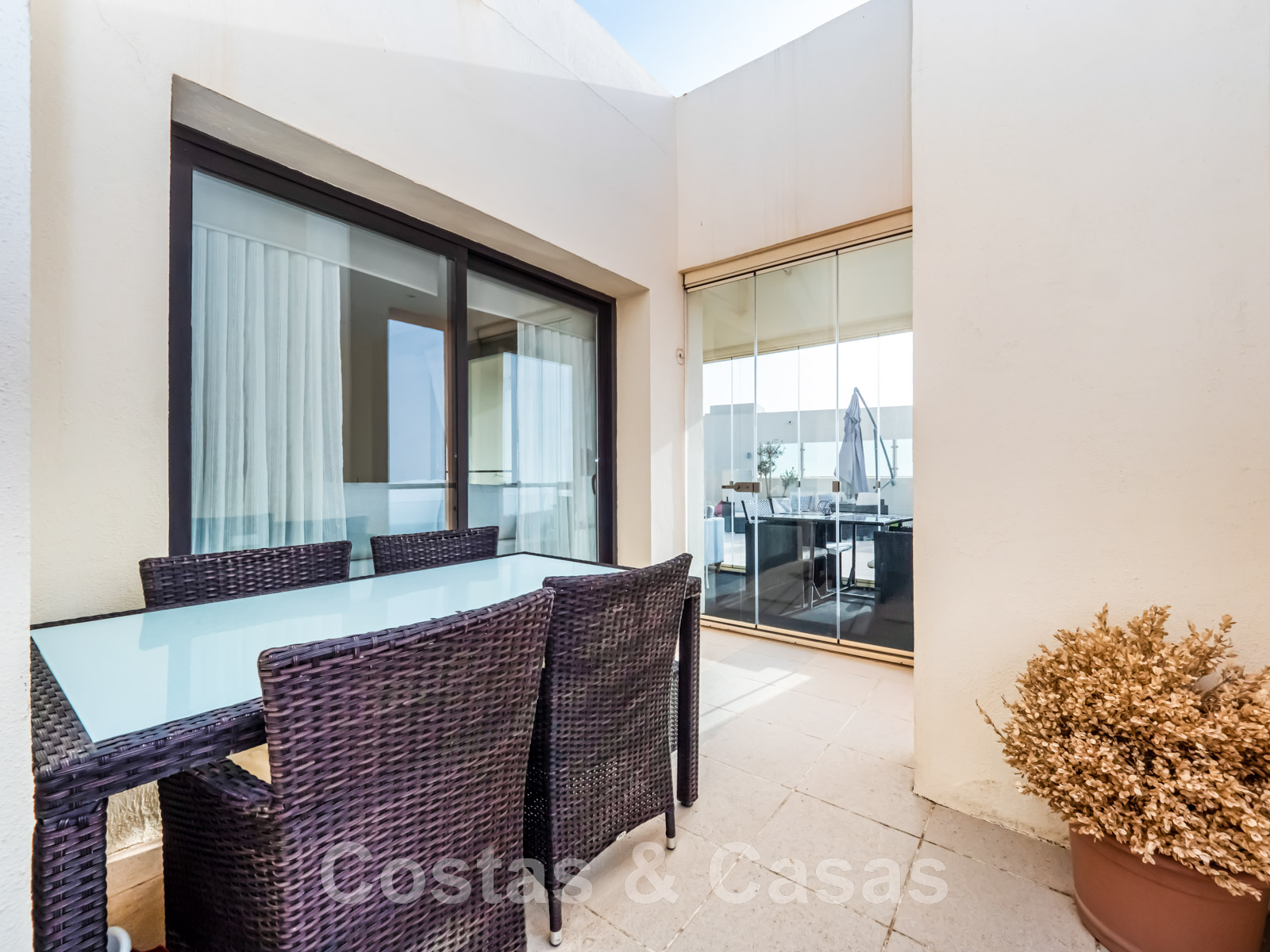 Terrasse partiellement couverte et protégée par des rideaux de verre.