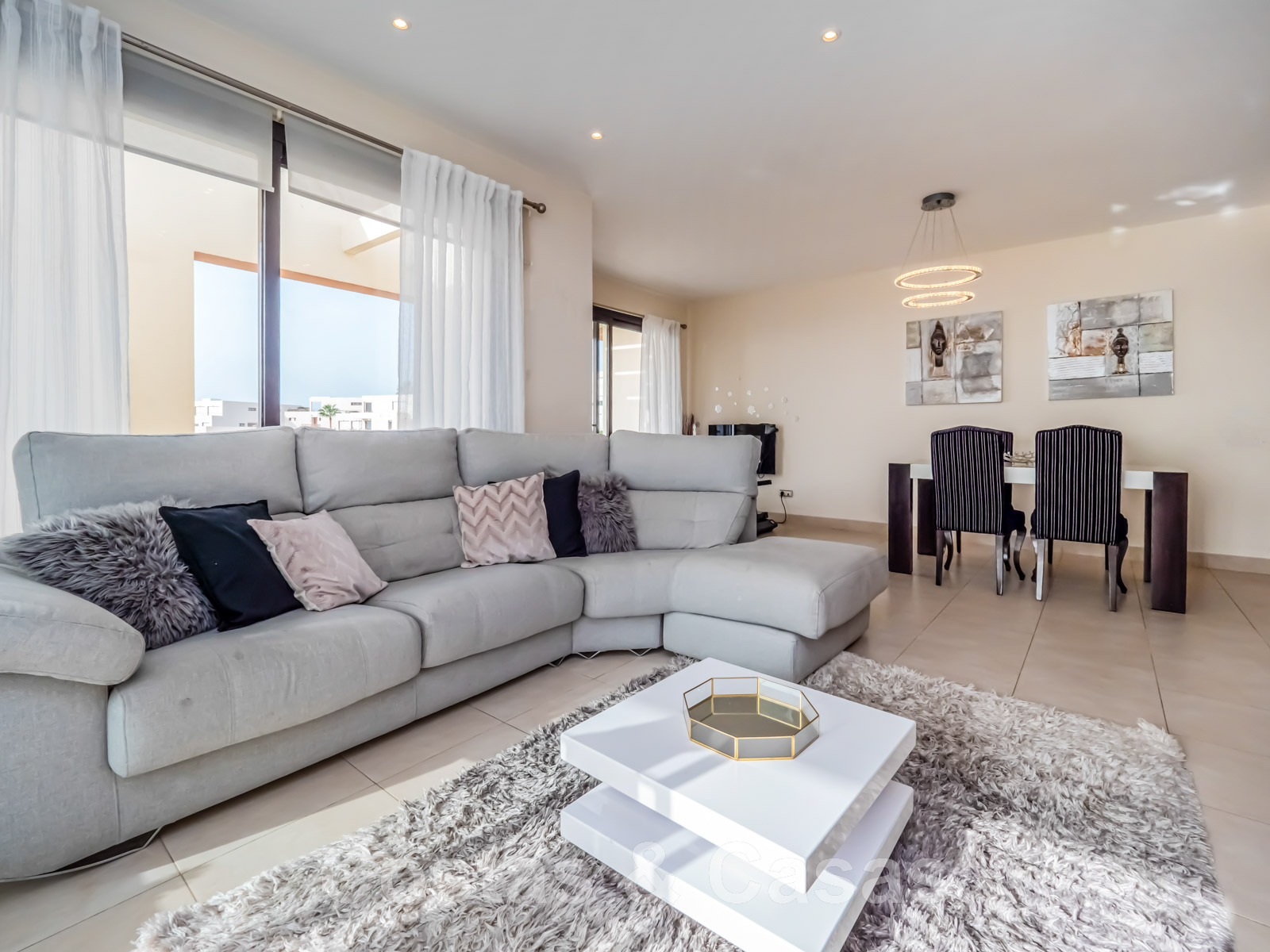 Les hautes fenêtres coulissantes génèrent beaucoup de lumière naturelle.