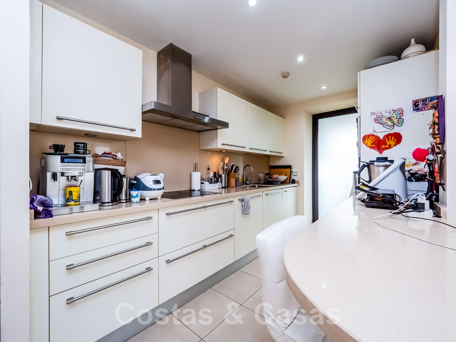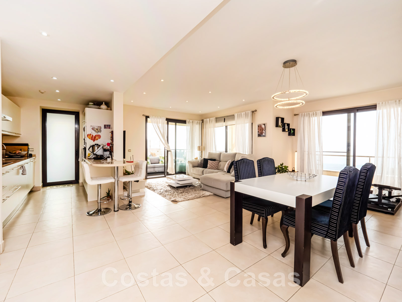 Cuisine ouverte, entièrement équipée avec des appareils Bosch et un bar pour le petit-déjeuner.
