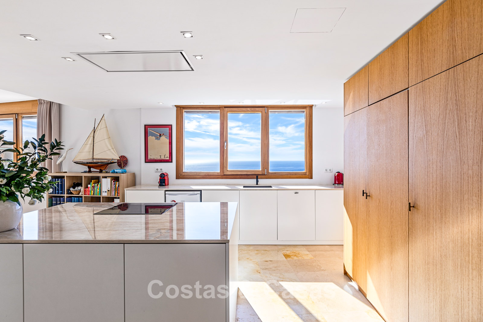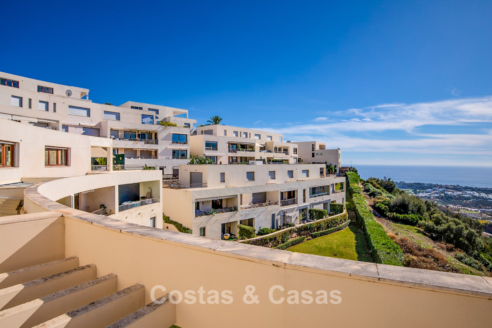 Penthouse généreux en excellent état. Vues panoramiques spectaculaires sur la Méditerranée et le littoral depuis chaque pièce. Orientation sud-ouest. Intérieur moderne et lumineux de près de 100 m². De grandes baies coulissantes laissent entrer une abondante lumière naturelle. Grand espace de vie ouvert avec salle à manger intégrée. Cuisine ouverte avec îlot central, connectée de manière fluide au séjour. 3 chambres, 2 + 1 salles de bains. La chambre principale donne accès à une autre terrasse orientée à l’ouest. Sol en marbre. Buanderie. Débarras. Inclus: 2 places de garage.