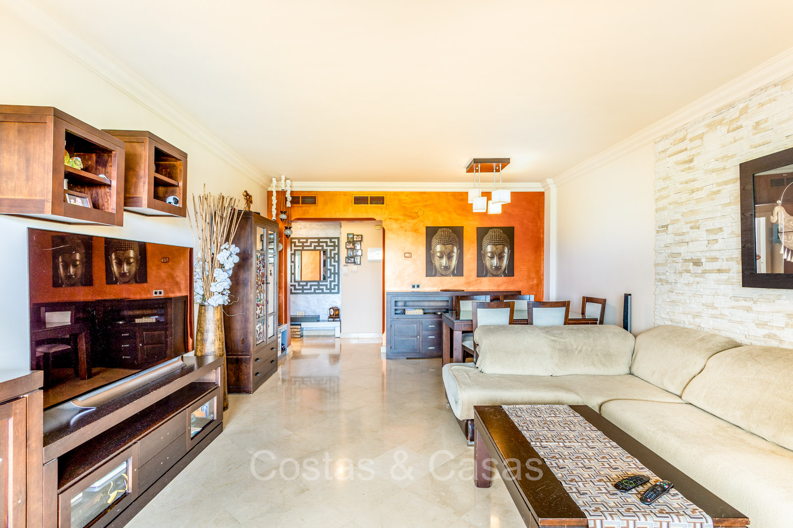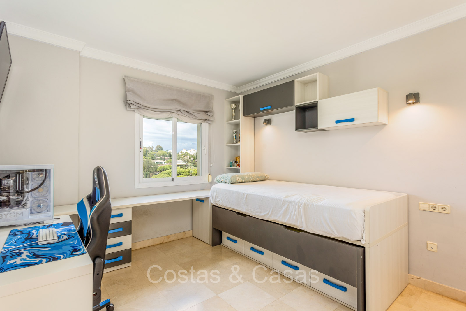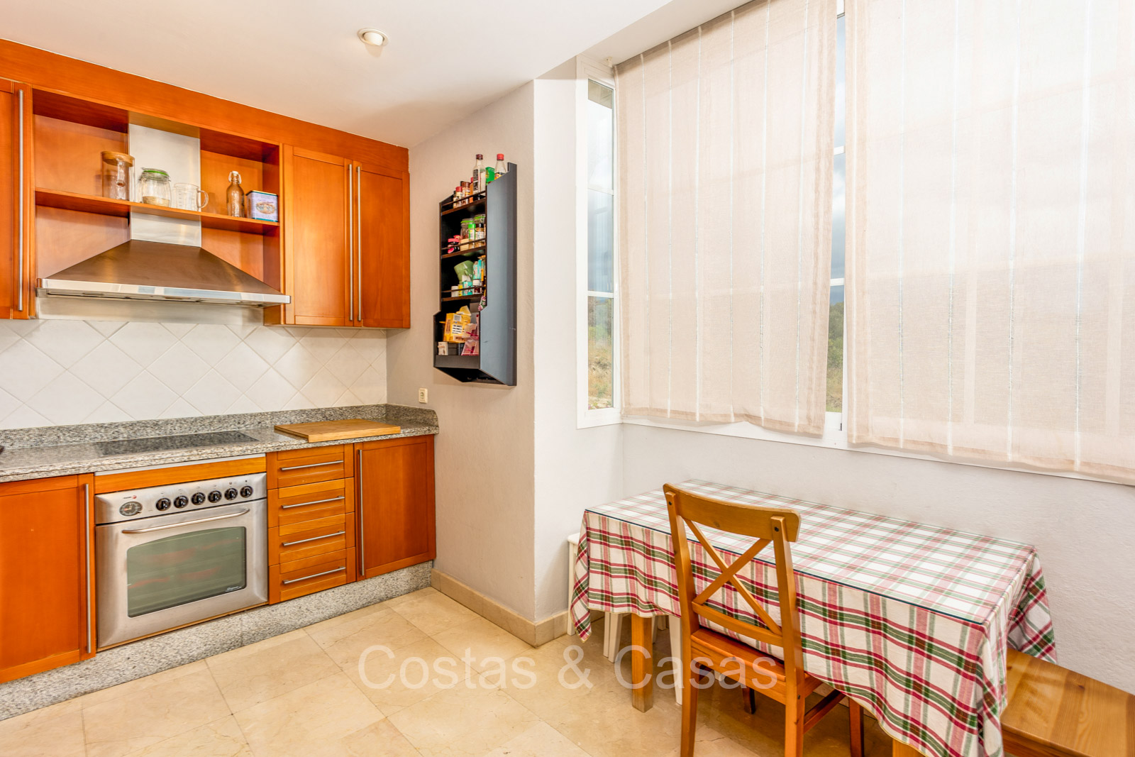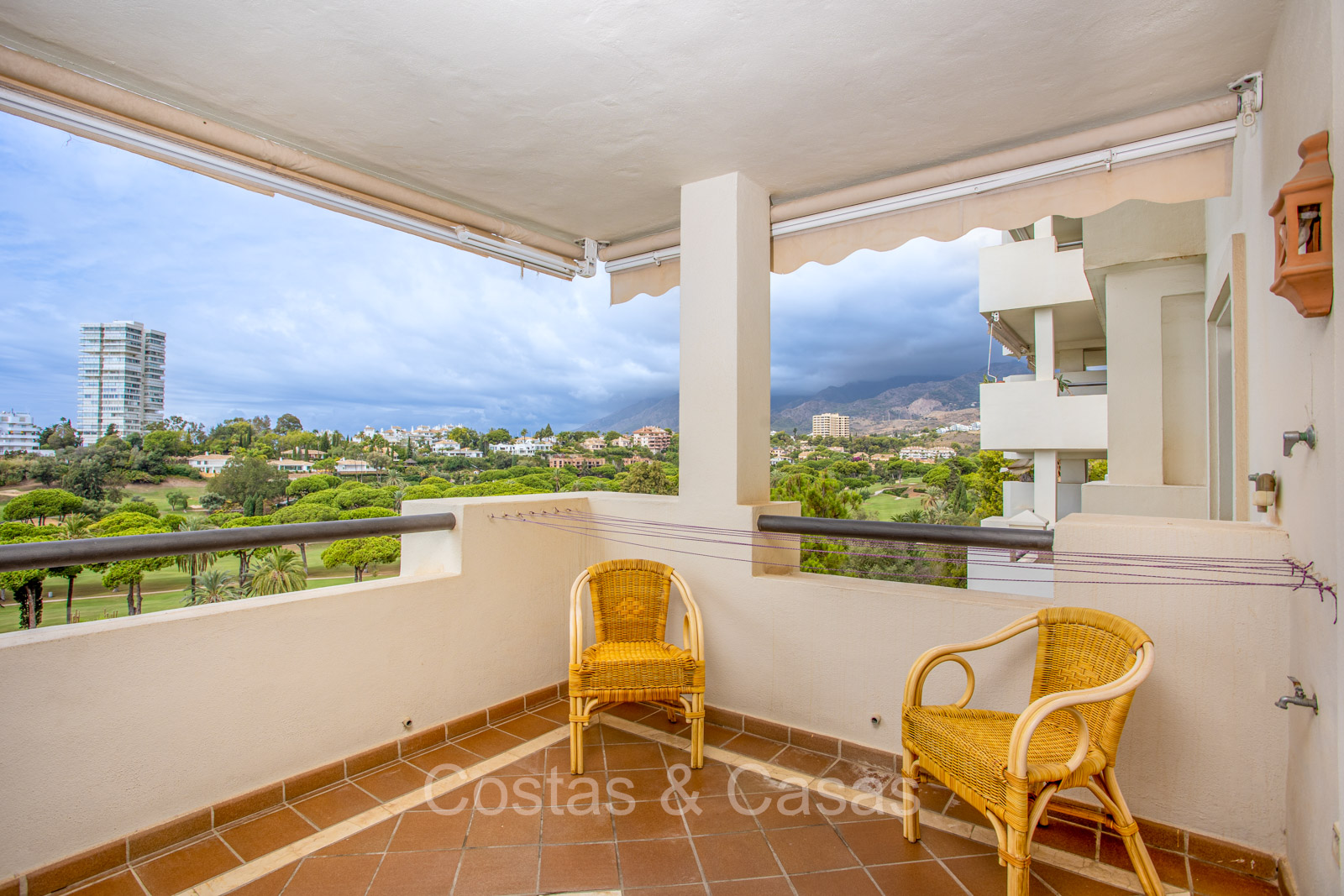 Appartement intermédiaire spacieux dans un excellent complexe de golf. Utilisation de matériaux de haute qualité. Orienté sud-ouest. Vues imprenables sur les terrains de golf, les paysages montagneux et la mer Méditerranée. Espace de vie confortable et ouvert avec salon TV et salle à manger intégrée. Les hautes fenêtres coulissantes laissent entrer la lumière naturelle et donnent accès à la terrasse couverte. Cuisine fermée et entièrement équipée avec une buanderie attenante. 2 chambres, 2 salles de bains. Sols en carrelage en marbre. Garage intérieur pour 1 voiture inclus.