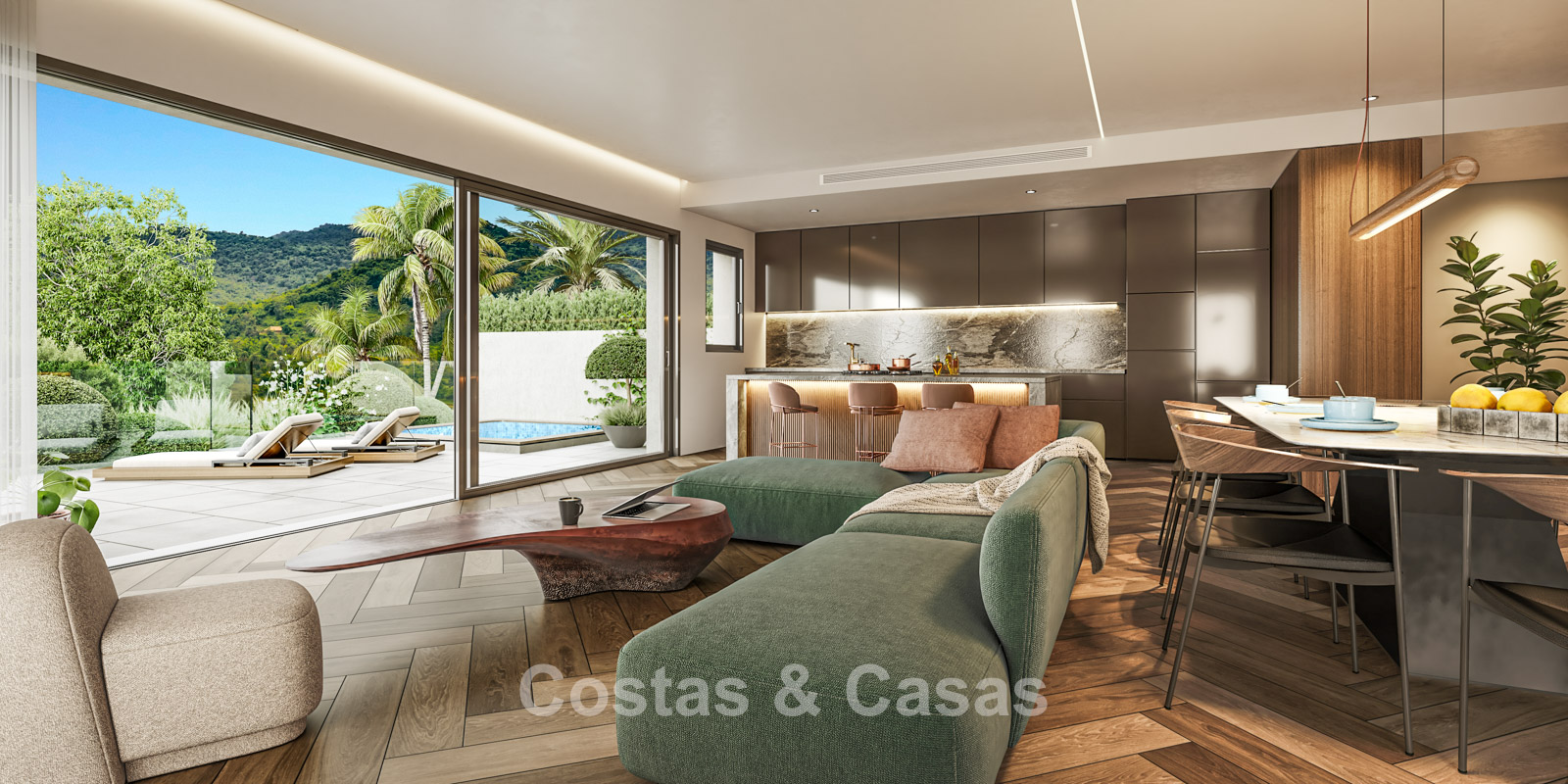 Programme exclusif composé de seulement 16 appartements de luxe à la pointe de la technologie. La construction respecte les normes les plus élevées en matière d’efficacité énergétique et de durabilité. Superbes vues sur l’environnement naturel, les parcours de golf et/ou la mer Méditerranée. Les penthouses disposent de vastes terrasses sur le toit avec piscine privée. Les appartements en rez-de-chaussée bénéficient d’un jardin privé avec piscine. Les espaces extérieurs se fondent harmonieusement avec l’intérieur grâce à de grandes baies vitrées coulissantes à profils encastrés. Les espaces de vie sont conçus avec une disposition ouverte et généreuse pour une sensation d’espace optimale. Cuisine haut de gamme entièrement équipée avec électroménagers premium, îlot central et design contemporain. Chaque logement dispose de son propre espace de rangement. Parking souterrain avec accès direct par ascenseur.