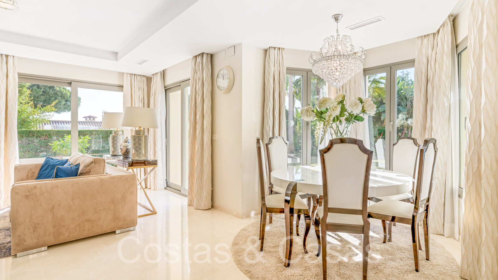 Villa individuelle de style architectural espagnol traditionnel. Fini avec des matériaux de haute qualité. De grandes fenêtres offrent un intérieur très lumineux. Grand espace de vie ouvert avec salon TV et coin repas intégré. Cuisine entièrement équipée avec des appareils modernes et un îlot de cuisson où vous pouvez vous asseoir. 5 chambres, 5 salles de bains et 2 toilettes séparées. Sols en marbre. A l’étage inférieur se trouve une pièce aménagée en logement d'hôtes avec sa propre kitchenette. Garage intérieur pour 2 voitures.