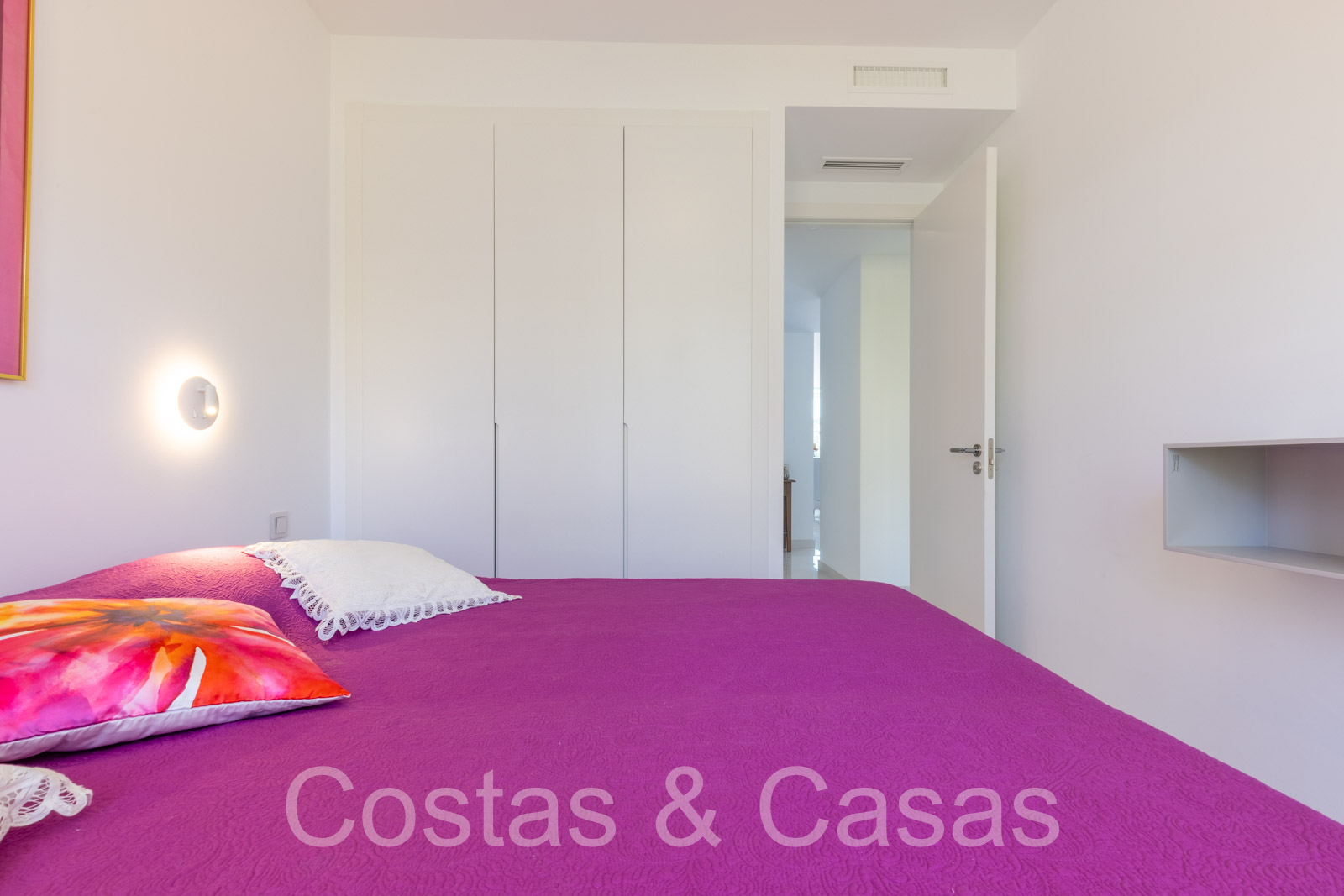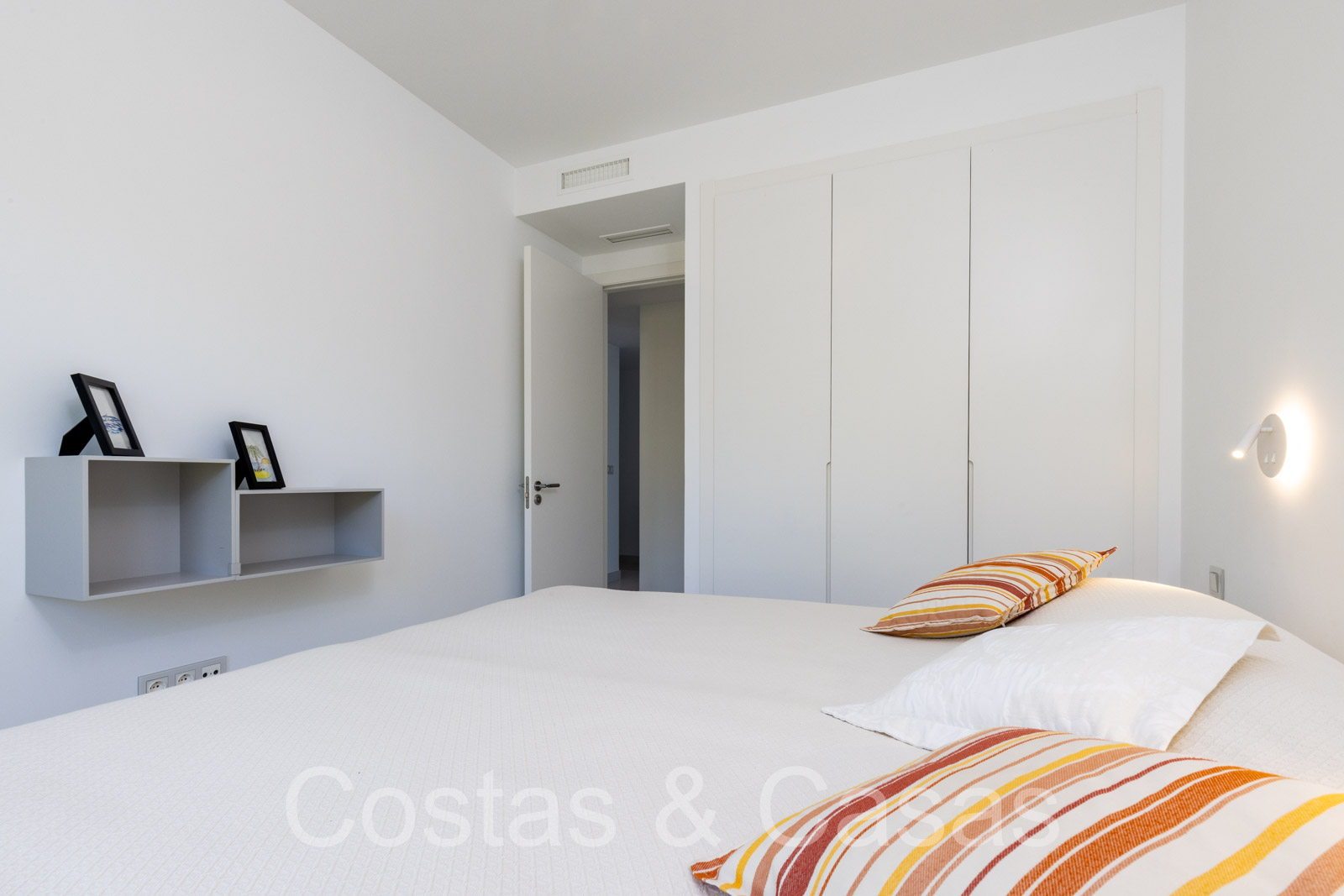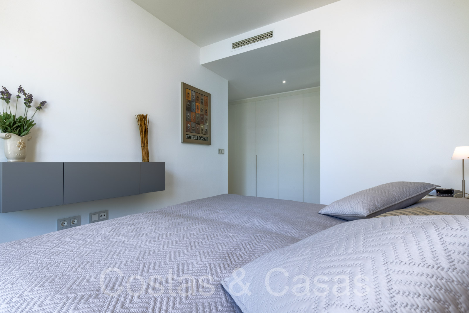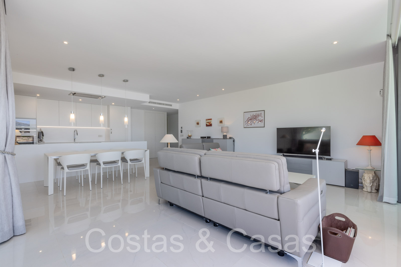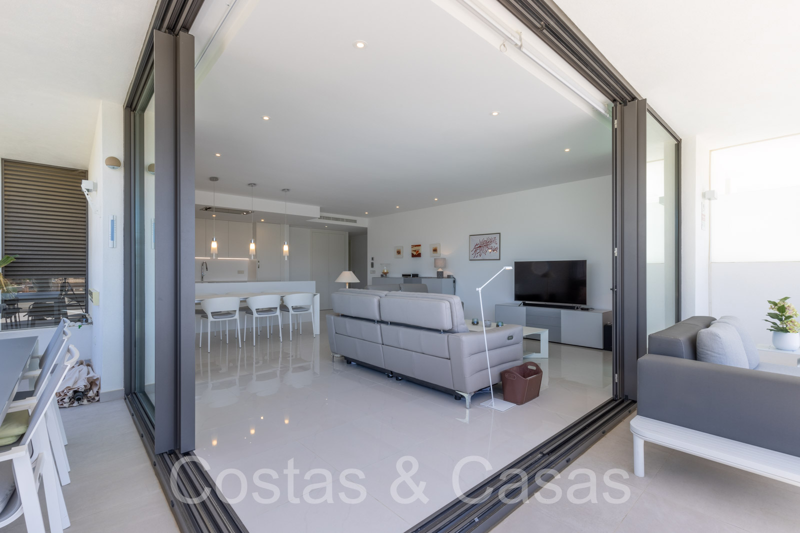 Les principales caractéristiques: Fenêtres coulissantes en aluminium du sol au plafond et une spacieuse terrasse d'angle semi-ouverte. Profils de fenêtre encastrés pour une transition presque transparente entre l'intérieur et l'extérieur. Dans l'appartement d'angle, les fenêtres coulissantes peuvent être ouvertes pour créer un coin complètement ouvert et les espaces intérieur et extérieur se fondent en un tout. Terrasse flottante. Sols en carrelage en porcelaine. Balustrades en verre sans rebord. Éclairage LED indirect sur la terrasse. Cuisine ouverte de Porcelanosa. Îlot de cuisine avec plan de travail en KRION. Hotte aspirante au plafond. Buanderie avec étagères. Lave-linge et sèche-linge Siemens.
