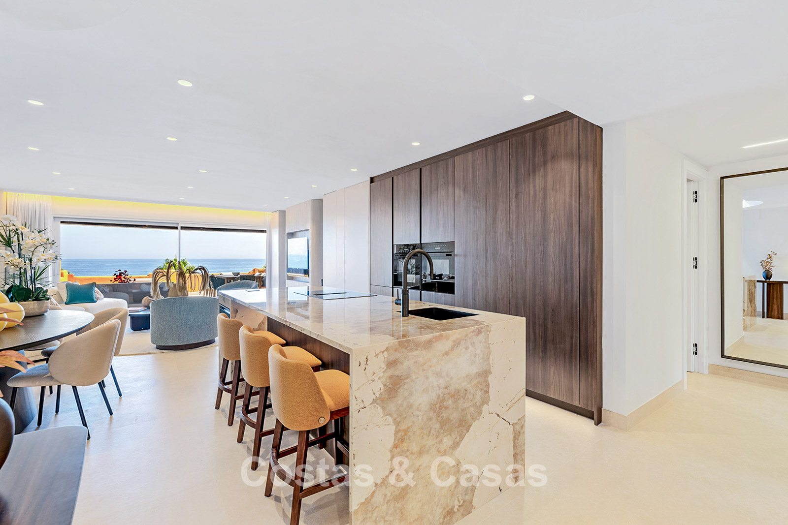Appartement élégamment rénové avec des matériaux haut de gamme. Finitions haut de gamme. Orientation sud-ouest. Vue spectaculaire sur la mer Méditerranée. La spacieuse terrasse couverte s'intègre harmonieusement à l'intérieur et comprend un salon chaleureux et une salle à manger confortable. Intérieur lumineux et aéré, avec un espace ouvert. Cuisine design et neuve, ouverte et équipée d'appareils électroménagers Miele et d'un îlot central. 4 chambres, 3 salles de bains. La suite parentale dispose d'une salle de bains ouverte avec baignoire îlot, d'un dressing spacieux et d'un accès direct à la terrasse privée. De plus, une pièce séparée a été aménagée en bureau confortable. Carrelage grand format de haute qualité. Buanderie équipée avec appareils électroménagers Miele.