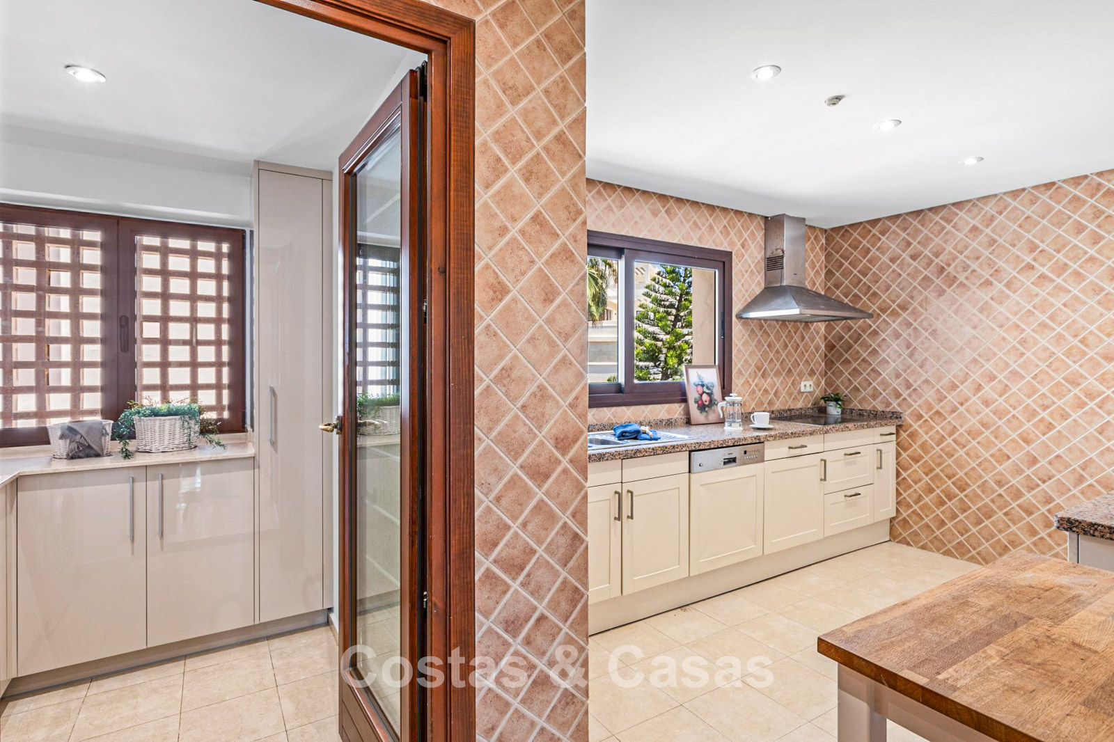 Spacieux penthouse de deux étages avec toit-terrasse, construit avec des matériaux de haute qualité. Matériaux de haute qualité. 3 vastes terrasses ensoleillées, dont une de 60 m², sont équipées d'une cuisine extérieure et d'un coin repas pour des repas conviviaux en plein air. Orientation sud. Magnifiques vues sur les jardins tropicaux et la mer Méditerranée. De grandes fenêtres laissent entrer la lumière naturelle. Spacieux salon avec cheminée et salle à manger attenante. Cuisine entièrement équipée avec buanderie. L'appartement comprend 3 chambres, 3 salles de bain et des toilettes invités. Sols en marbre. Débarras. Places de parking intérieures pour 2 voitures.