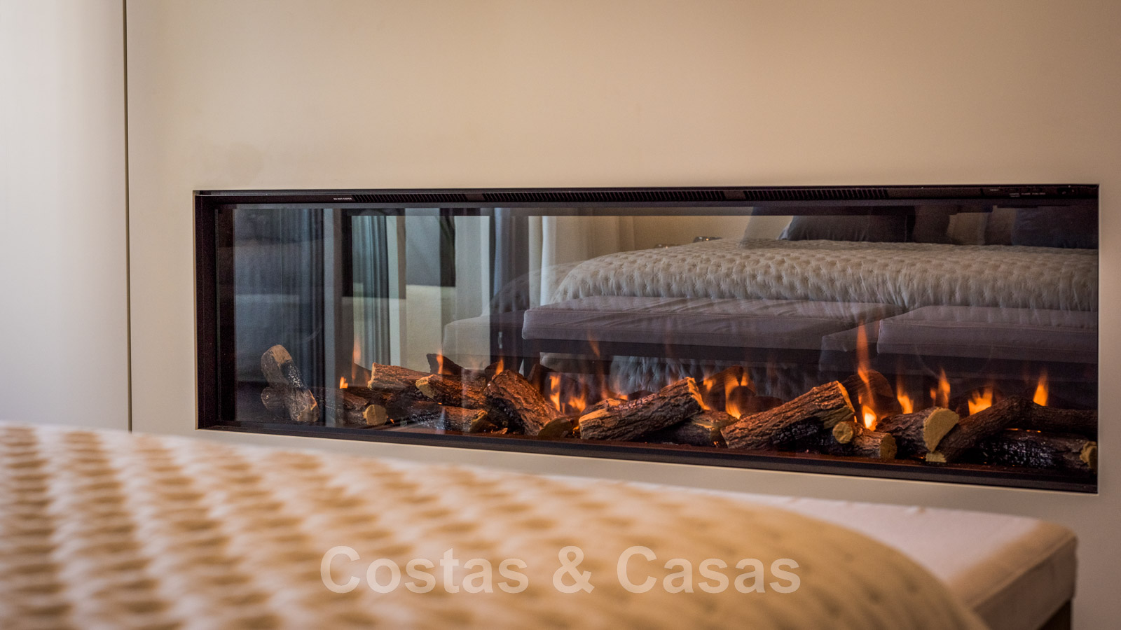 Chambre principale avec salle de bain attenante, cheminée moderne et accès à la terrasse.