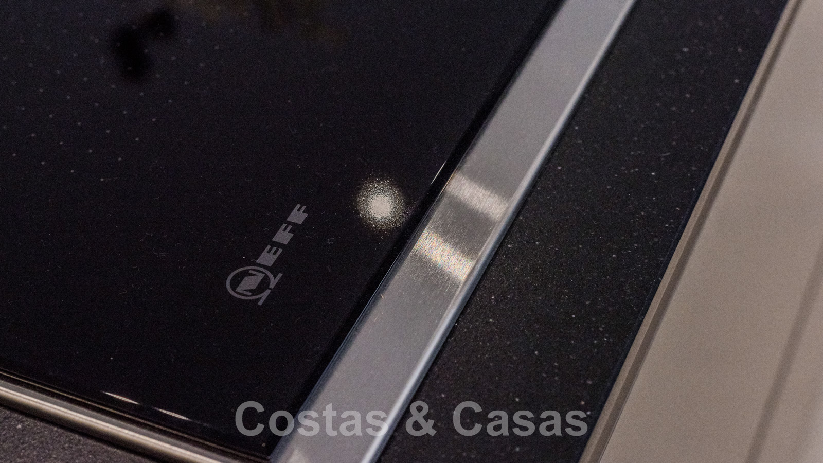 Cuisine moderne, entièrement équipée, avec îlot de cuisson et refroidisseur de vin.