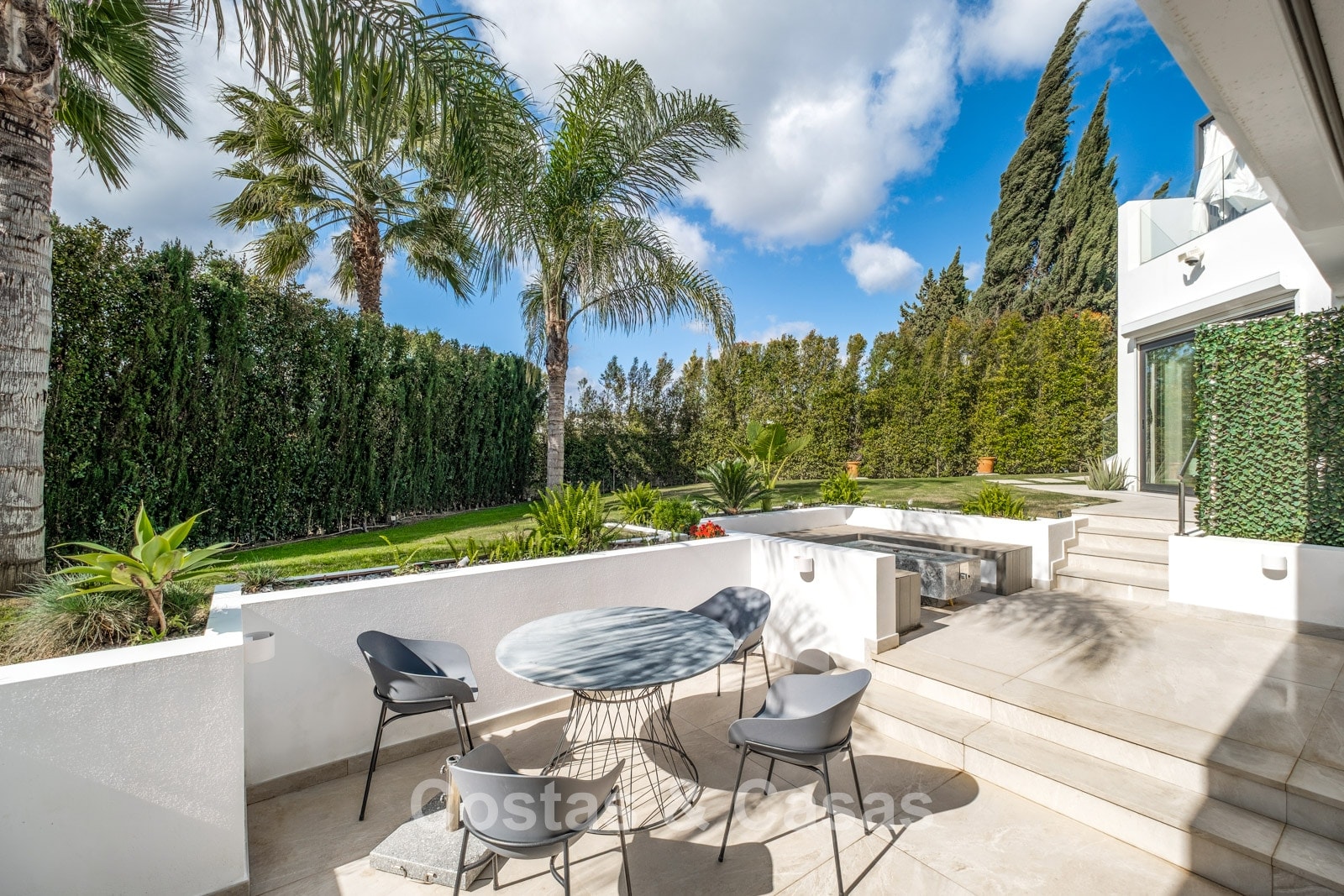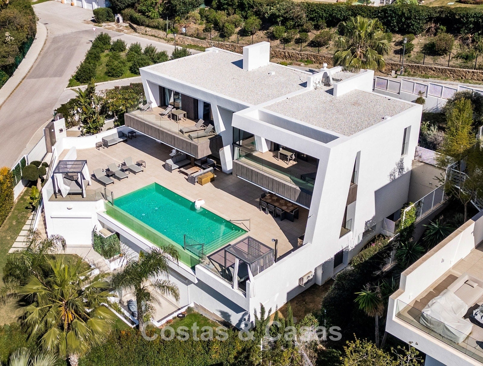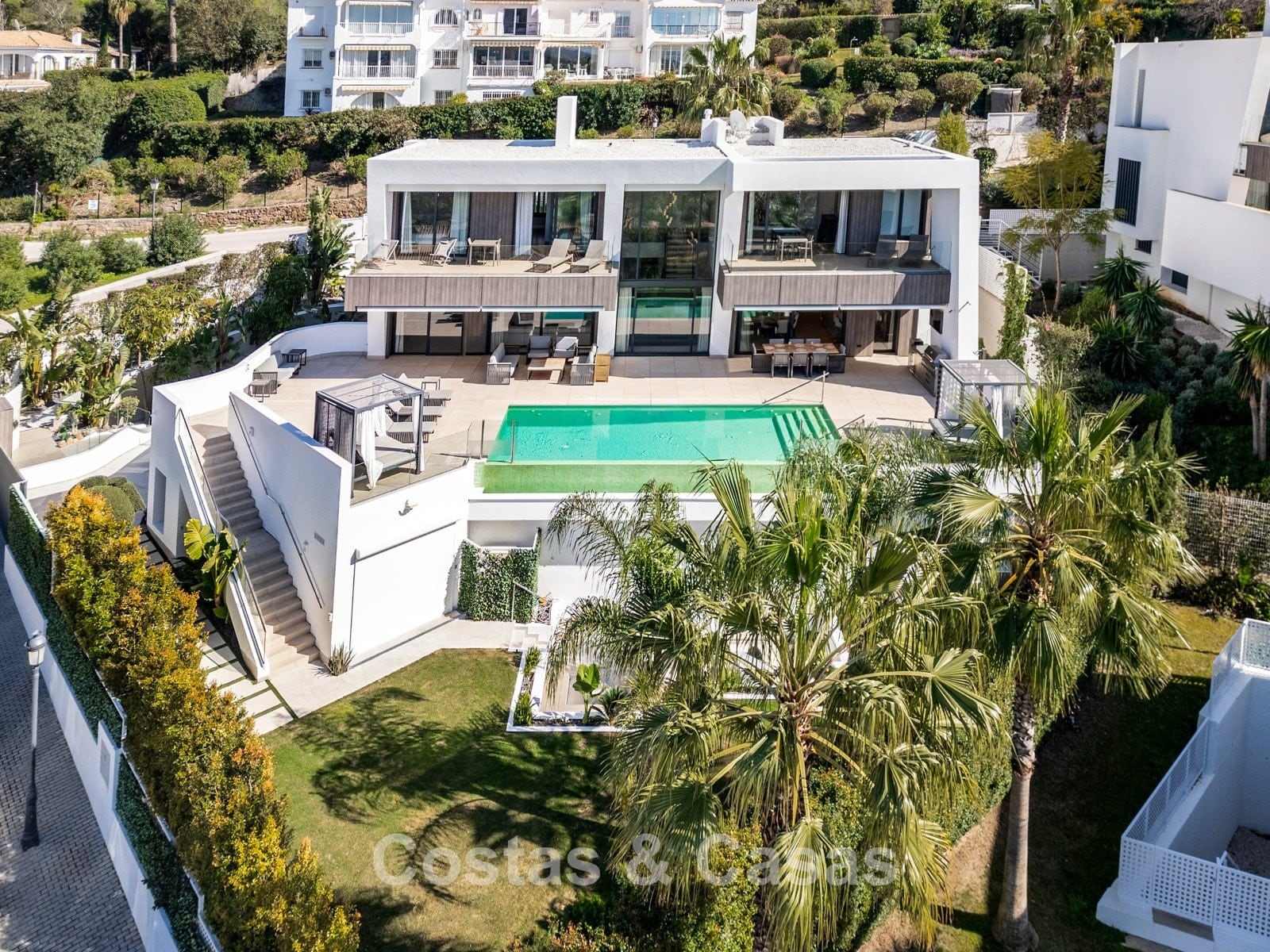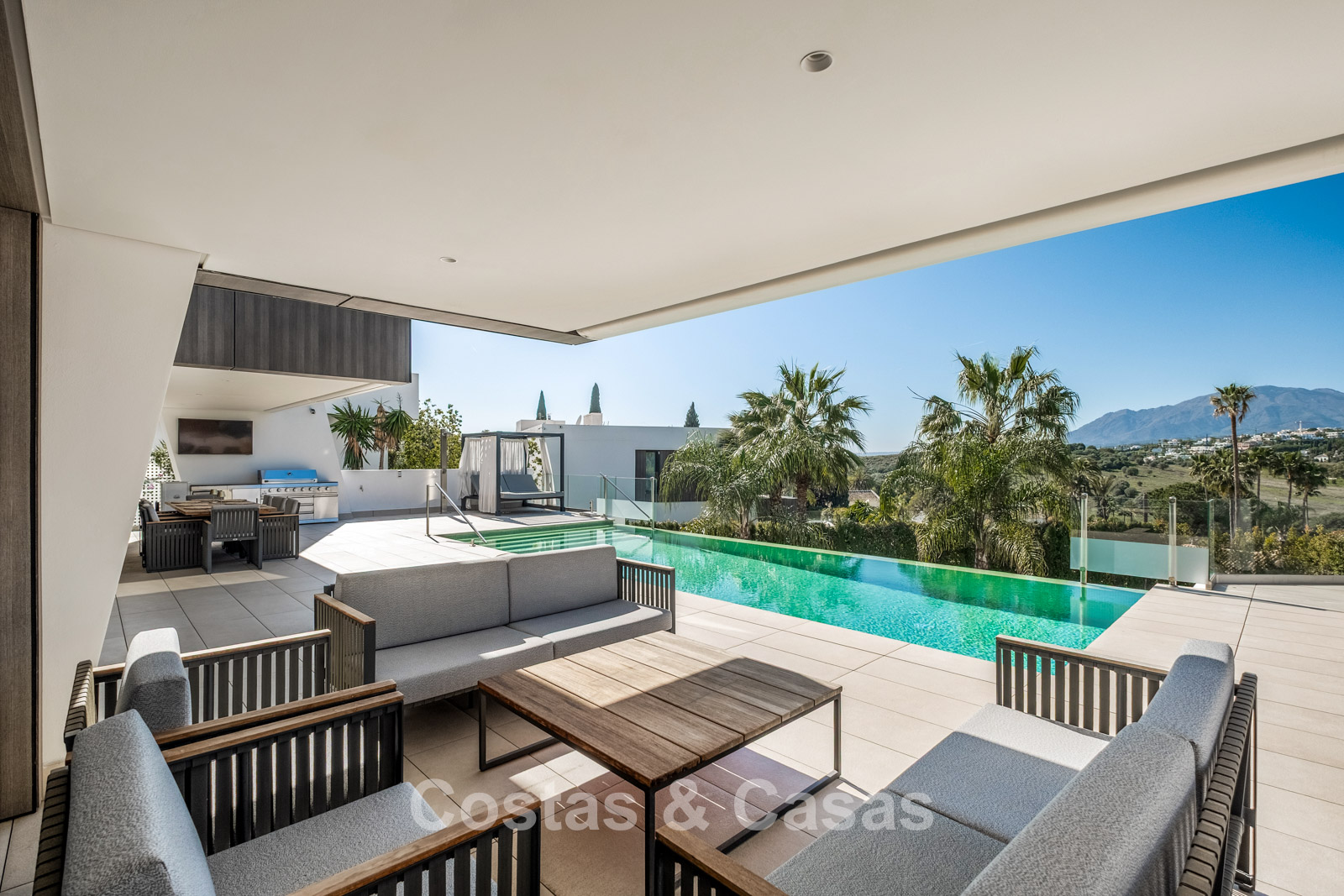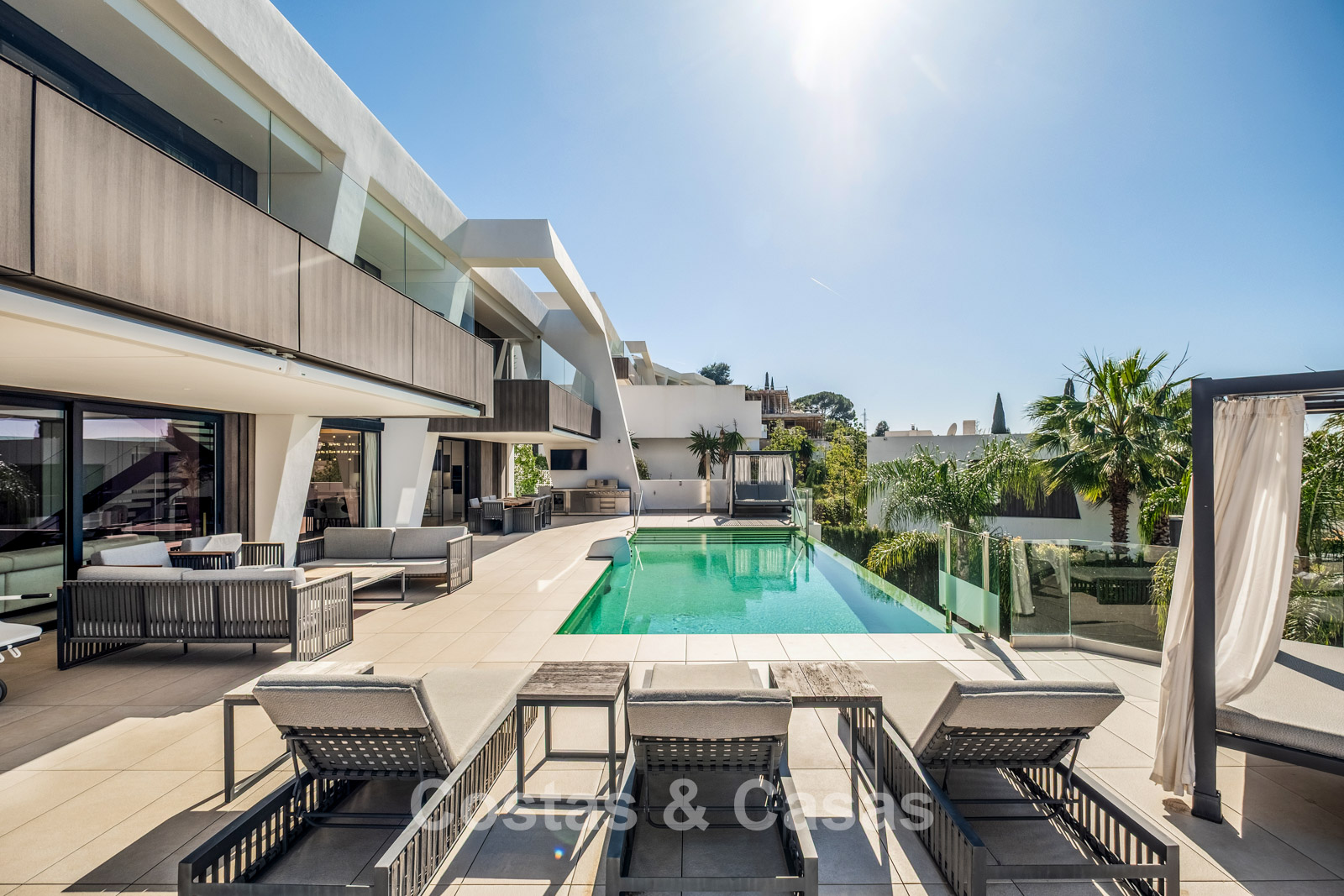 Terrain paysager entièrement clos garantissant l’intimité. Jardin méditerranéen parfaitement entretenu. Terrasses avec cuisine extérieure, barbecue, espace repas et zones lounge. Superbe piscine à débordement chauffée pour un usage toute l’année. Orientation sud-ouest.