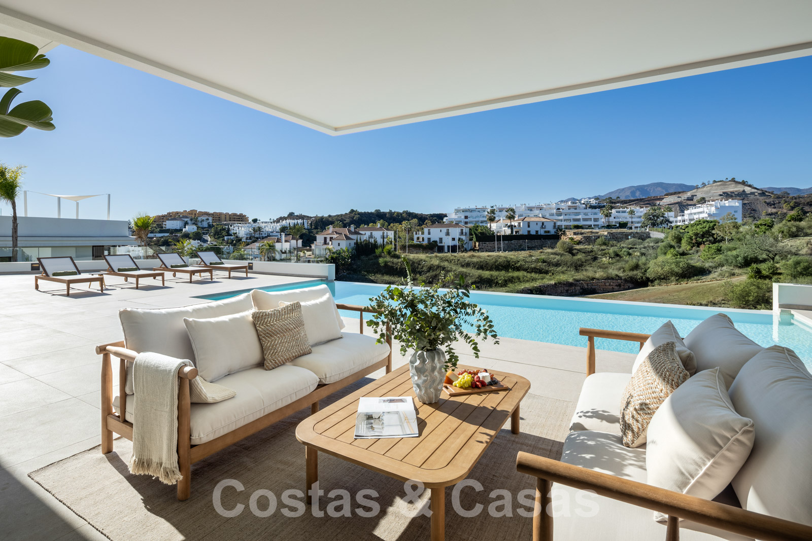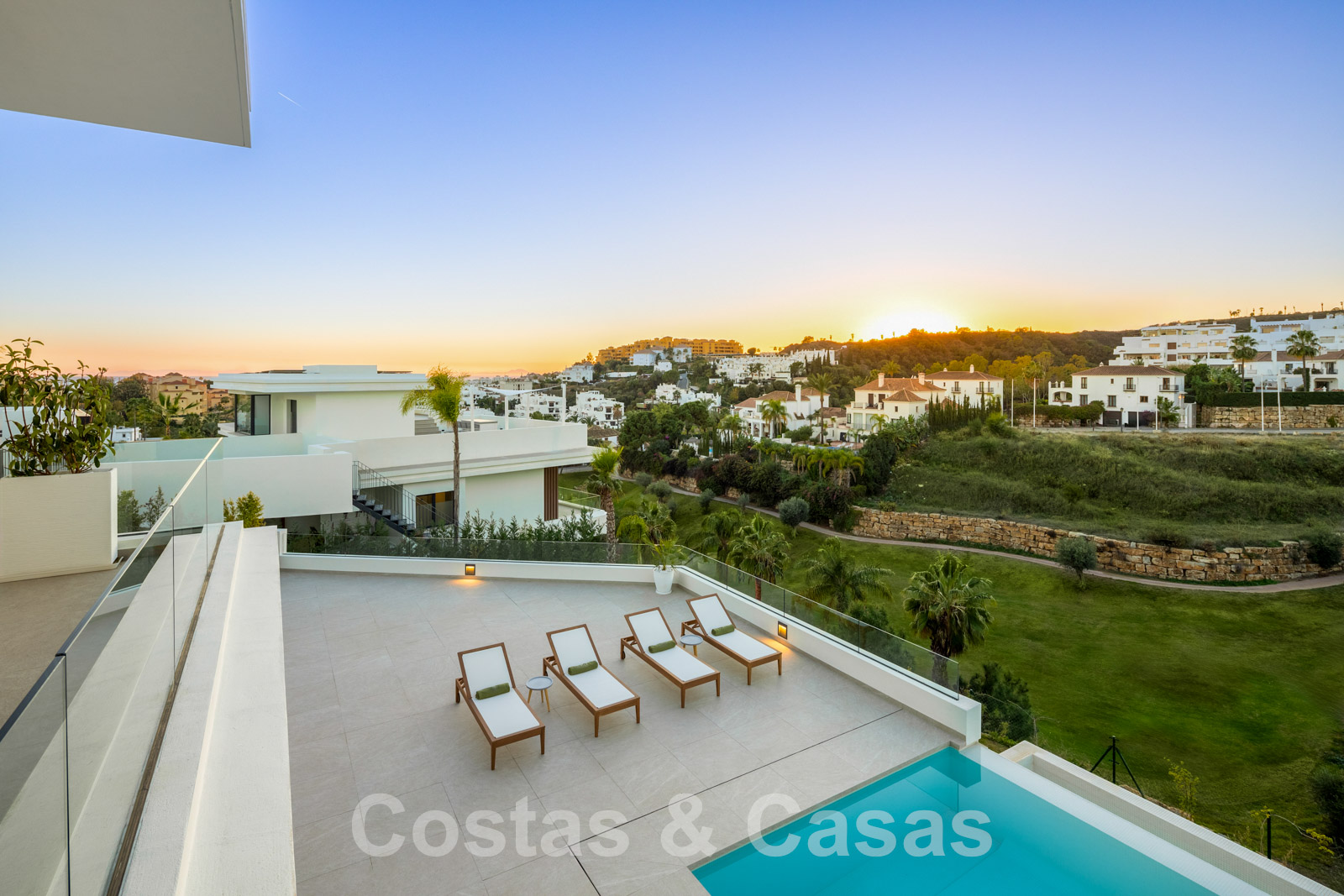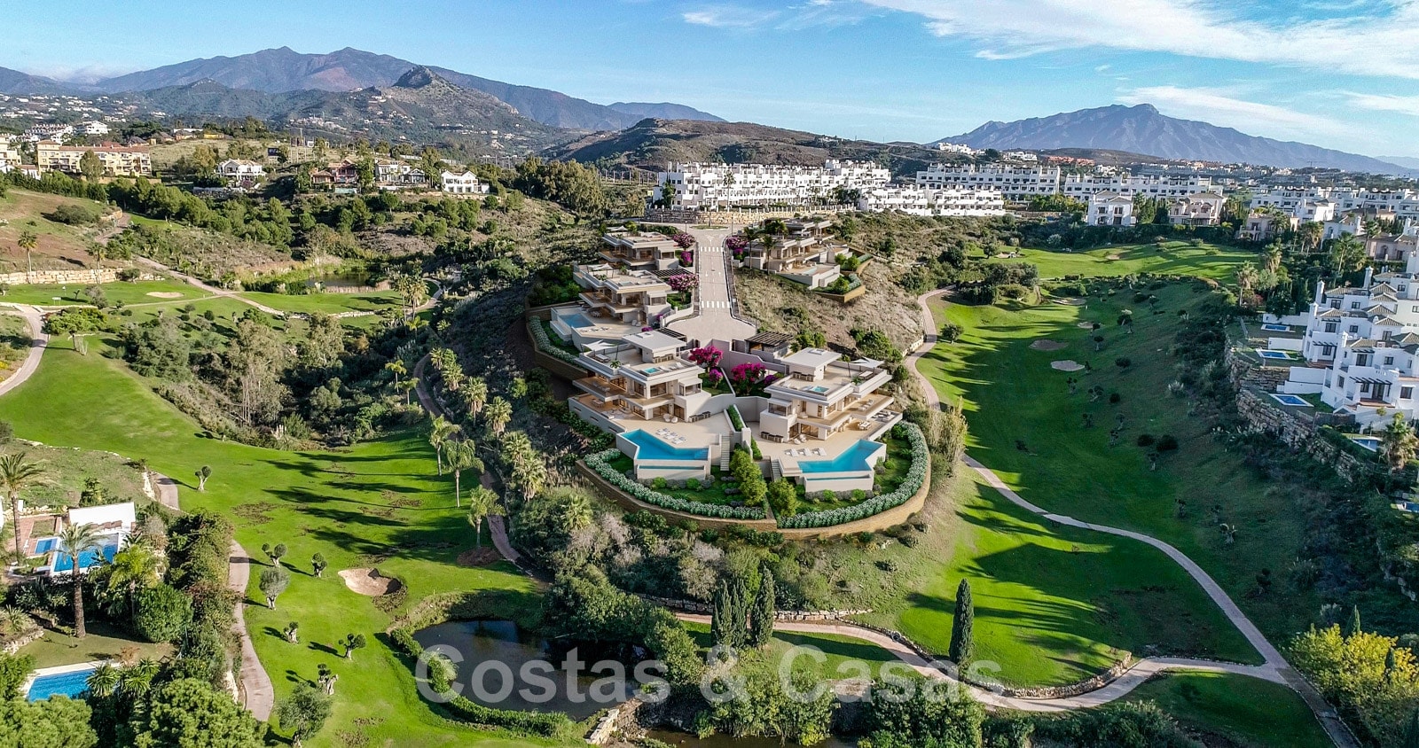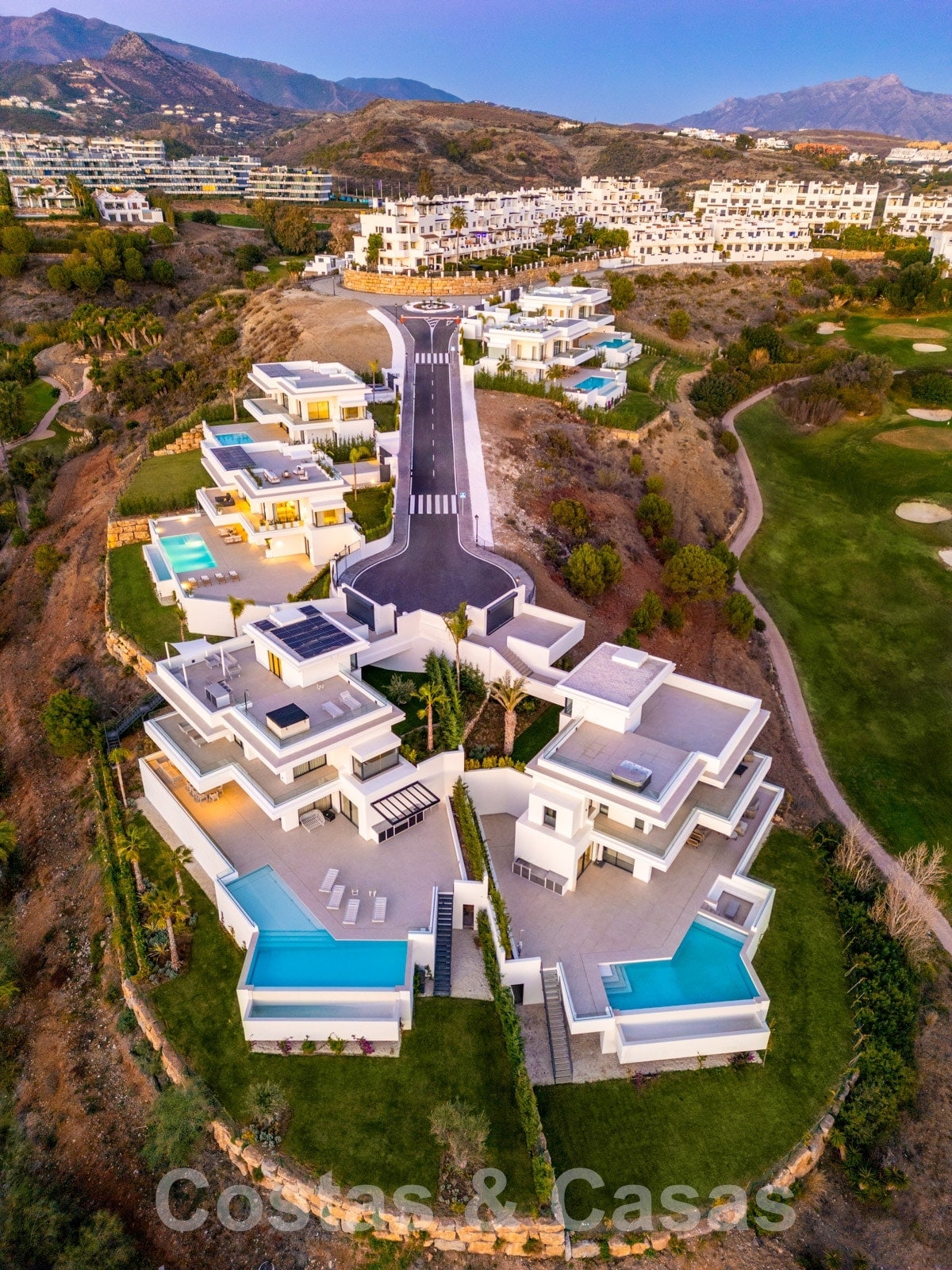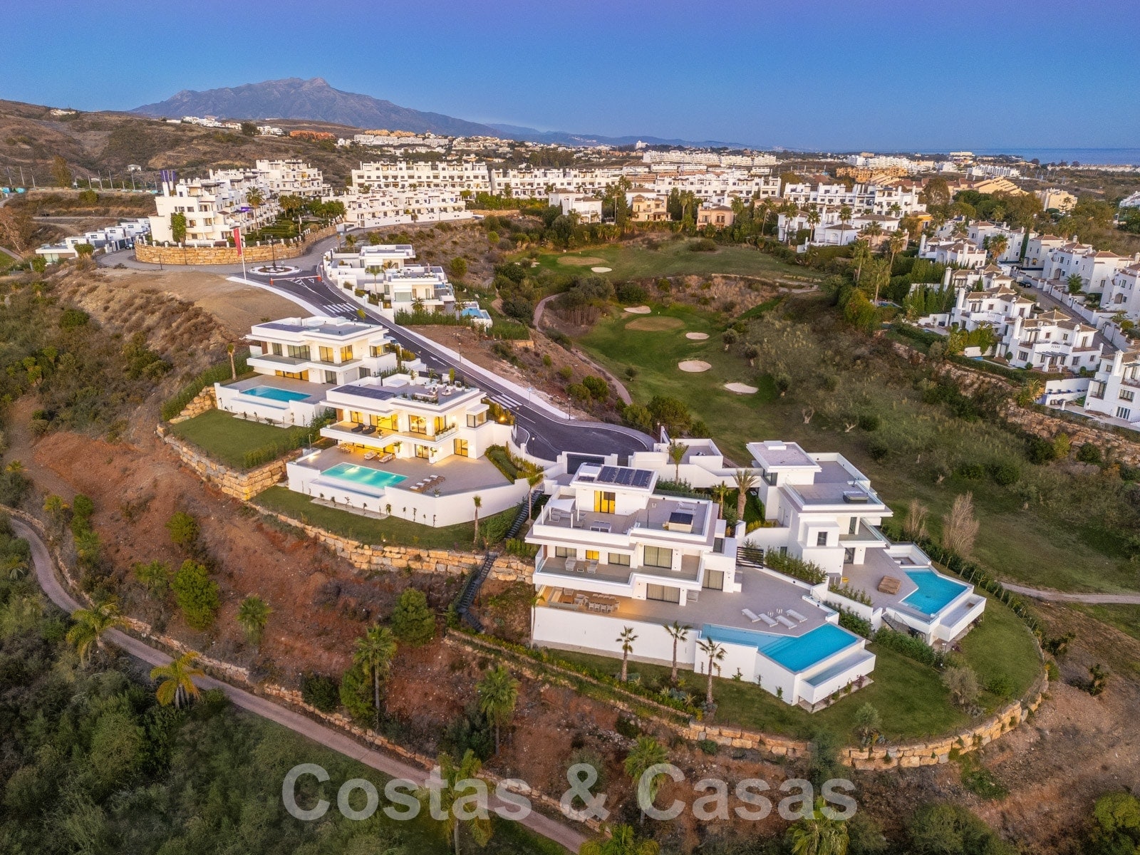 Cette collection de 6 villas de luxe est située au calme dans un cul-de-sac, en position élevée et entourée par le terrain de golf. Toutes les commodités nécessaires peuvent être atteintes en quelques minutes. À 5 minutes en voiture de la plage et un peu plus en avant, le luxueux complexe 5 étoiles Kempinski Resort. Le centre historique d'Estepona et la marina pittoresque de Puerto Banus avec ses nombreuses boutiques de luxe sont à 15 minutes de route.