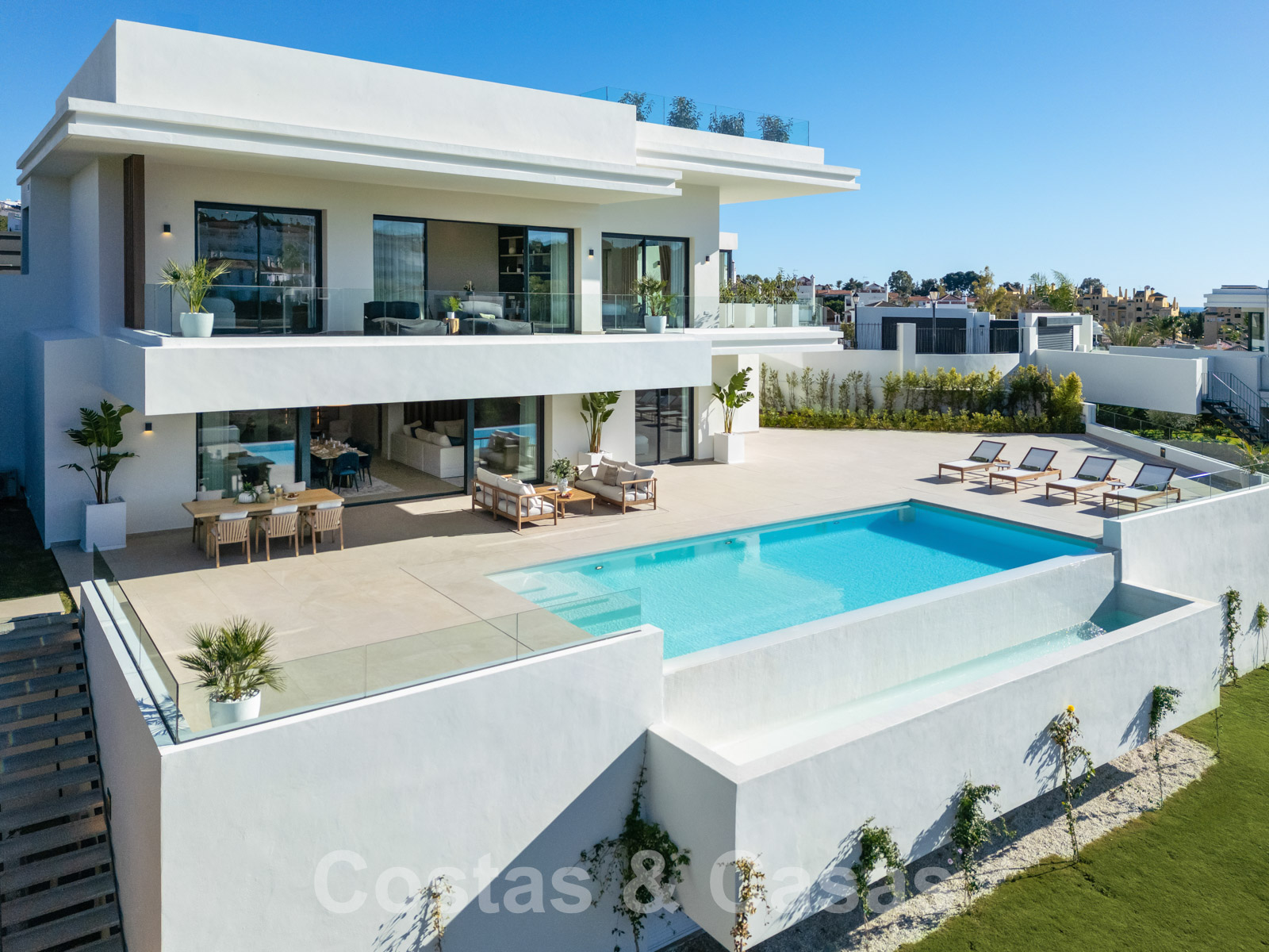 Parcelle surélevée. Jardin entretenu. Pavillon sur le solarium avec une grande table à manger. Spacieuse piscine à débordement avec eau salée. Jacuzzi sur le solarium. Terrasses ouvertes et couvertes offrant des possibilités de relaxation. Cuisine extérieure avec coin barbecue. Vue panoramique à couper le souffle sur les paysages de montagne et la mer Méditerranée.