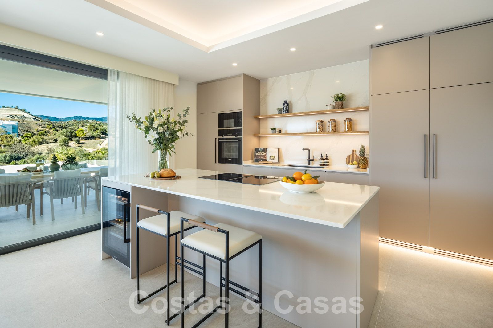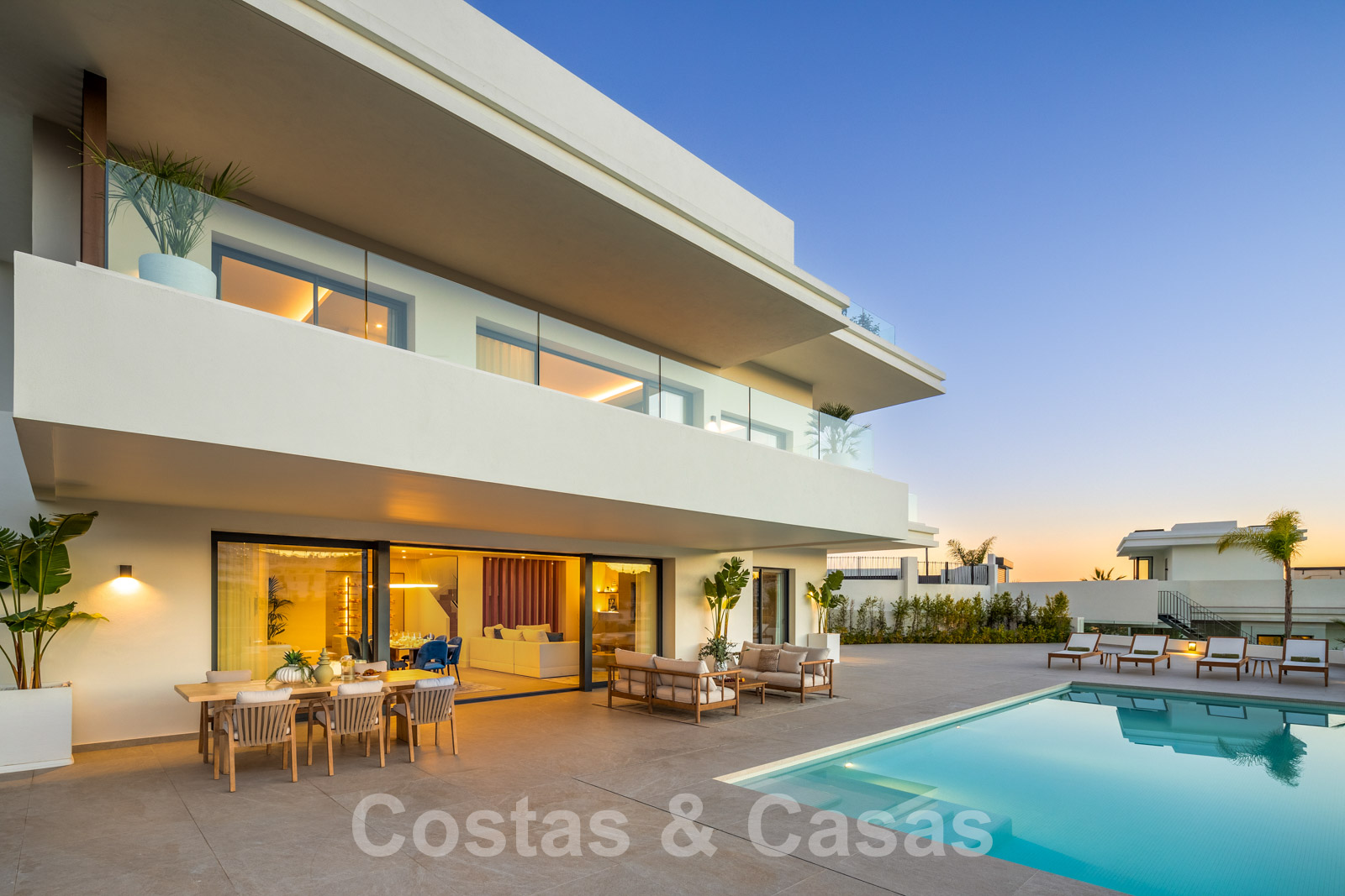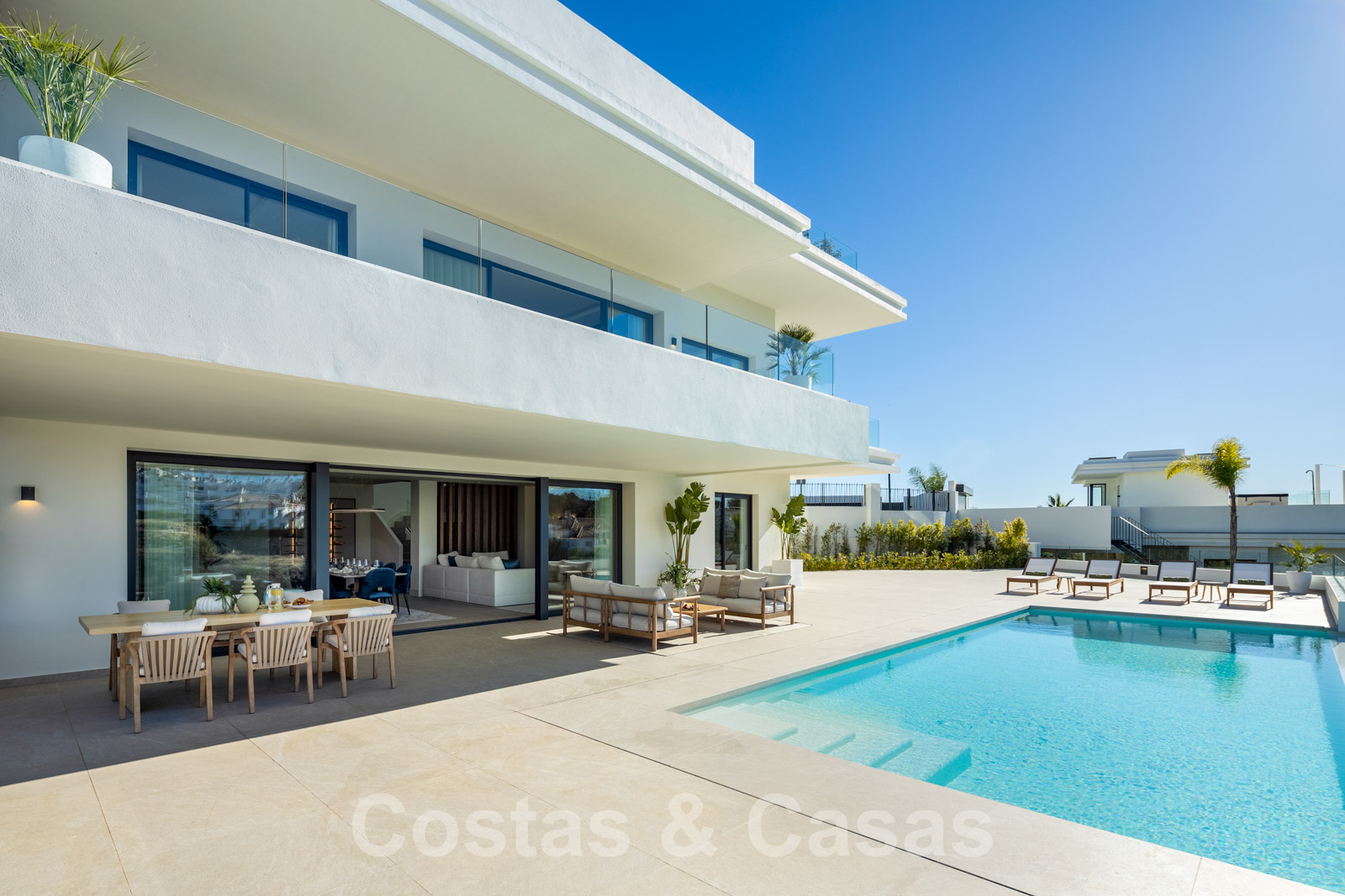 Nouvelle villa individuelle de luxe de style contemporain. Construite avec des matériaux très exclusifs et avec le souci du détail. Un intérieur élégant avec un design ouvert. La combinaison d'espaces ouverts et de grandes fenêtres coulissantes offre une lumière naturelle et une ventilation abondantes. Revêtement de sol intérieur et extérieur en porcelaine, de couleur beige. 4 chambres, 3, 4 ou 5 salles de bain.
