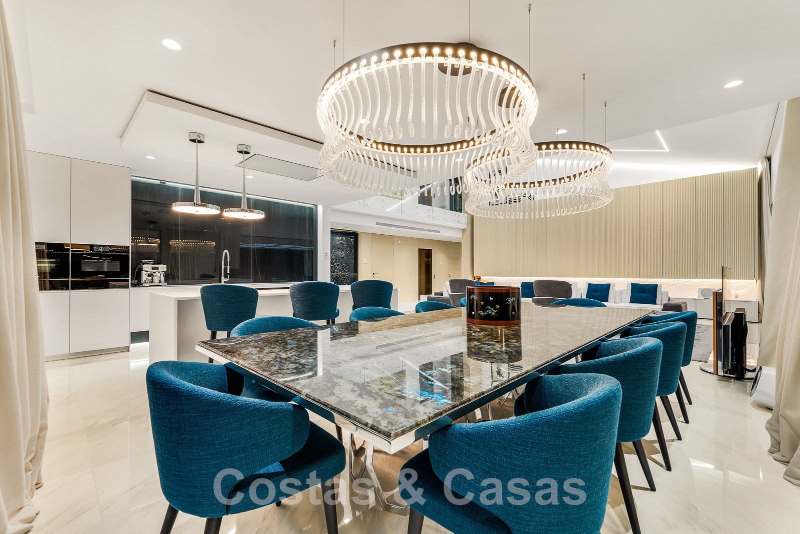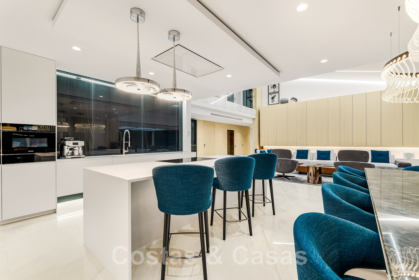 Agencement ouvert avec salon et salle à manger avec cuisine moderne avec appareils Miele.