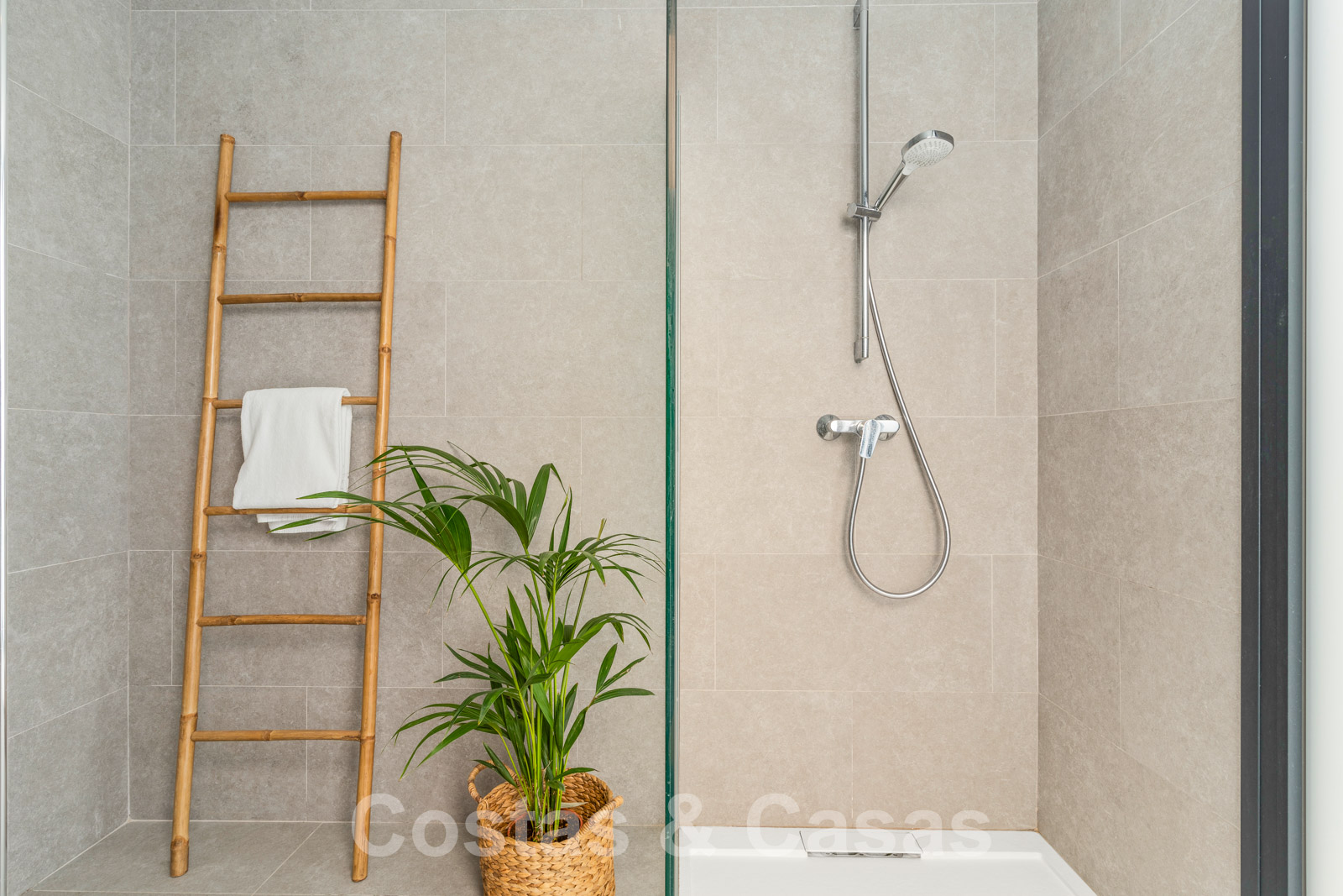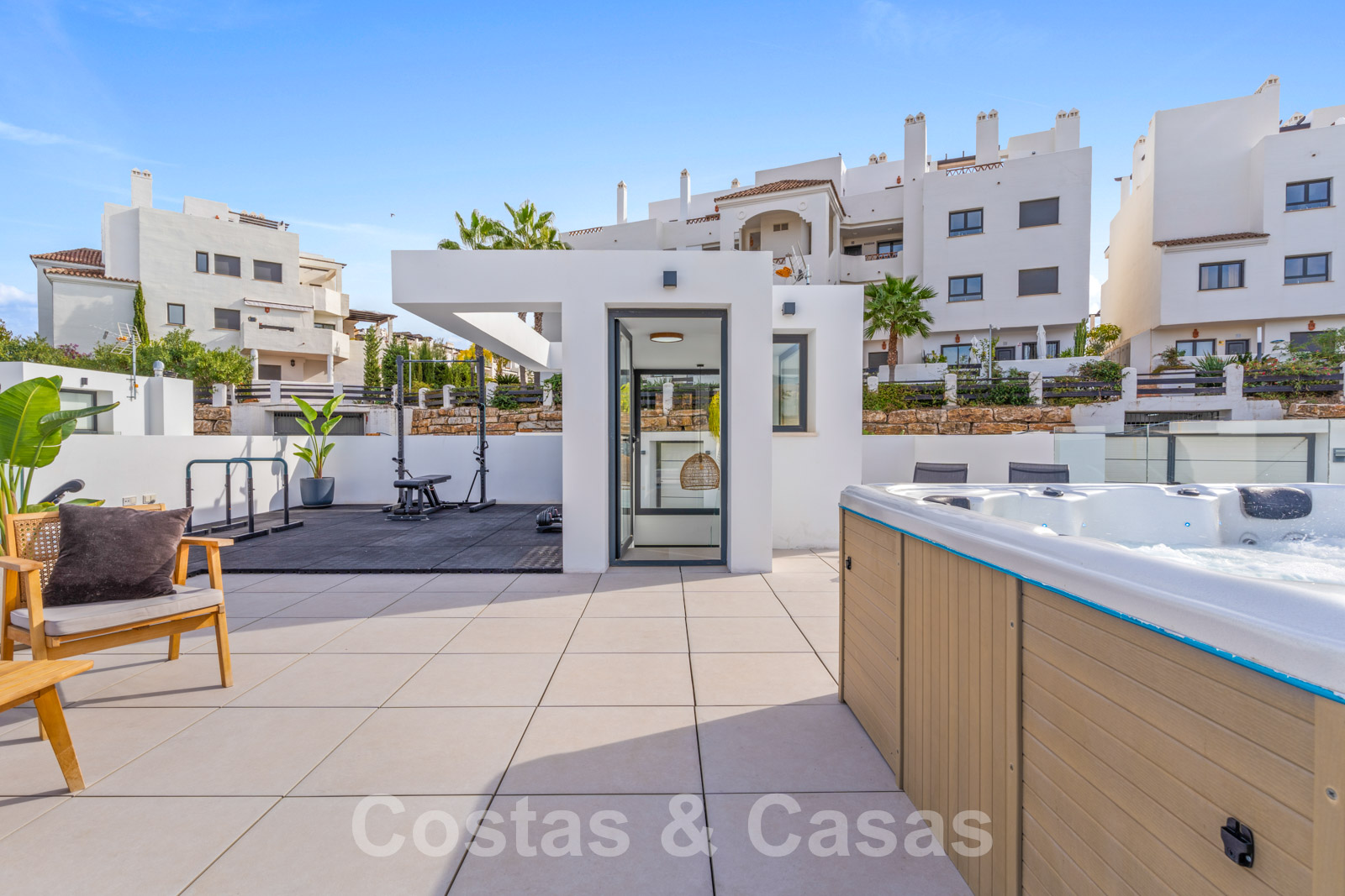 Climatisation. Sols carrelés de couleur crème. Balustrades en verre autour de la terrasse. Barbecue. Eclairage LED. Douche extérieure.