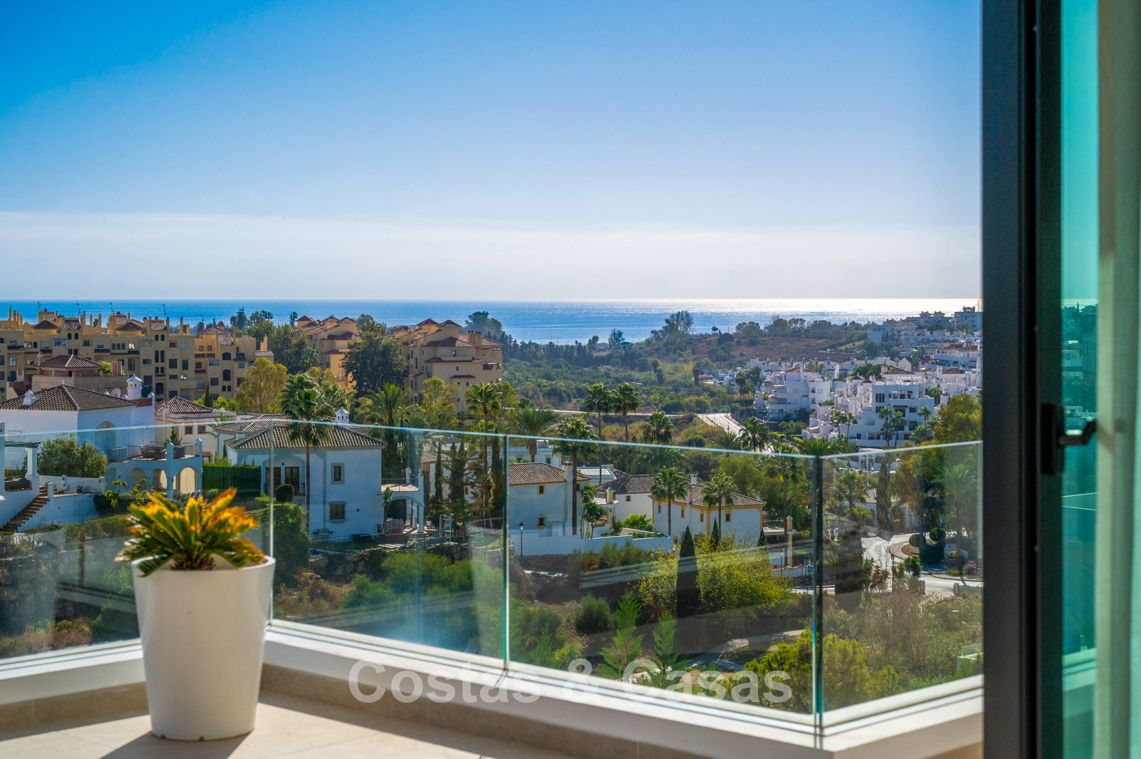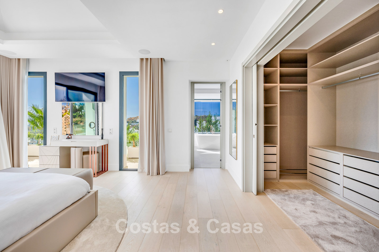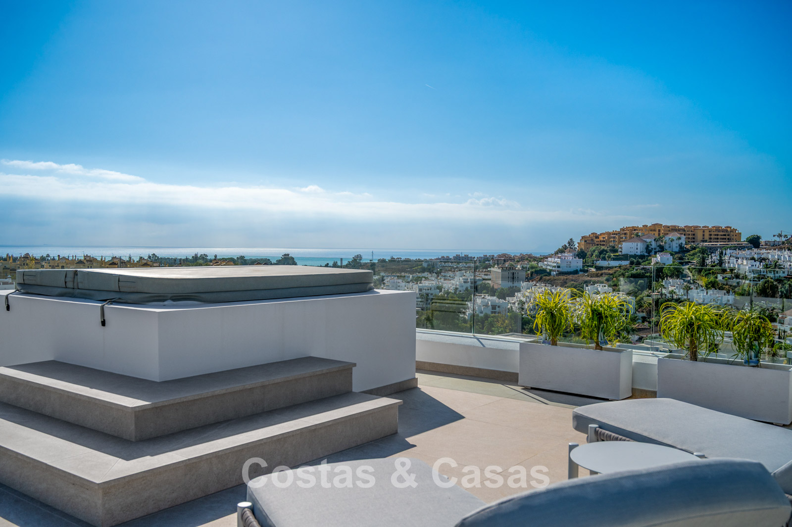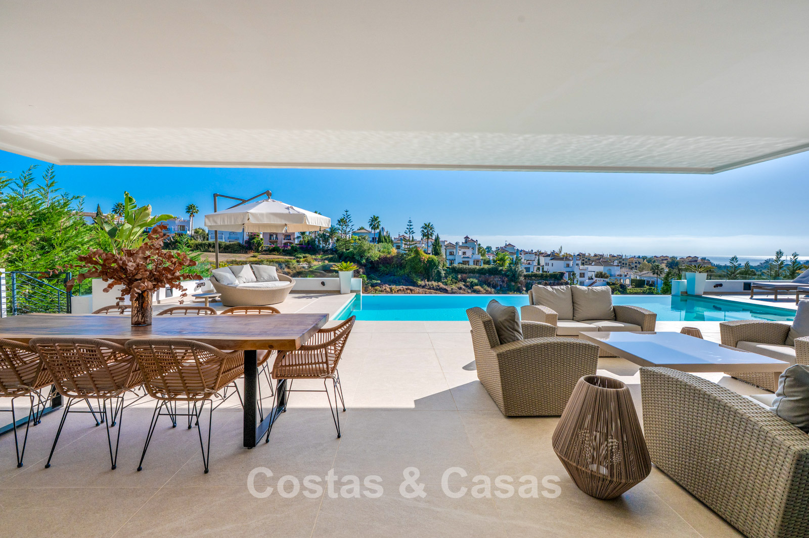 Grand terrain surélevé en bordure du golf Jardin paysager soigné avec végétation tropicale Orientation sud-ouest Piscine à débordement au sel entourée de terrasses ensoleillées Spacieux toit-terrasse avec cuisine extérieure entièrement équipée, barbecue intégré, jacuzzi et transats Superbes vues sur le golf et la mer Méditerranée