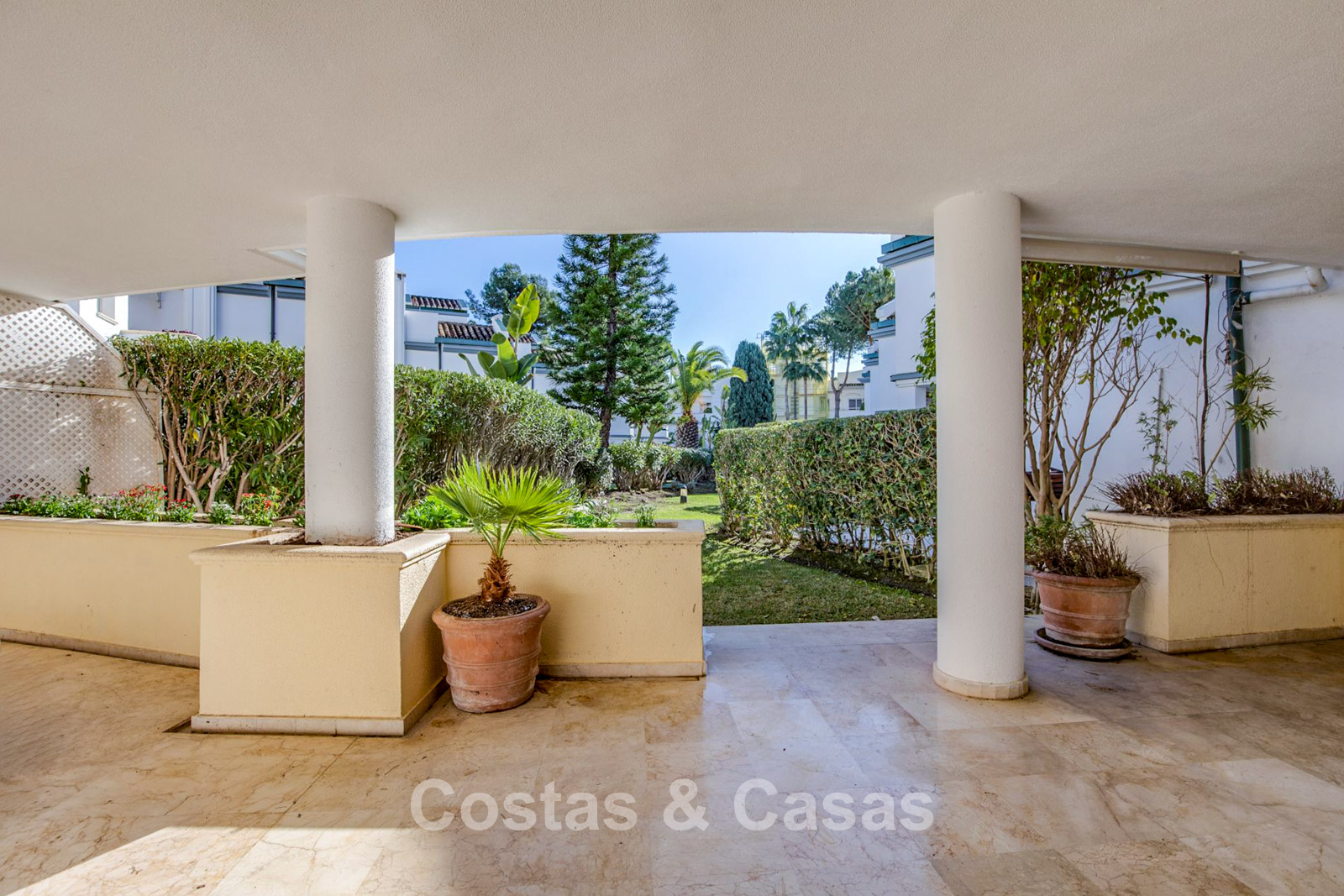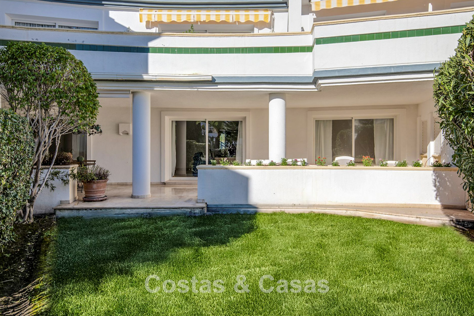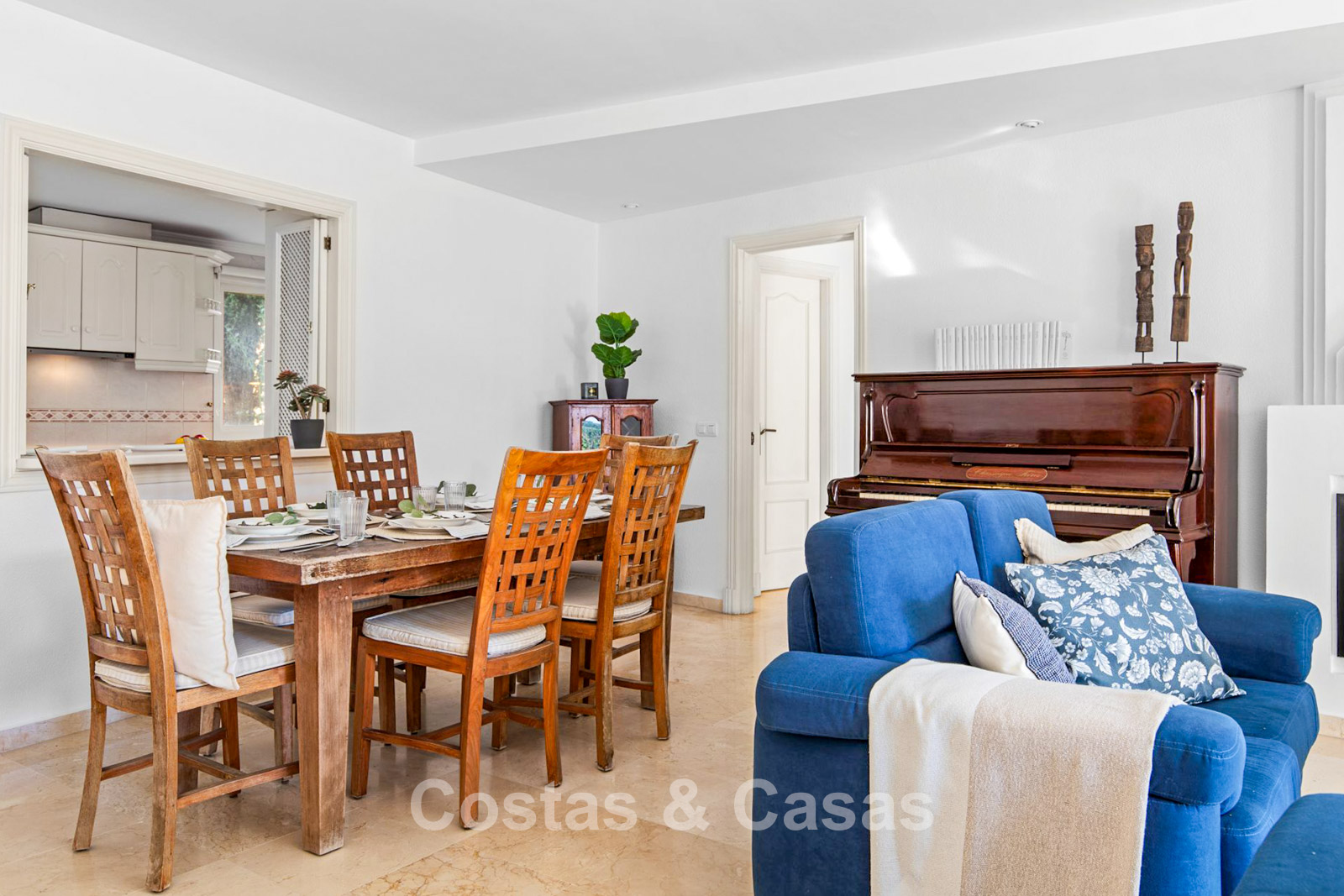 Spacieux appartement en rez-de-chaussée situé dans un complexe balnéaire très prisé. Le bien offre un excellent potentiel de modernisation réfléchie, permettant de l’adapter aux standards contemporains de confort et de design et d’augmenter considérablement sa valeur. Exposition sud. Séjour lumineux avec salon TV et espace repas intégré. L’intérieur s’ouvre harmonieusement sur une grande terrasse et un jardin à usage privé, créant une connexion naturelle entre les espaces intérieurs et extérieurs. Cuisine indépendante entièrement équipée avec une fenêtre donnant sur le séjour. 3 chambres, 3 salles de bains complètes et une toilette.