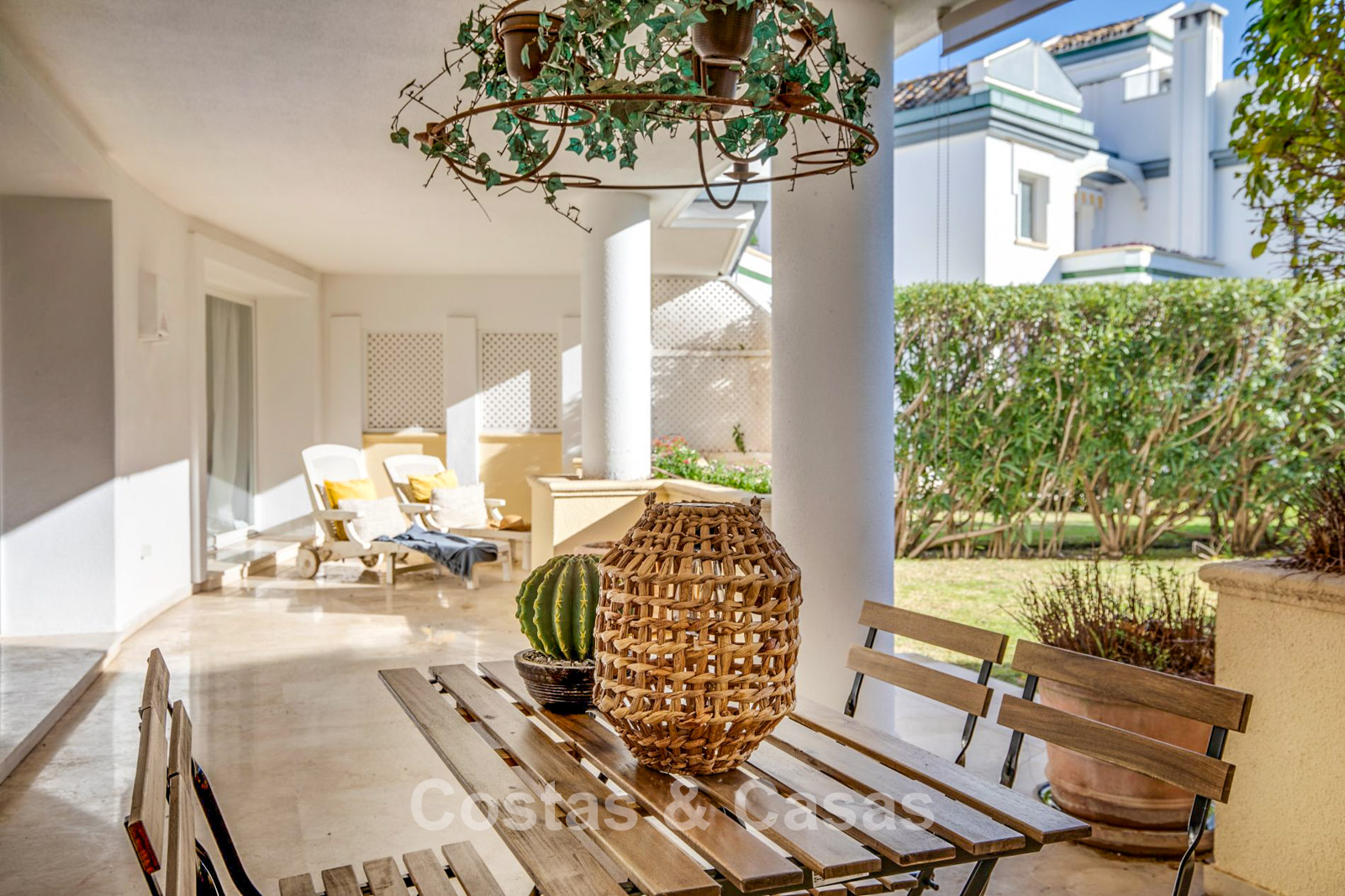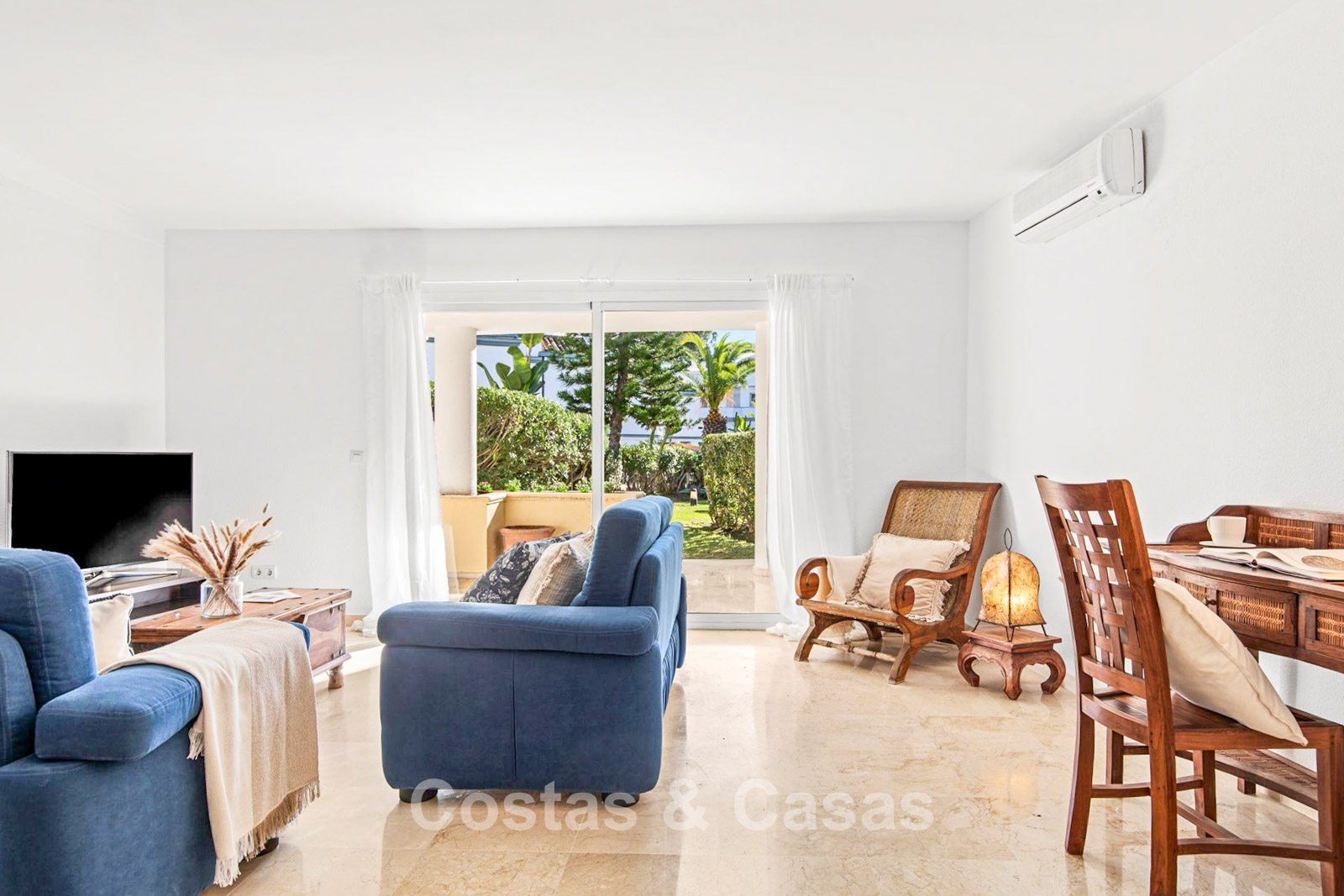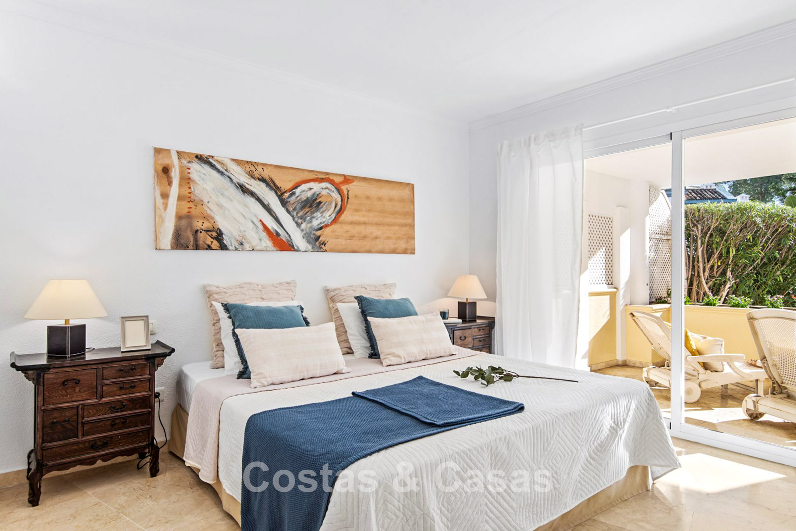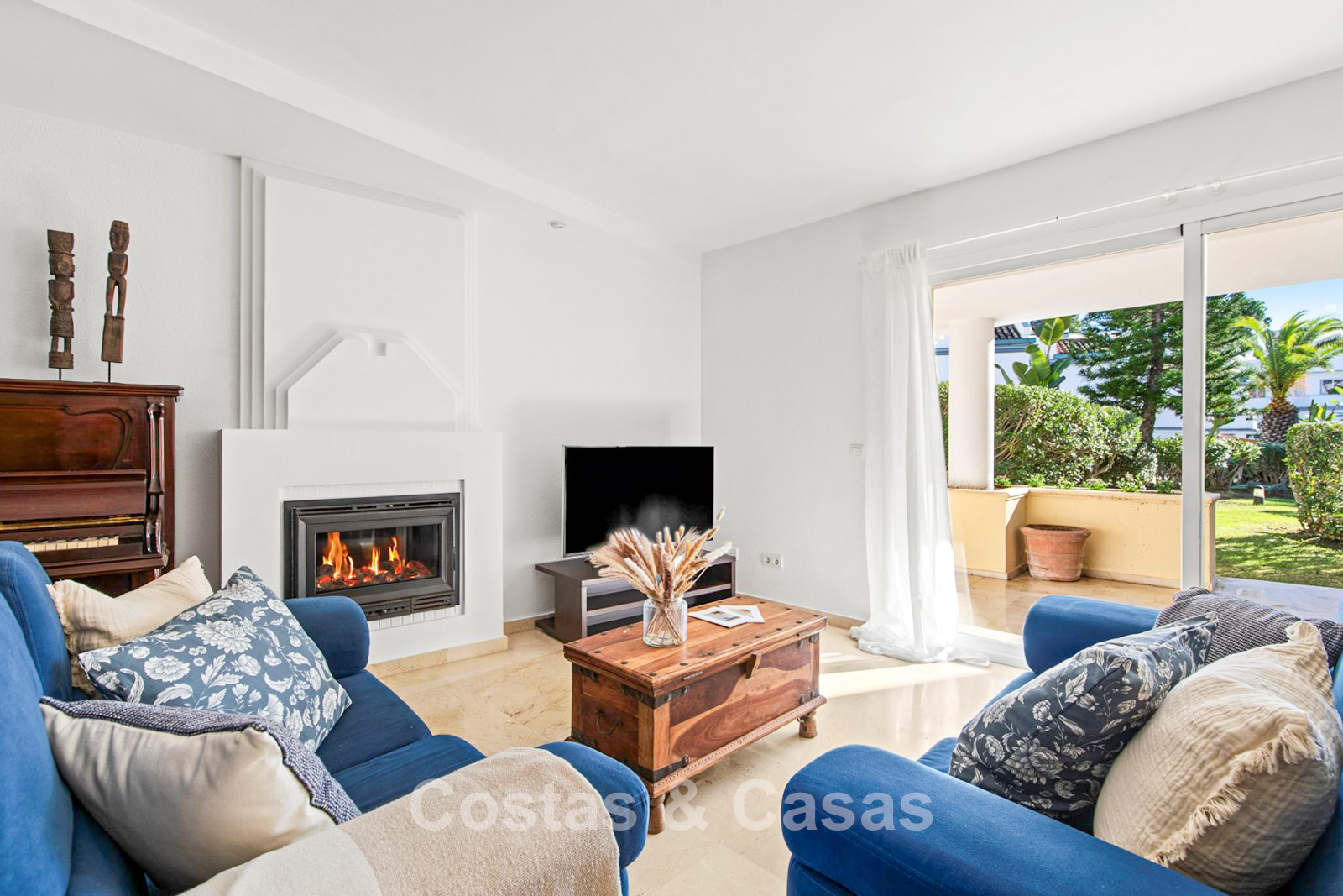 Spacieux appartement en rez-de-chaussée situé dans un complexe balnéaire très prisé. Le bien offre un excellent potentiel de modernisation réfléchie, permettant de l’adapter aux standards contemporains de confort et de design et d’augmenter considérablement sa valeur. Exposition sud. Séjour lumineux avec salon TV et espace repas intégré. L’intérieur s’ouvre harmonieusement sur une grande terrasse et un jardin à usage privé, créant une connexion naturelle entre les espaces intérieurs et extérieurs. Cuisine indépendante entièrement équipée avec une fenêtre donnant sur le séjour. 3 chambres, 3 salles de bains complètes et une toilette.