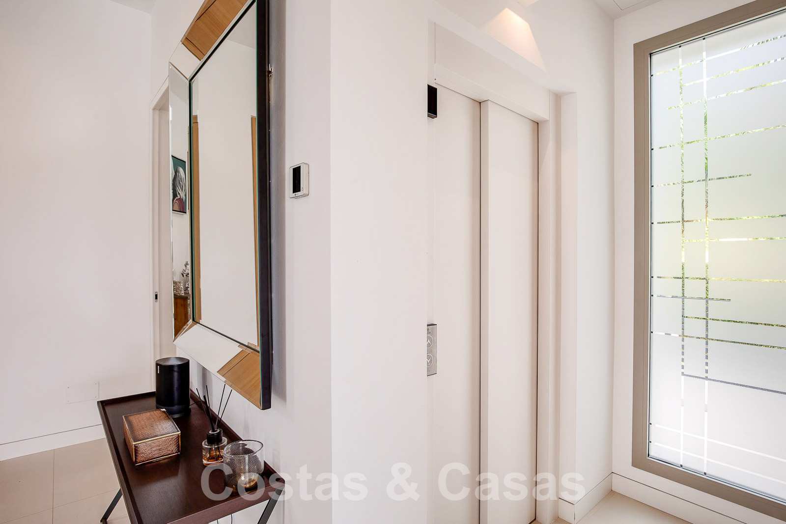 Ascenseur. Système domotique Lutron. Climatisation Daikin. Chauffage au sol. Cheminée. Balustrades en verre. Armoires encastrées. Fenêtres coulissantes hautes avec cadres encastrés. Appareils Gaggenau dans la cuisine. Auvents sur la terrasse. Éclairage extérieur.