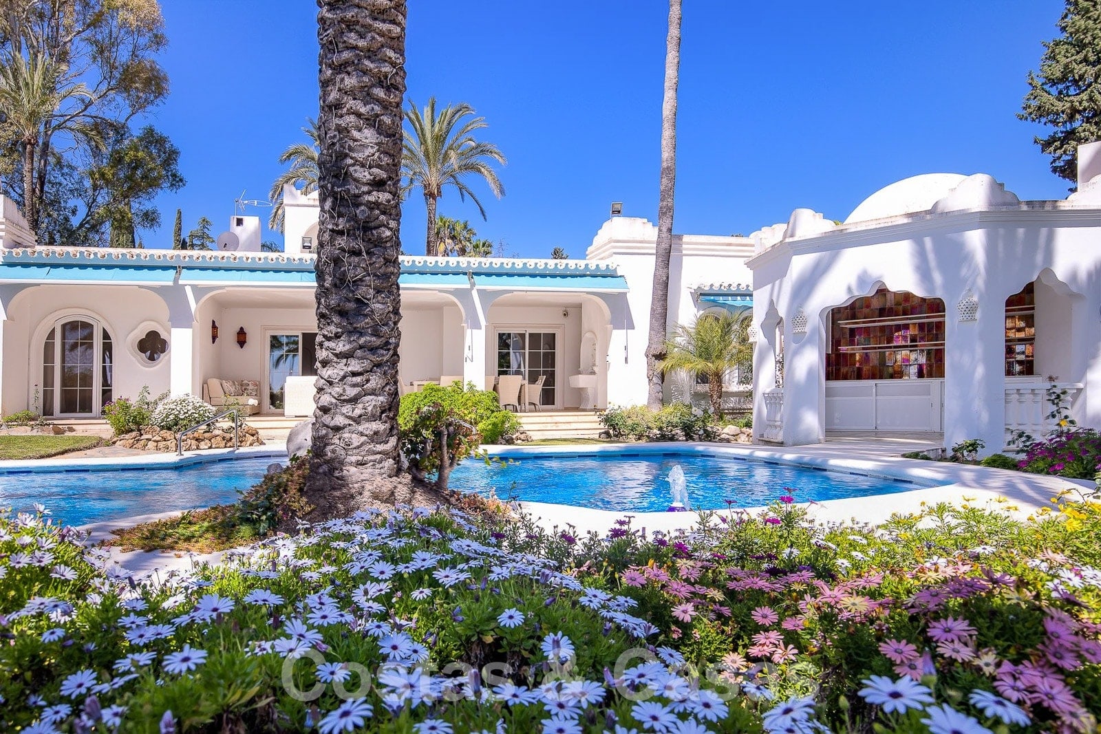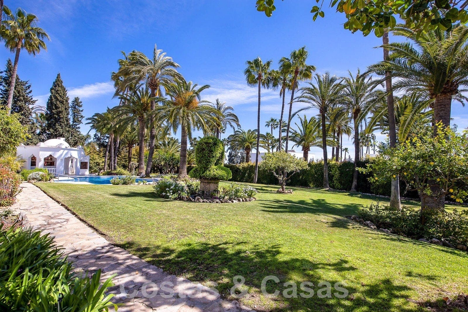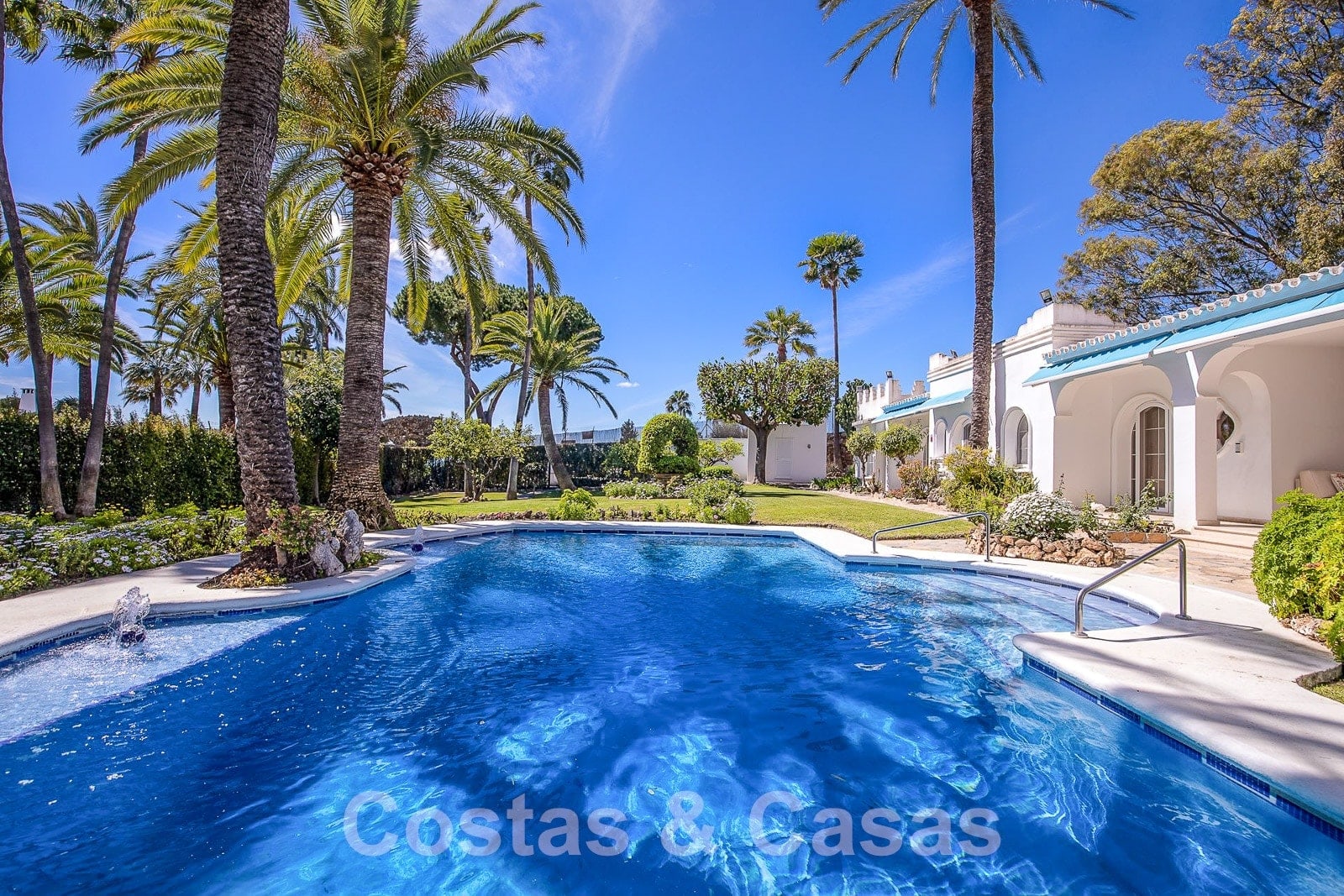 Villa individuelle de plain-pied entourée de terrasses, de patios et de beaux jardins.