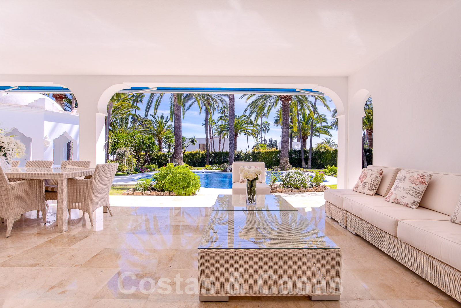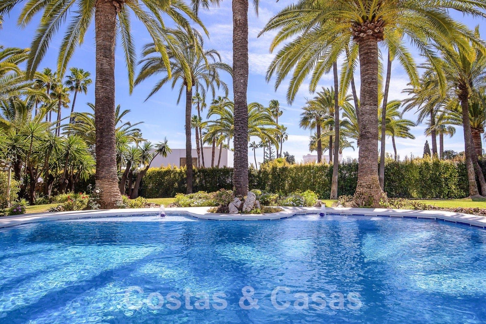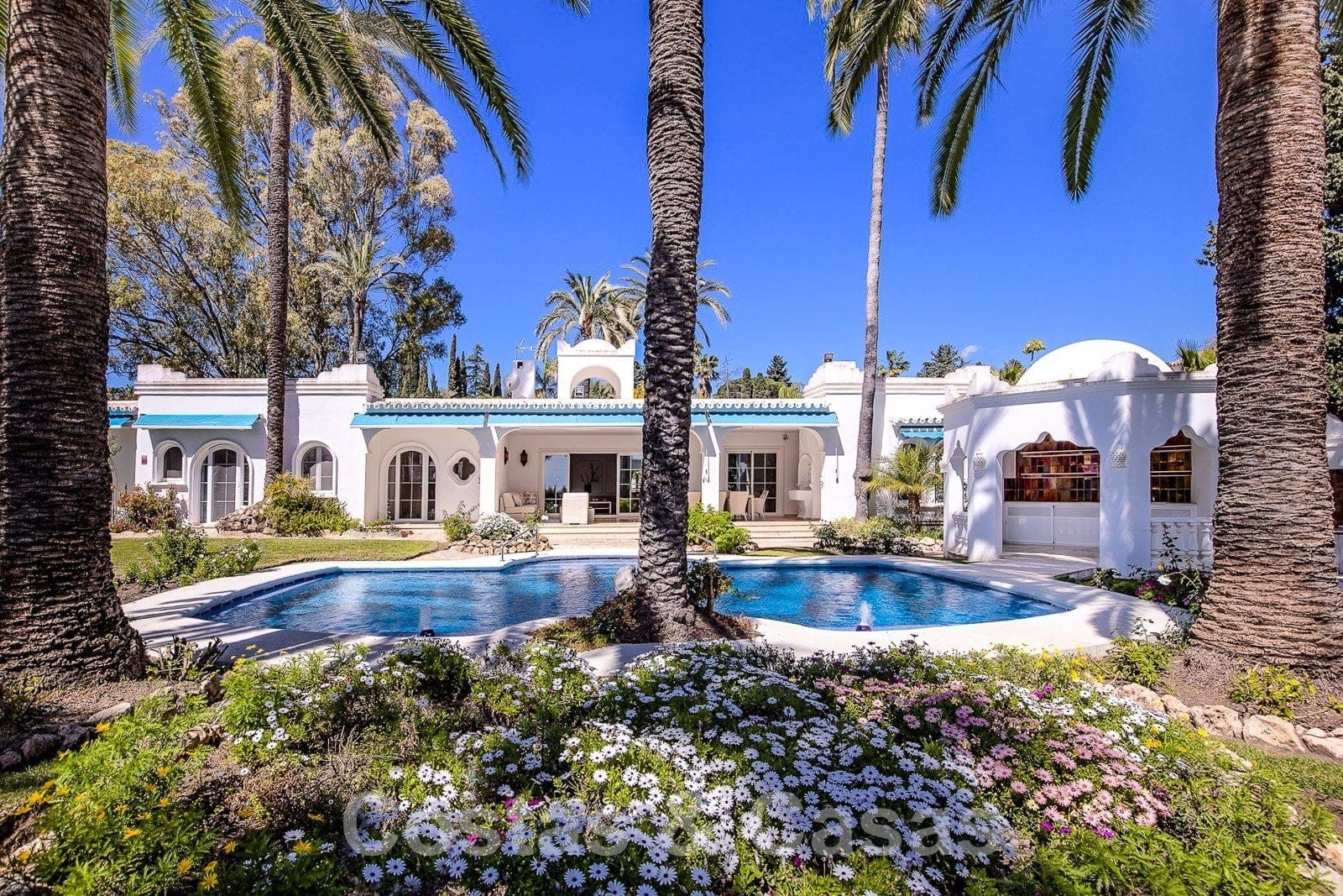 Villa individuelle de plain-pied entourée de terrasses, de patios et de beaux jardins.