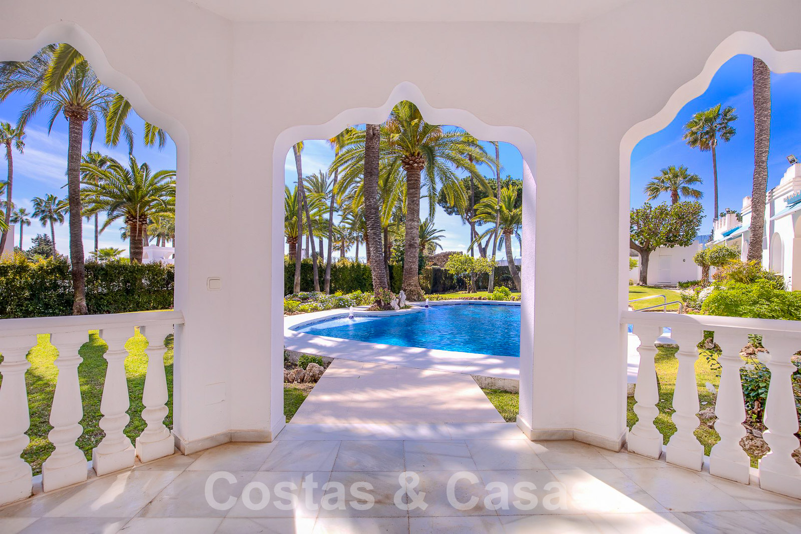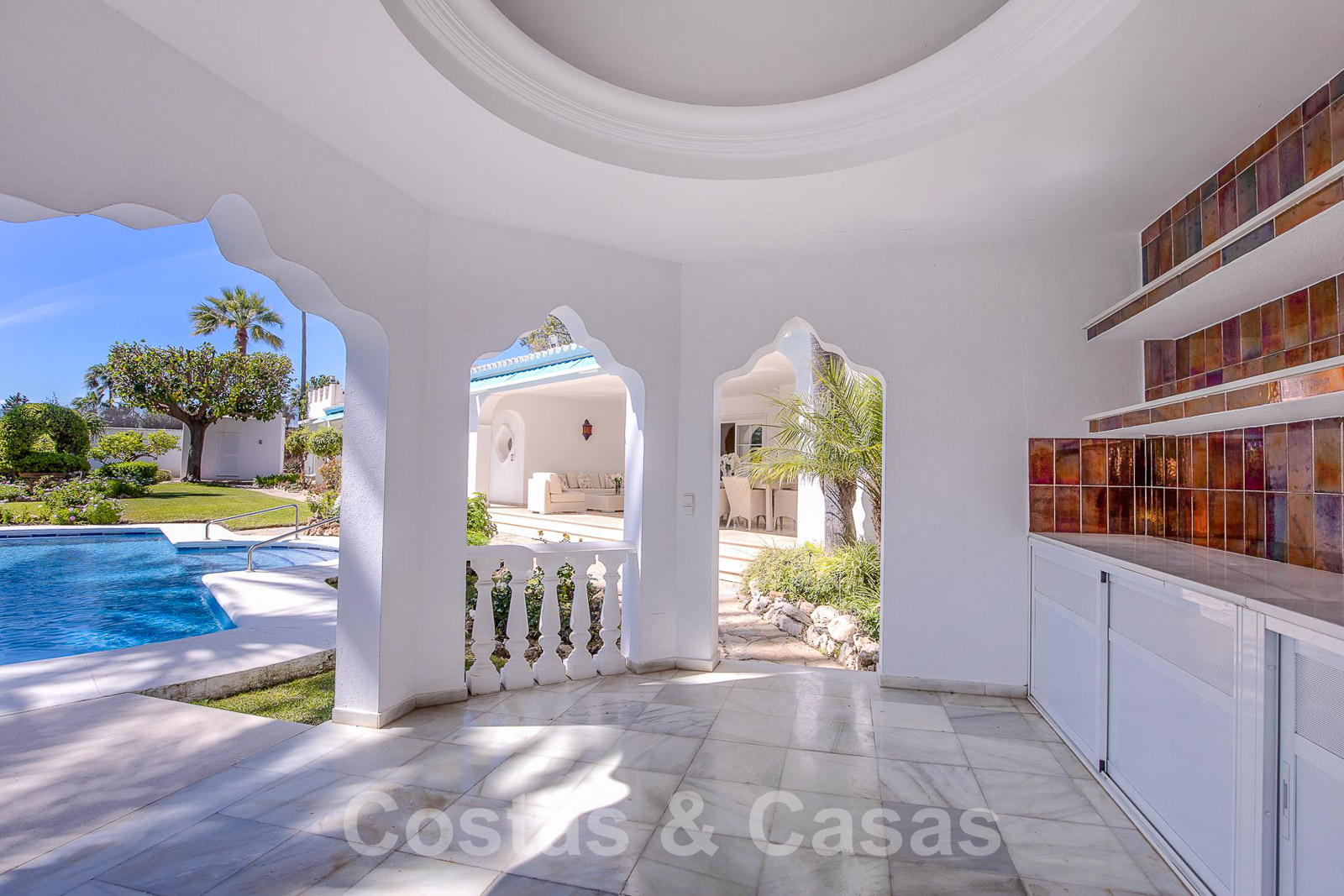 Pool house adjacent conçu avec des détails mauresques et équipé d'une cuisine extérieure.