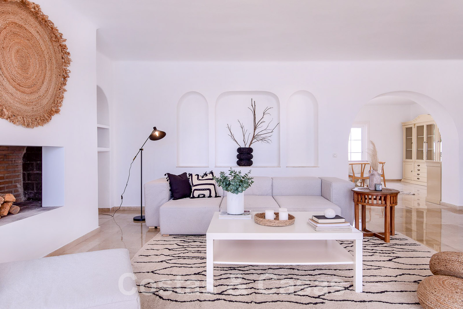 Séjour lumineux avec cheminée traditionnelle.