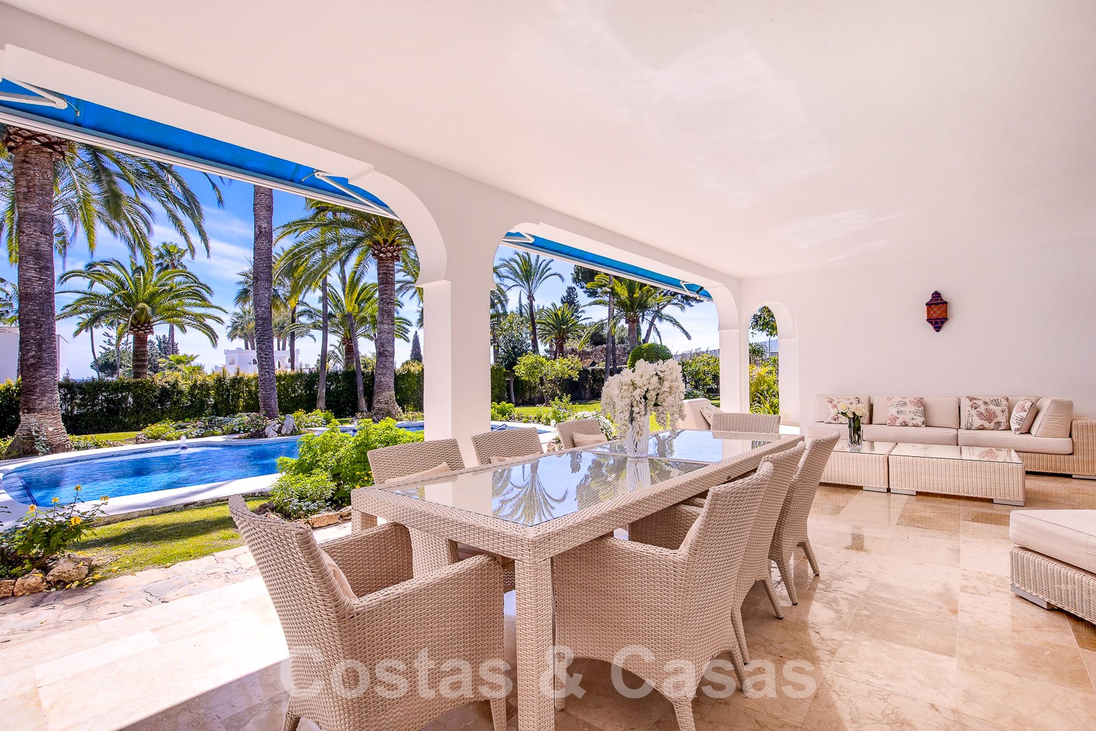 Une grande terrasse couverte avec salon et table à manger.