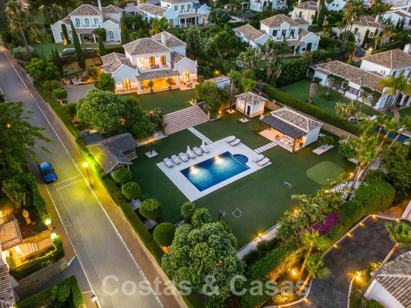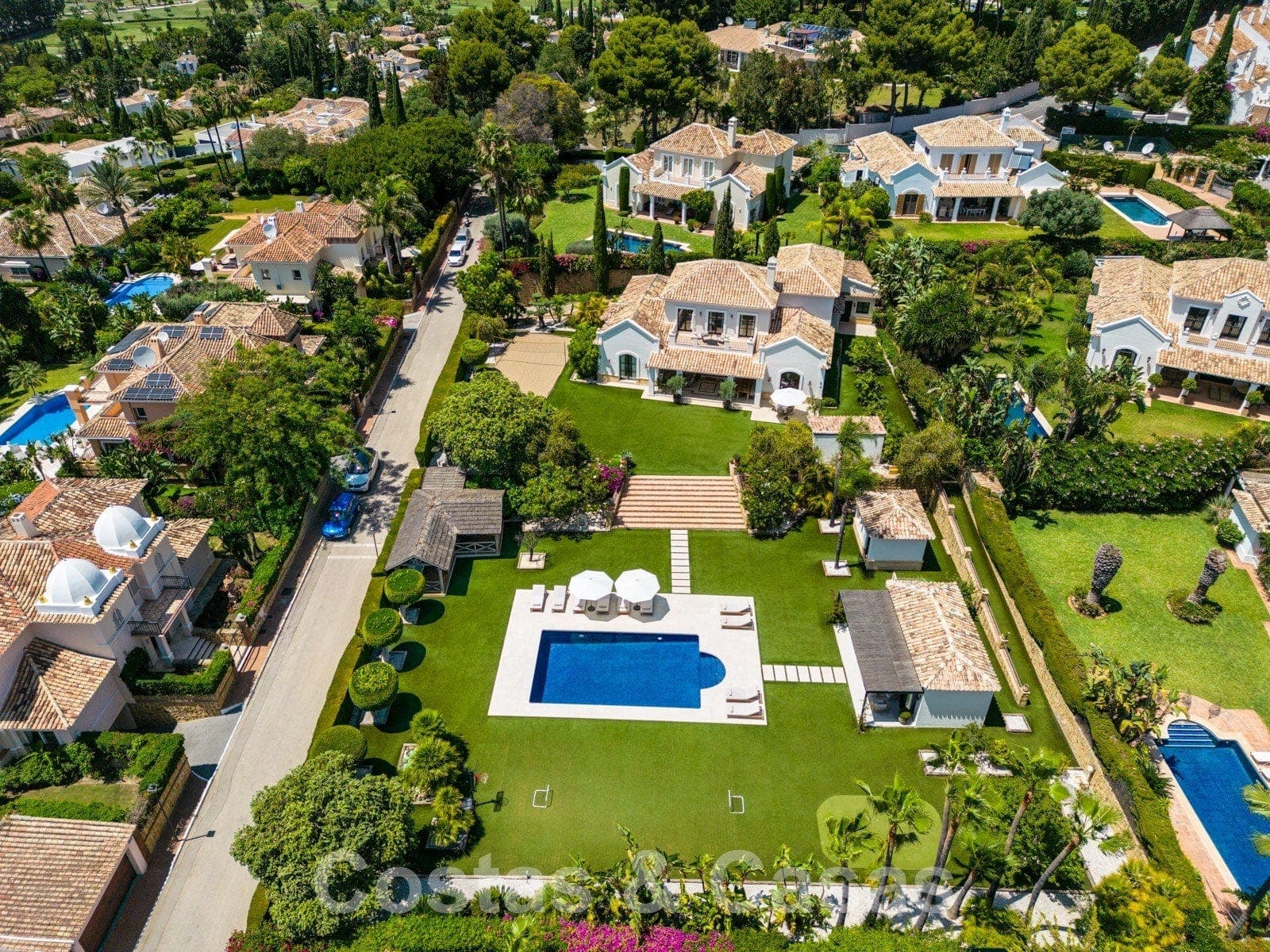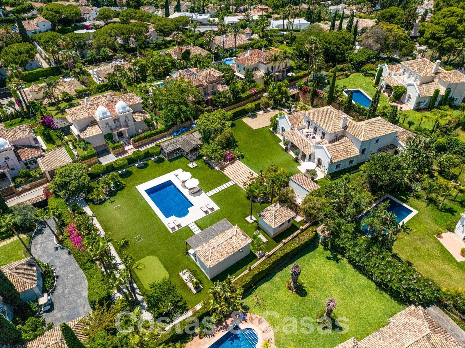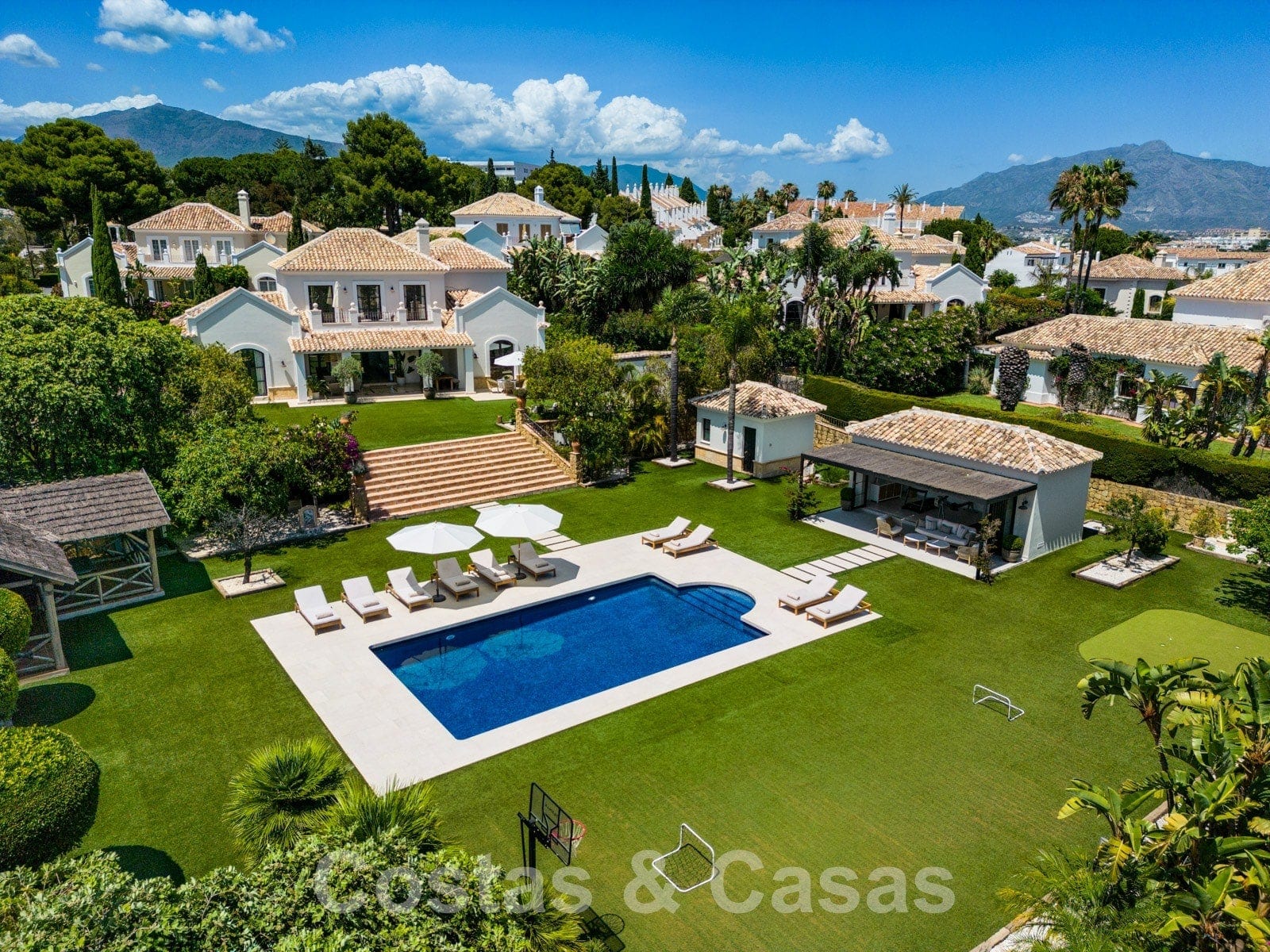 Vaste terrain entièrement clôturé. Orientation sud. Jardin paysager soigné avec beaucoup de pelouse, de la verdure tropicale et de nombreuses installations de loisirs créant une oasis de sérénité pour les amateurs de plein air. Terrasses accueillantes et terrain de volley-ball. Terrain de basket et "putting green". Une cuisine extérieure avec barbecue et four à pizza intégré, équipée d'un espace "repas en plein air". Un large escalier central descend au niveau inférieur du jardin. Grande piscine privée, entourée d'une terrasse. Un pool house peut être aménagé librement. Il sert actuellement de salle de sport. Grâce à la verdure qui l'entoure, la villa jouit d'une tranquillité et d'une intimité qui permettent de profiter pleinement du style de vie méditerranéen tout au long de l'année.